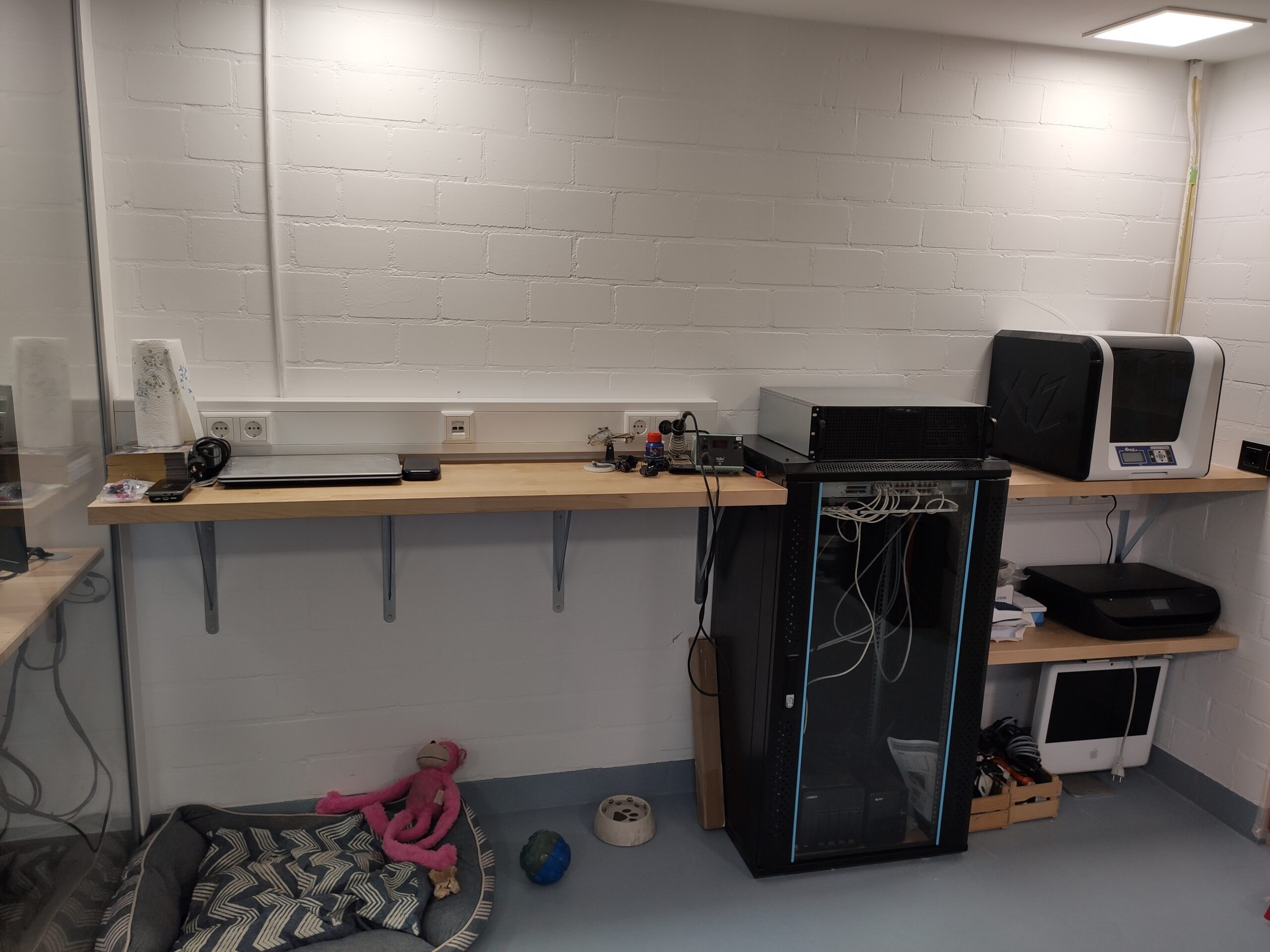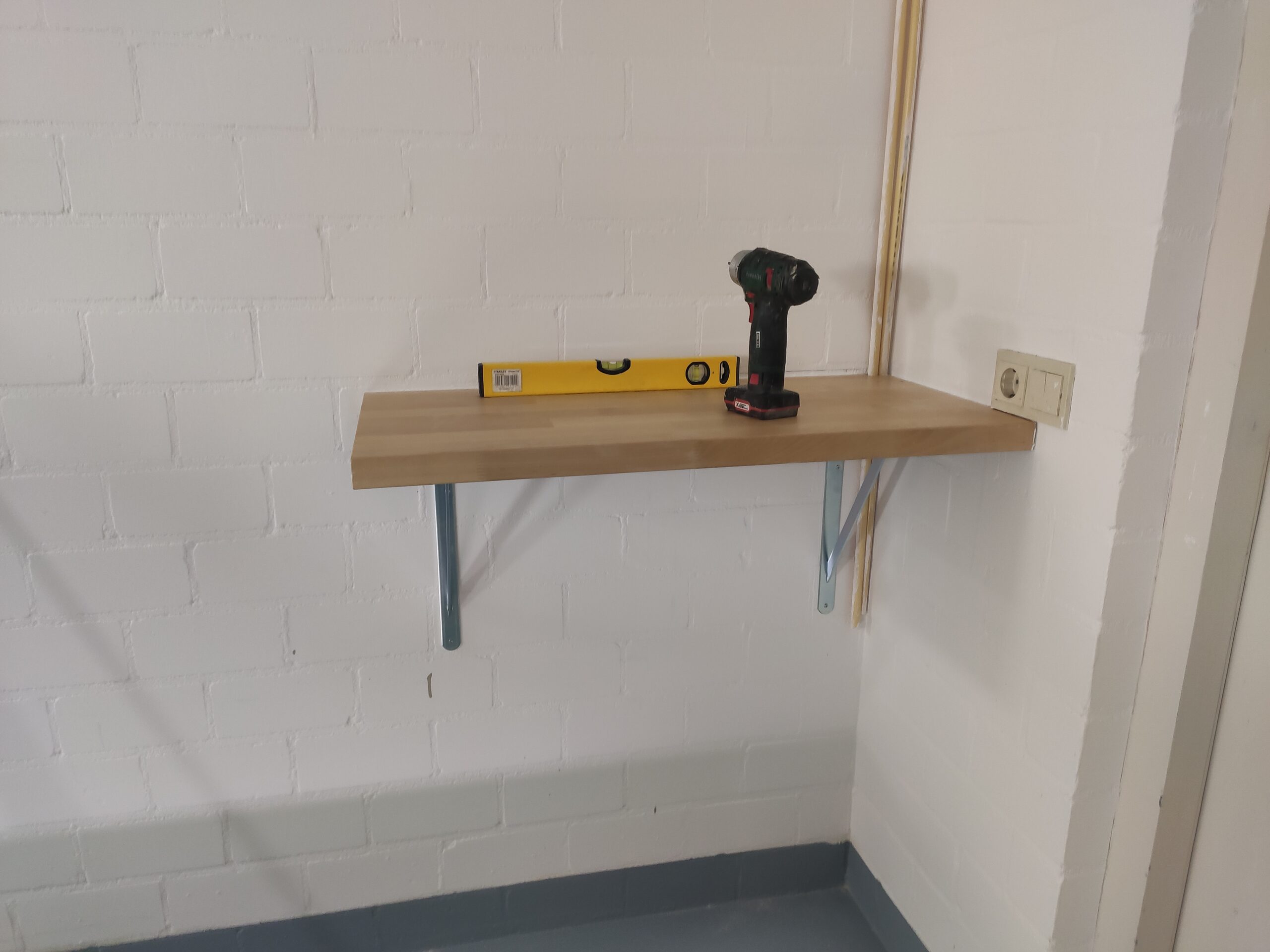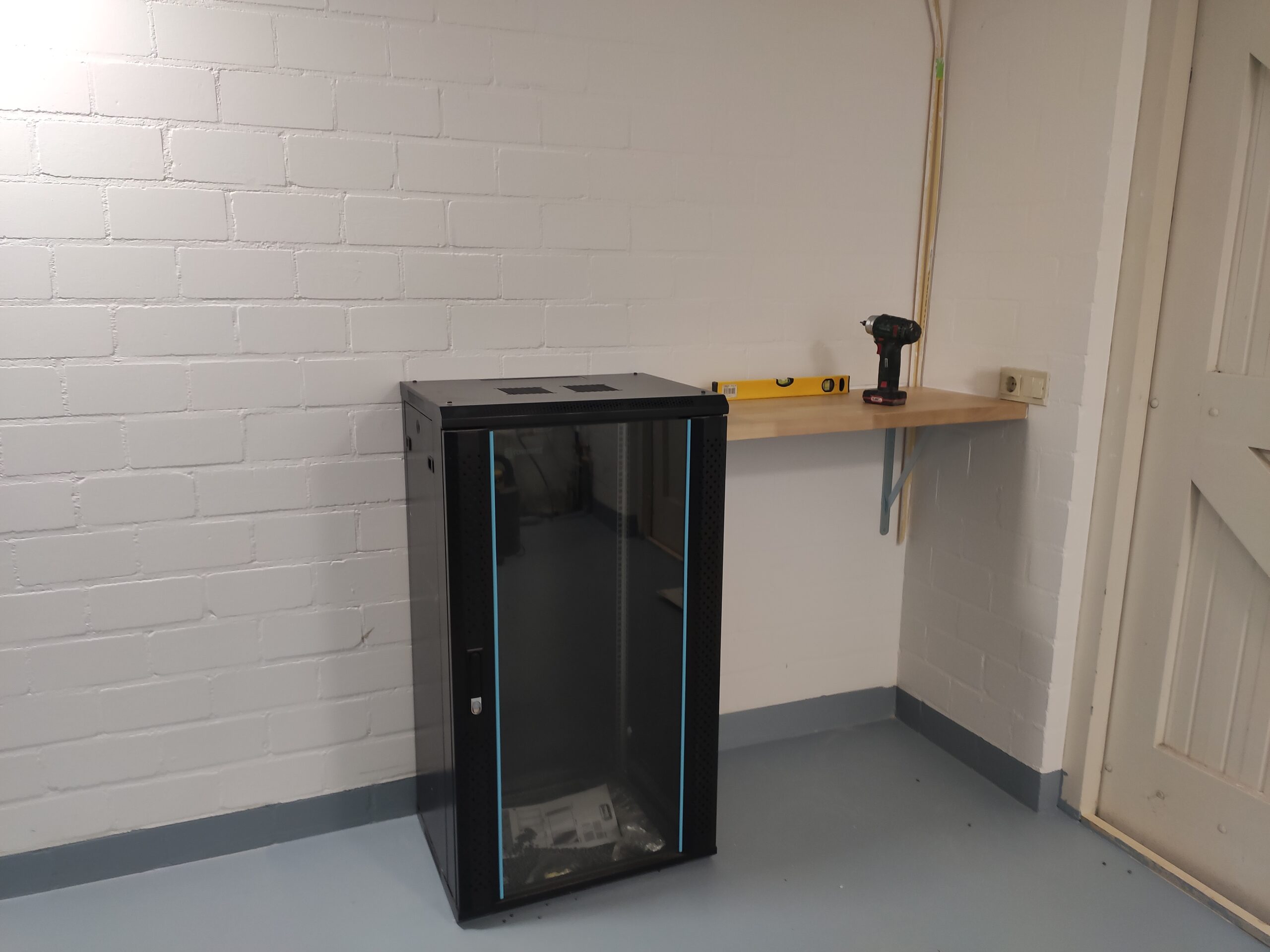 Nadat de vloer geschilderd is en de wanden in de werkplaats ook een lik nieuwe verf hebben gekregen, is het eindelijk tijd om in te richten. Als eerst wordt een schap voor de 3D printers geplaatst. Deze is gemaakt van een restant van het aanrechtblad in het kantoor. Hiernaast komt de KingTech server. Door zijn hoogte kan hij helaas niet compleet in de hoek geplaatst worden, Dit zou de lichtschakelaar en het stopcontact blokkeren.