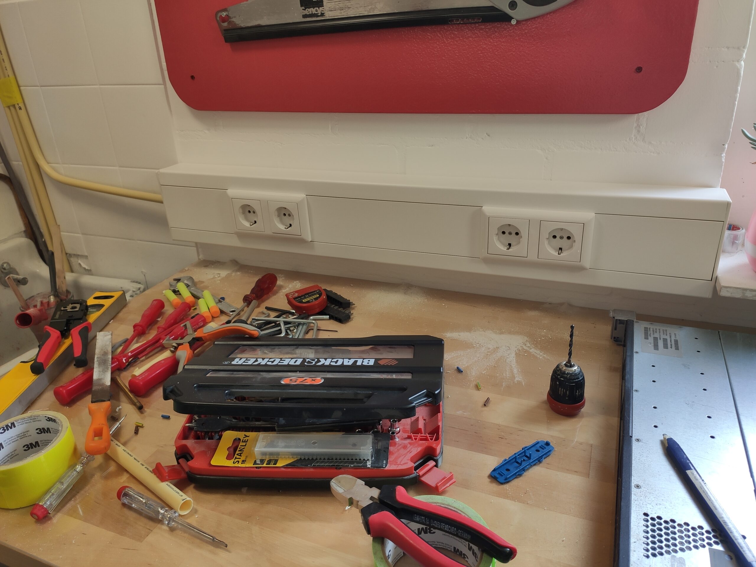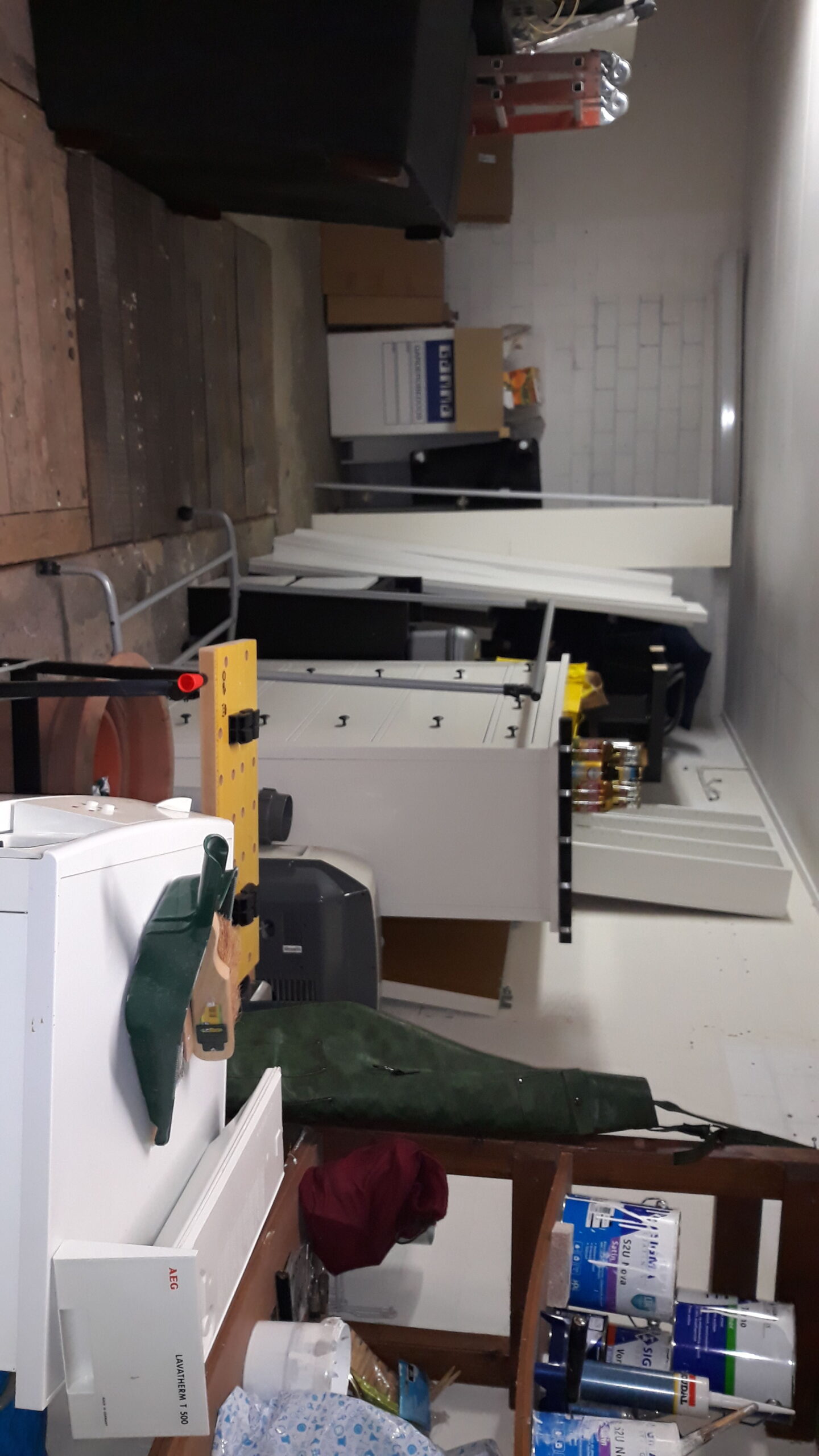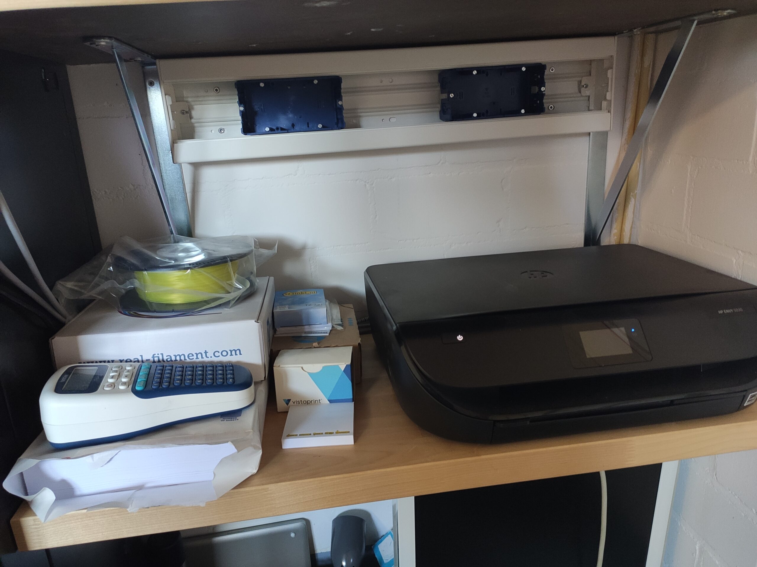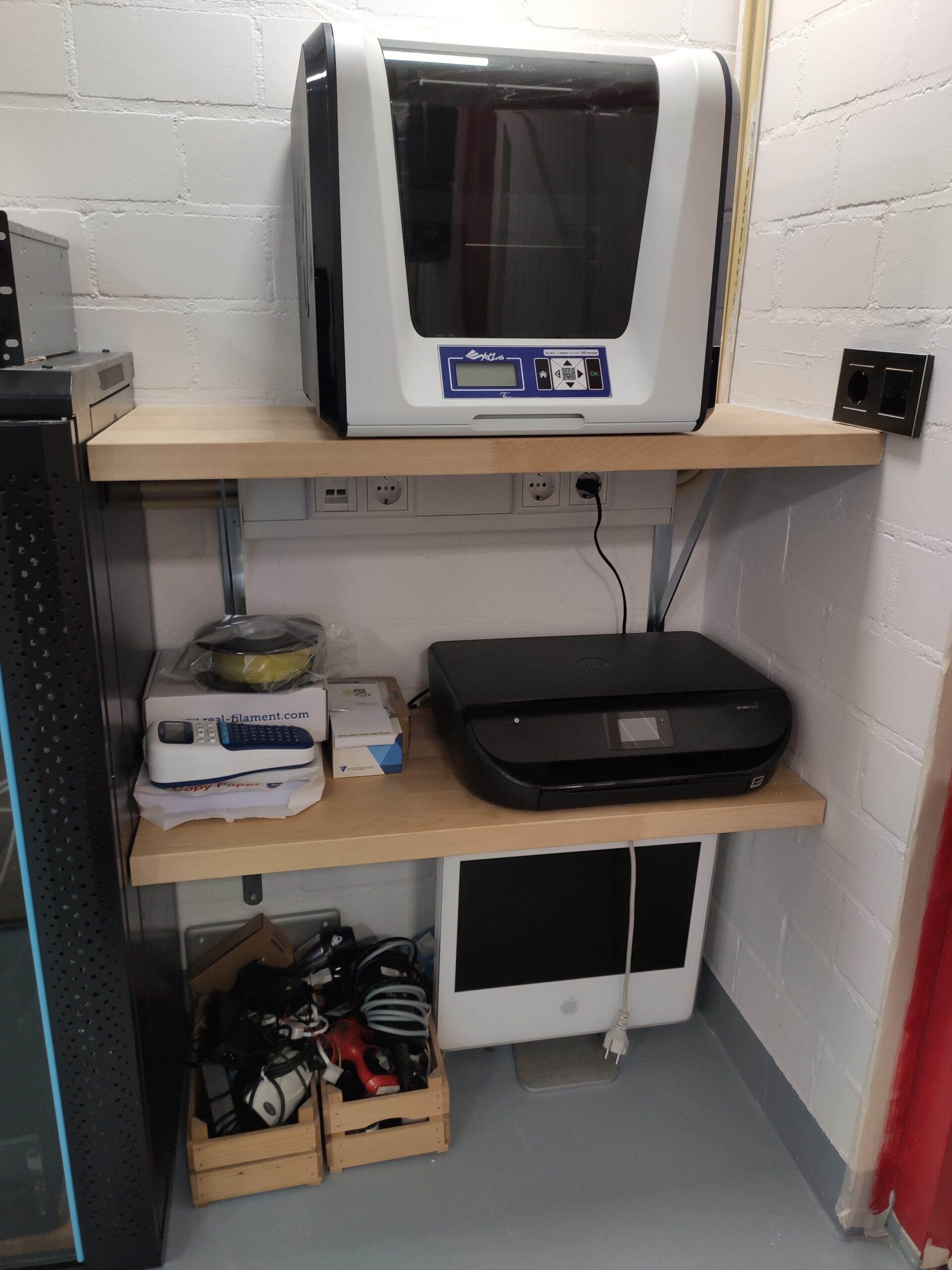 Nadat de vloer geschilderd is en de wanden in de werkplaats ook een lik nieuwe verf hebben gekregen, is het eindelijk tijd om in te richten. Als eerst wordt een schap voor de 3D printers geplaatst. Deze is gemaakt van een restant van het aanrechtblad in het kantoor. Hiernaast komt de KingTech server. Door zijn hoogte kan hij helaas niet compleet in de hoek geplaatst worden, Dit zou de lichtschakelaar en het stopcontact blokkeren.