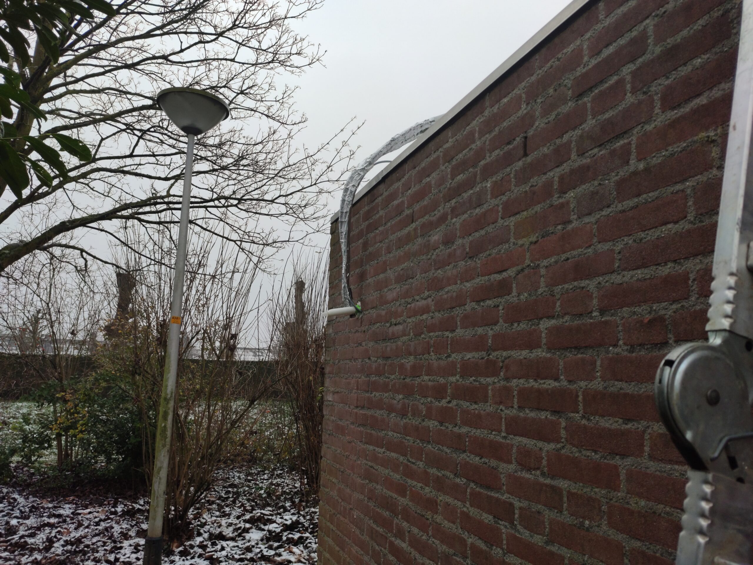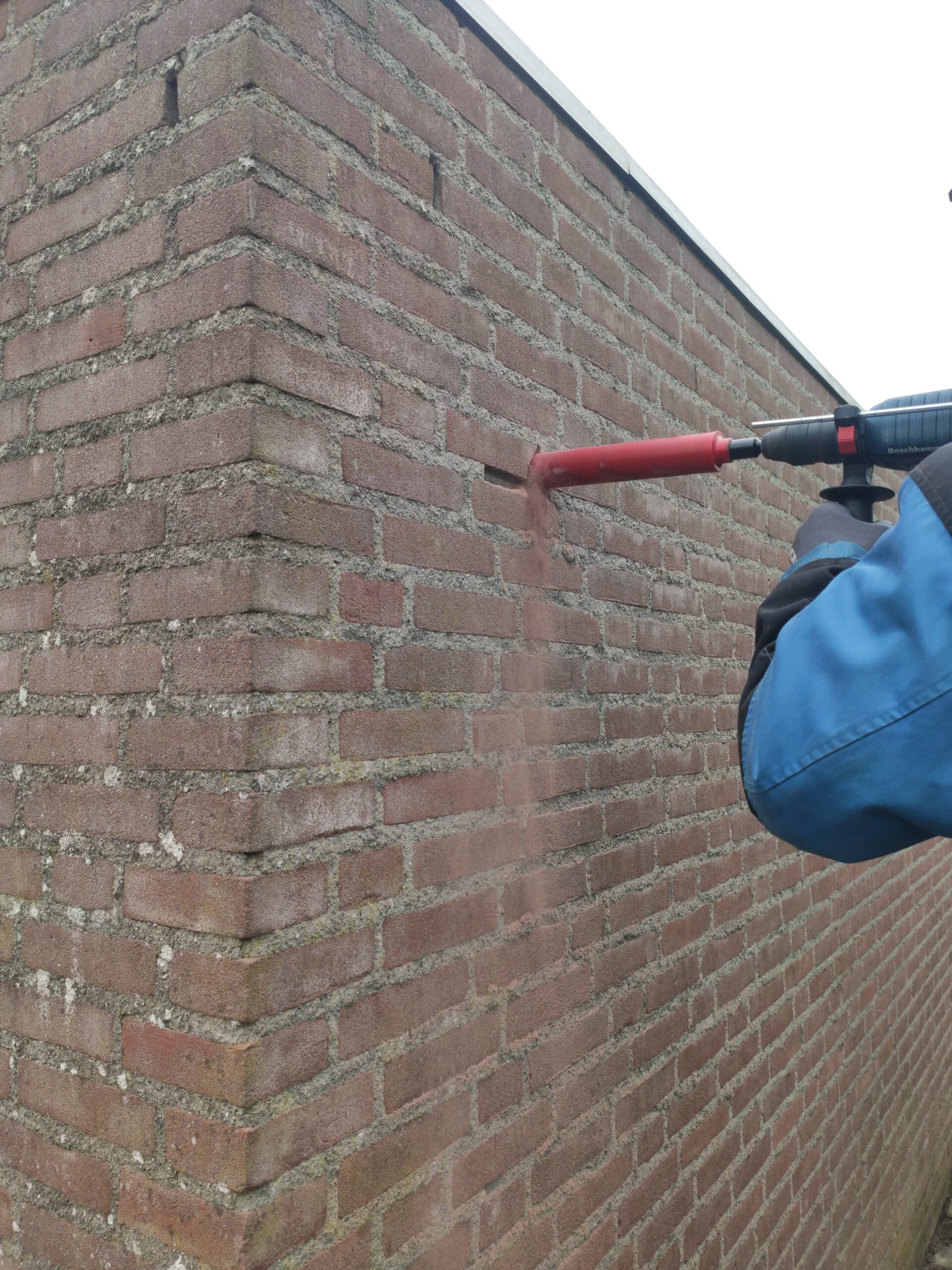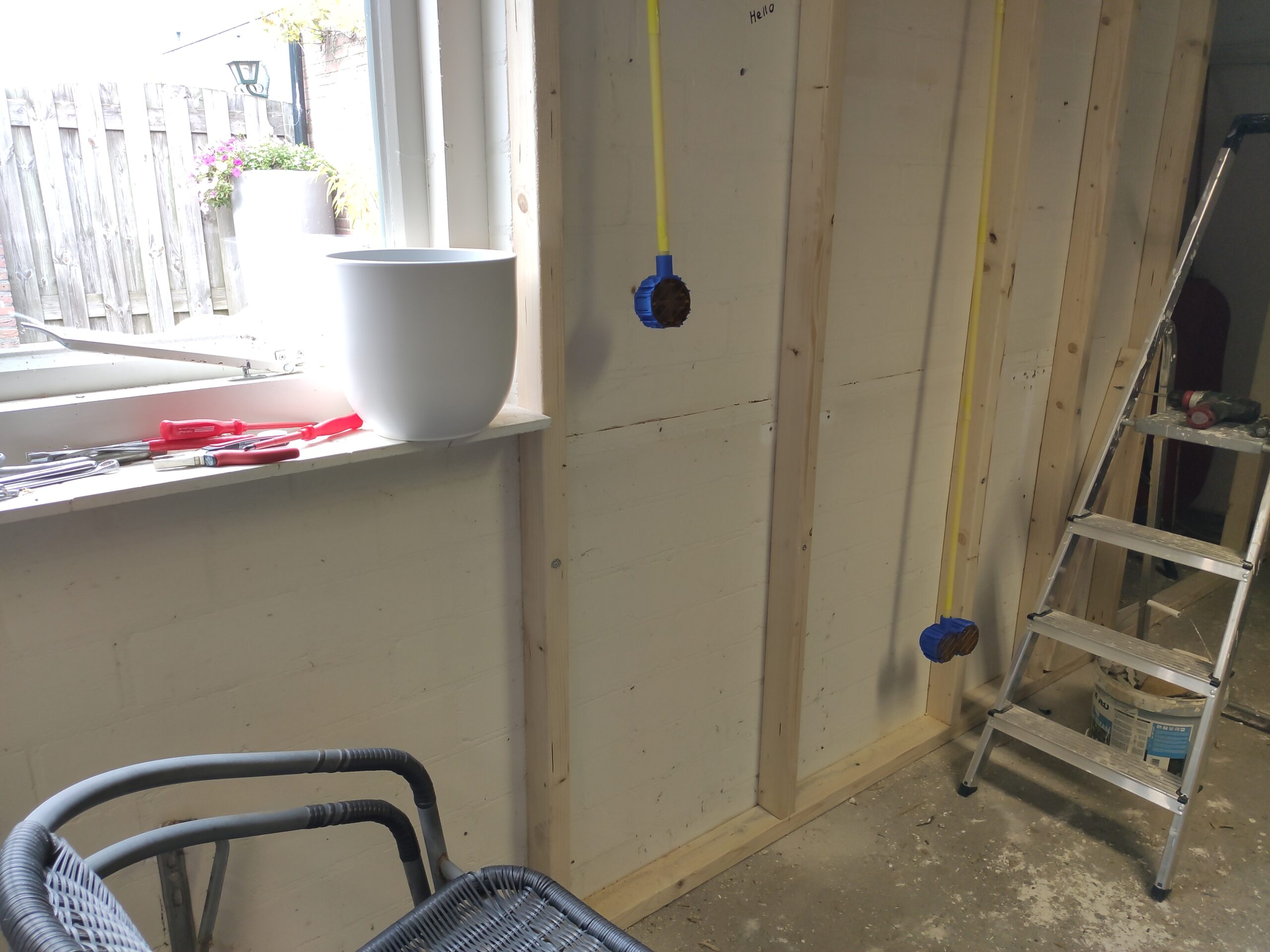 Omdat de muur uit 3 lagen bestaat (buitenmuur, spouwmuur en gipswand) kunnen de verschillende buizen en kabels vast komen te zitten in de ruimtes tussen de muren. Gijs taped alle buizen aan elkaar om ze zo als een geheel door het gat te kunnen voeren. Het gat wordt vervolgens opgevuld met purschuim om tocht en vocht uit de muur te houden.