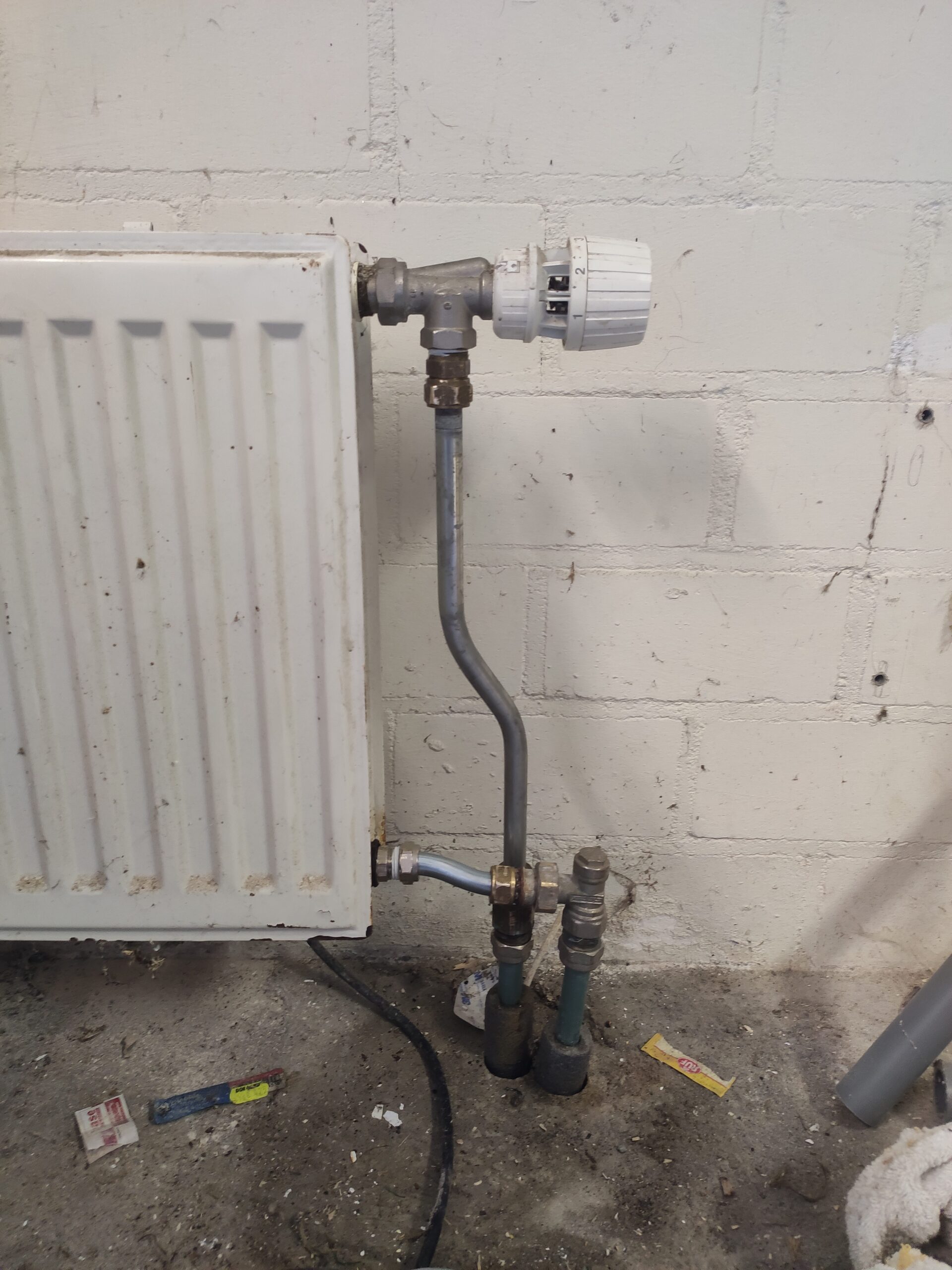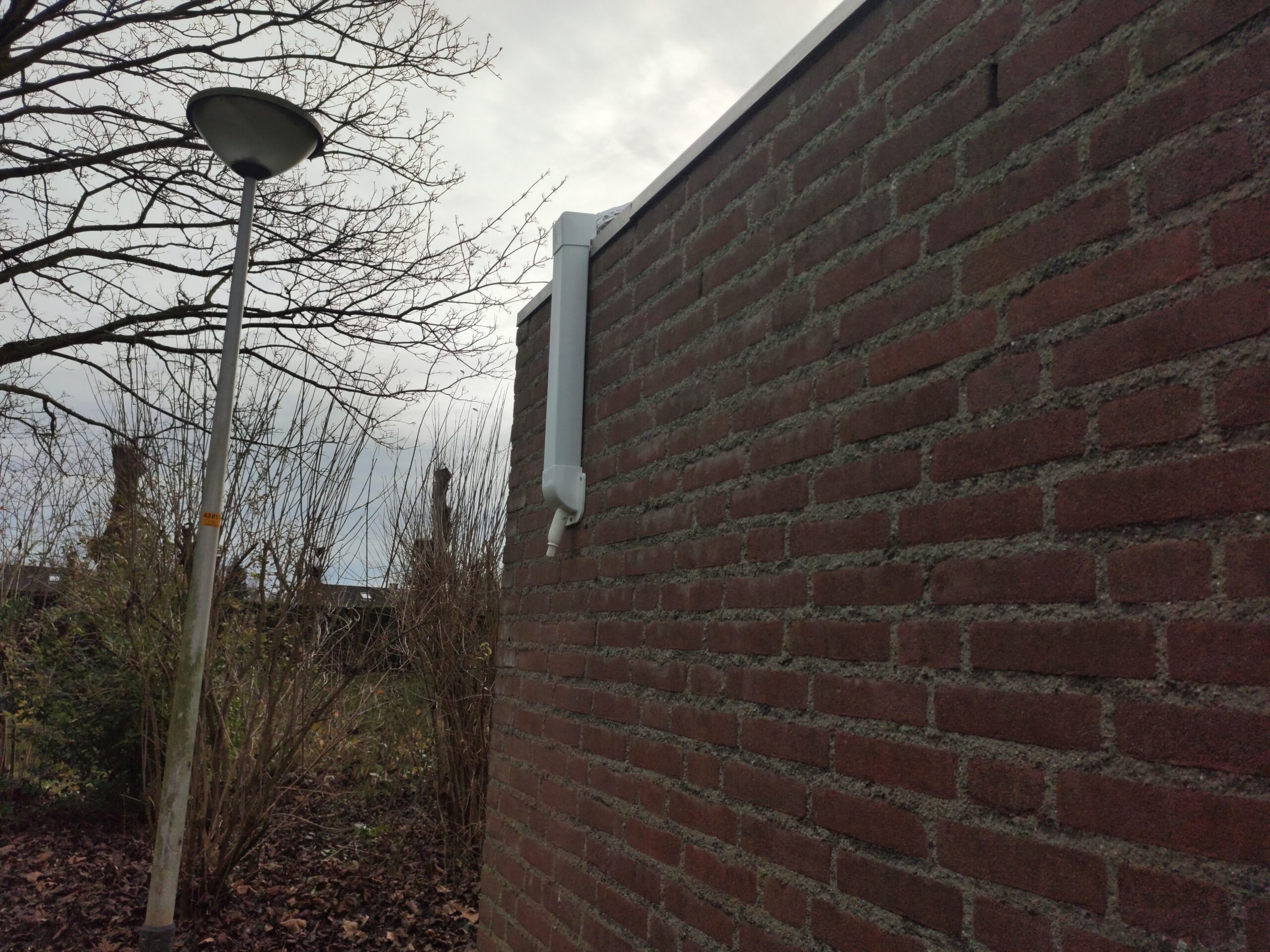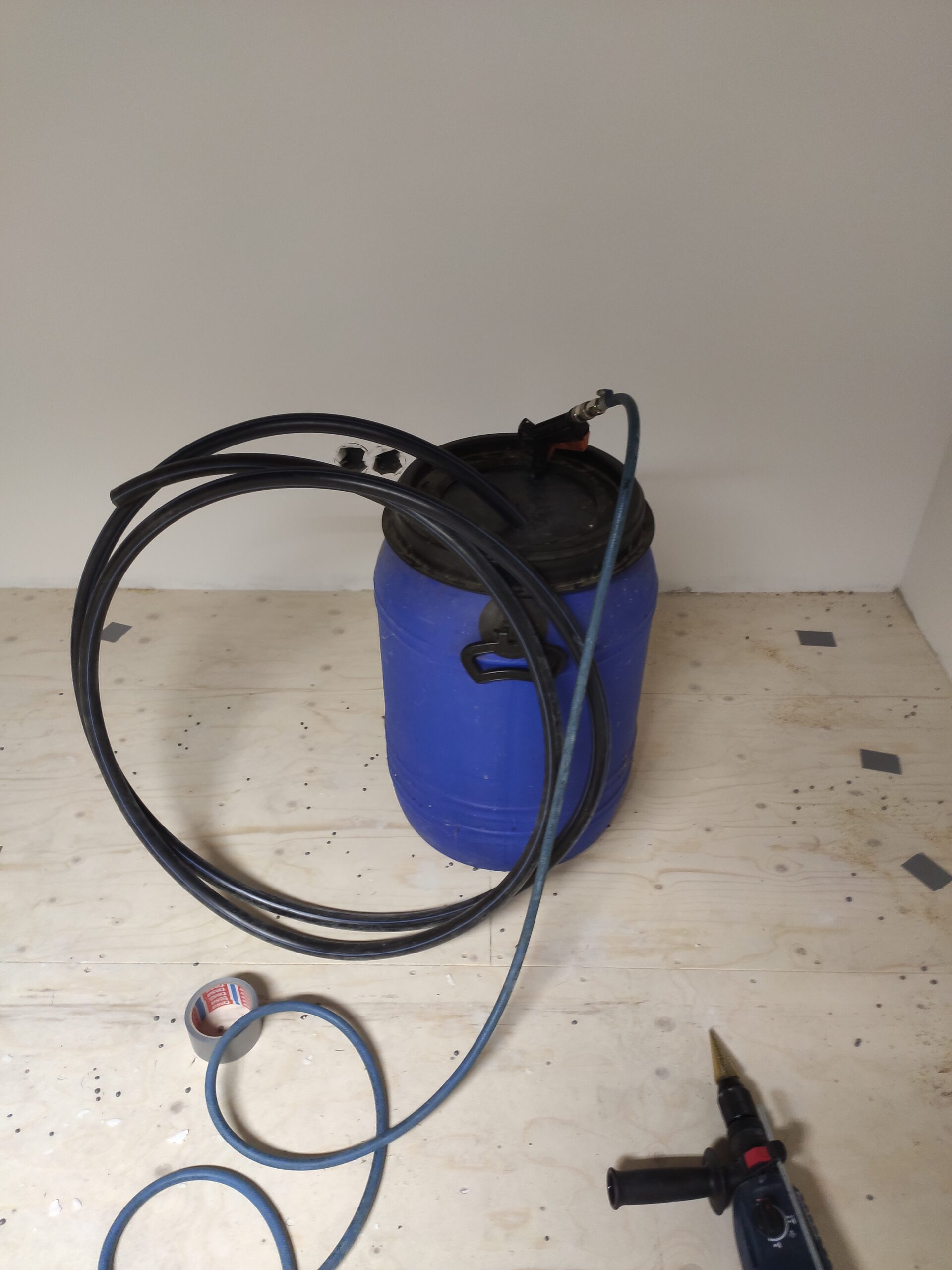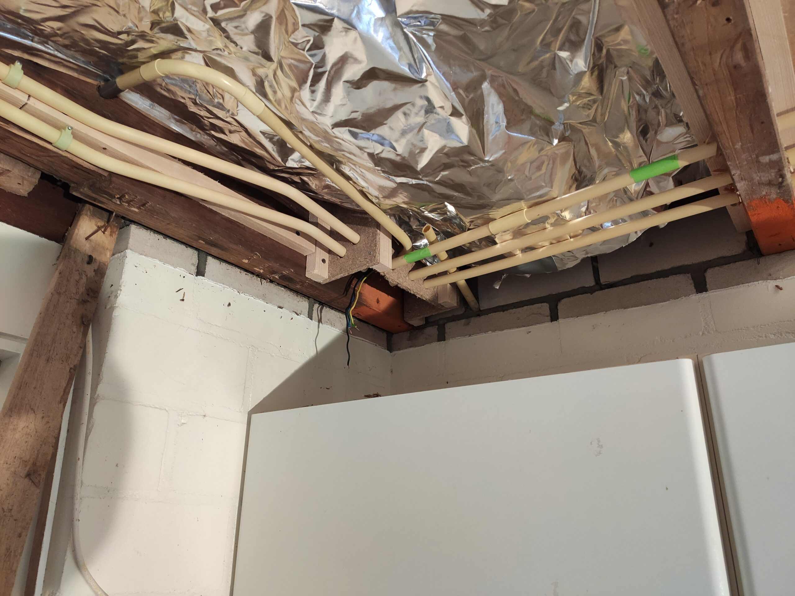 Omdat de muur uit 3 lagen bestaat (buitenmuur, spouwmuur en gipswand) kunnen de verschillende buizen en kabels vast komen te zitten in de ruimtes tussen de muren. Gijs taped alle buizen aan elkaar om ze zo als een geheel door het gat te kunnen voeren. Het gat wordt vervolgens opgevuld met purschuim om tocht en vocht uit de muur te houden.