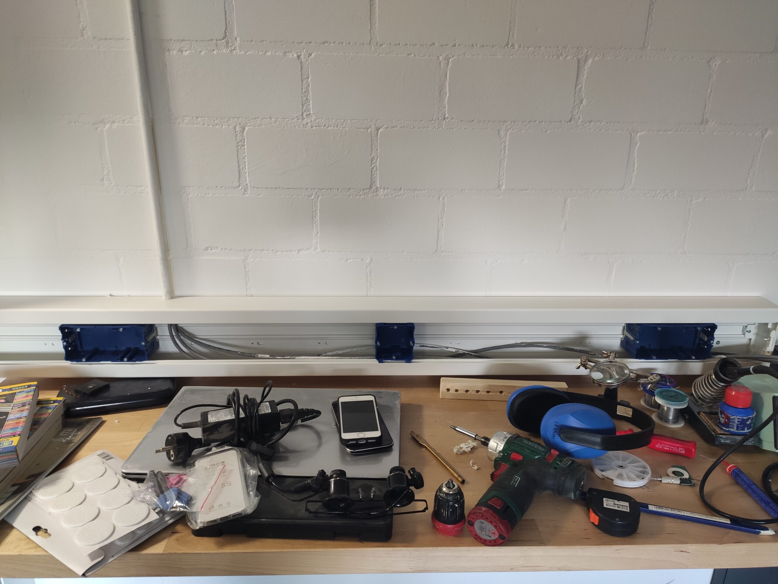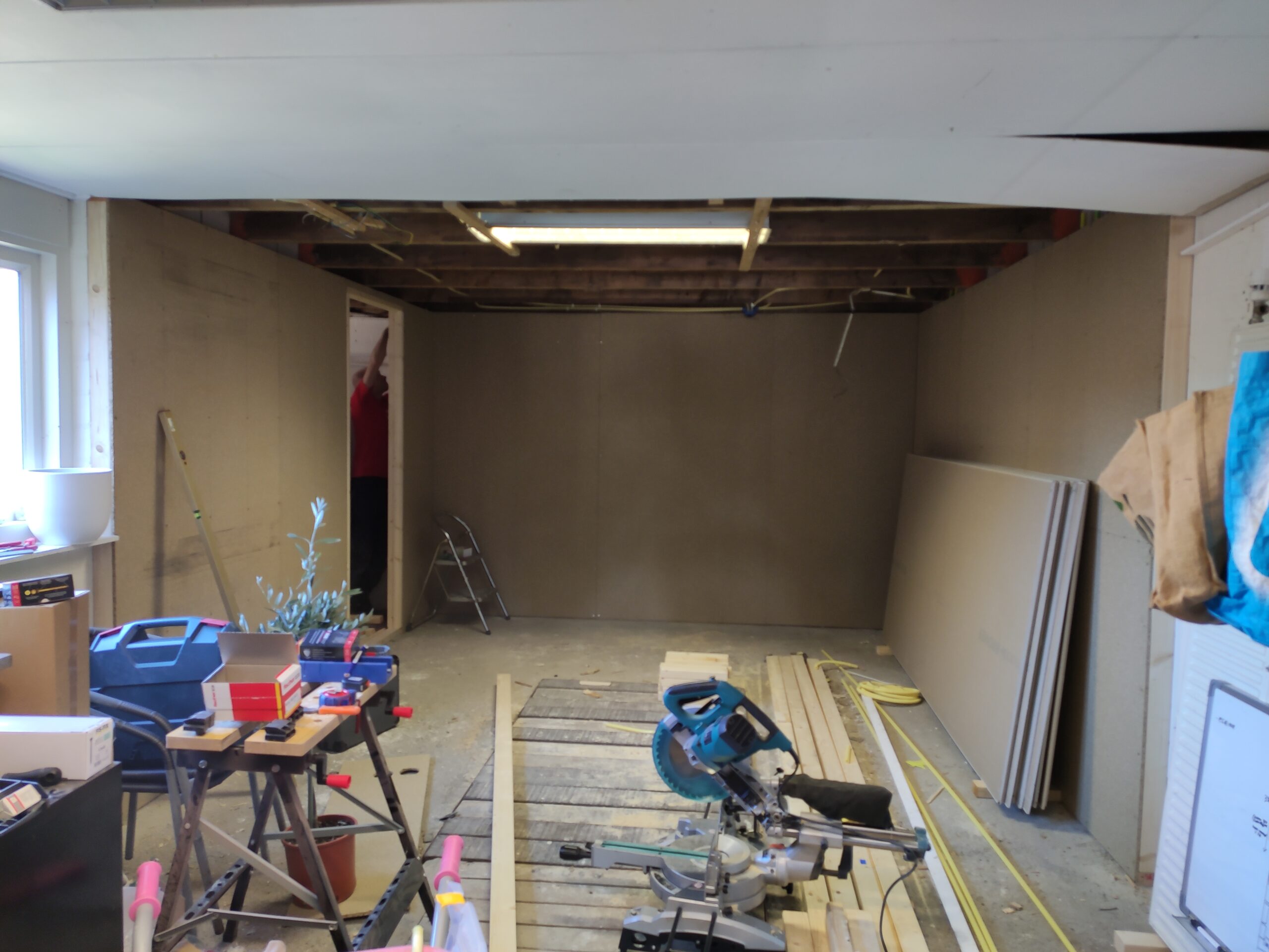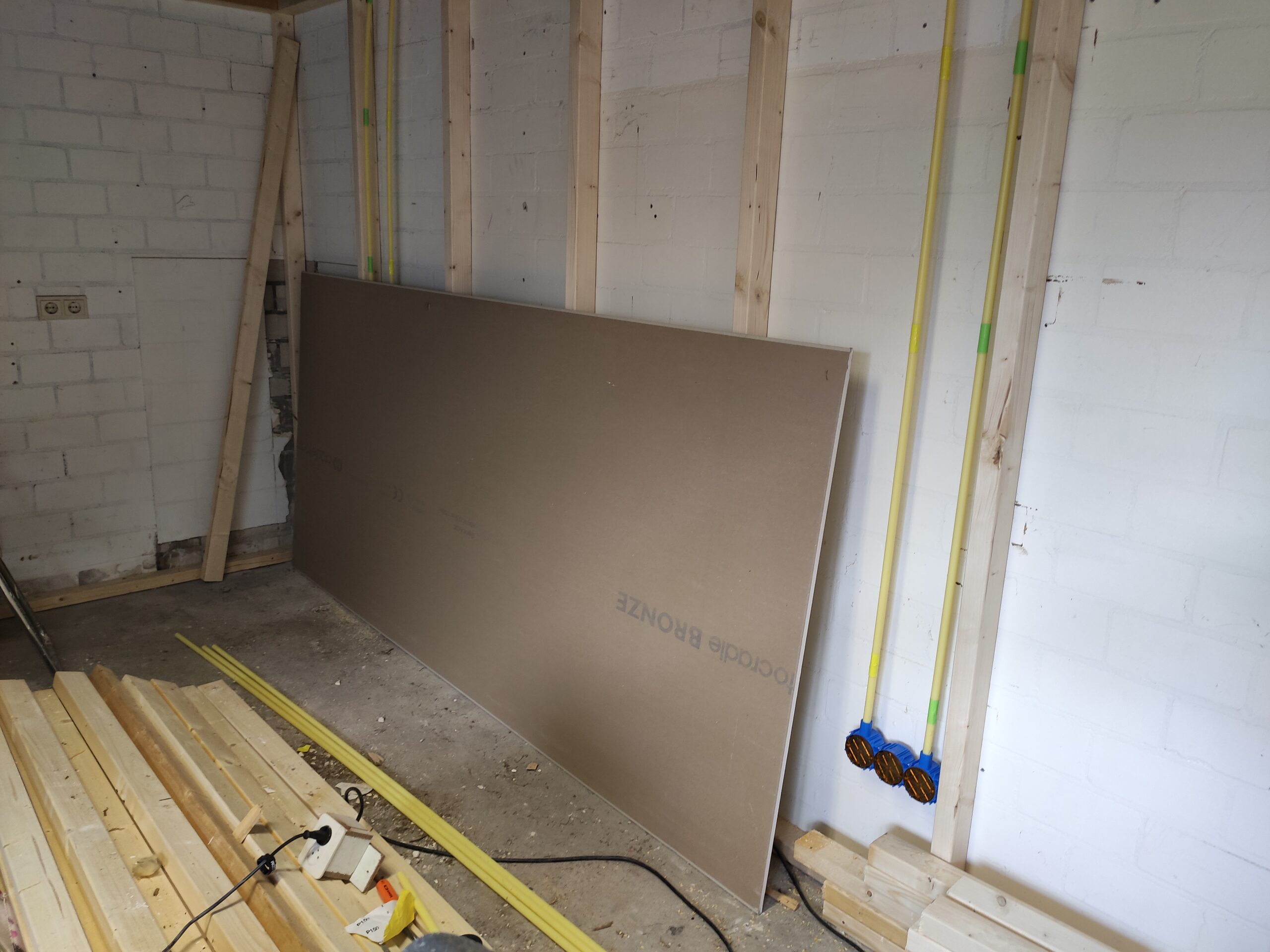 De wanddozen op deze foto’s hebben de uiteindelijke uitwerking niet gehaald, voor een professionele afwerking is gekozen hollewanddozen te gebruiken. Omdat een gipswand niet heel stevig is, en nog niet duidelijk was of er uiteindelijk dingen aan de wanden moesten komen hangen, is gekozen om het frame eerst met spaanplaten te bekleden. Hierdoor hebben de wanden wat meer body en kunnen in de toekomst eenvoudiger schappen en/of schilderijen geplaatst worden.