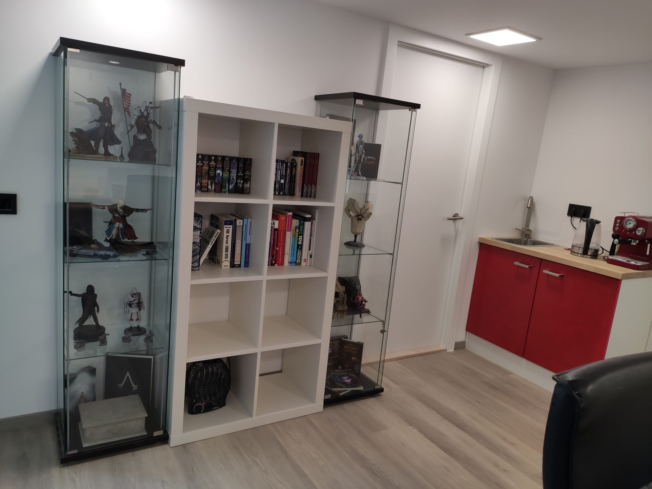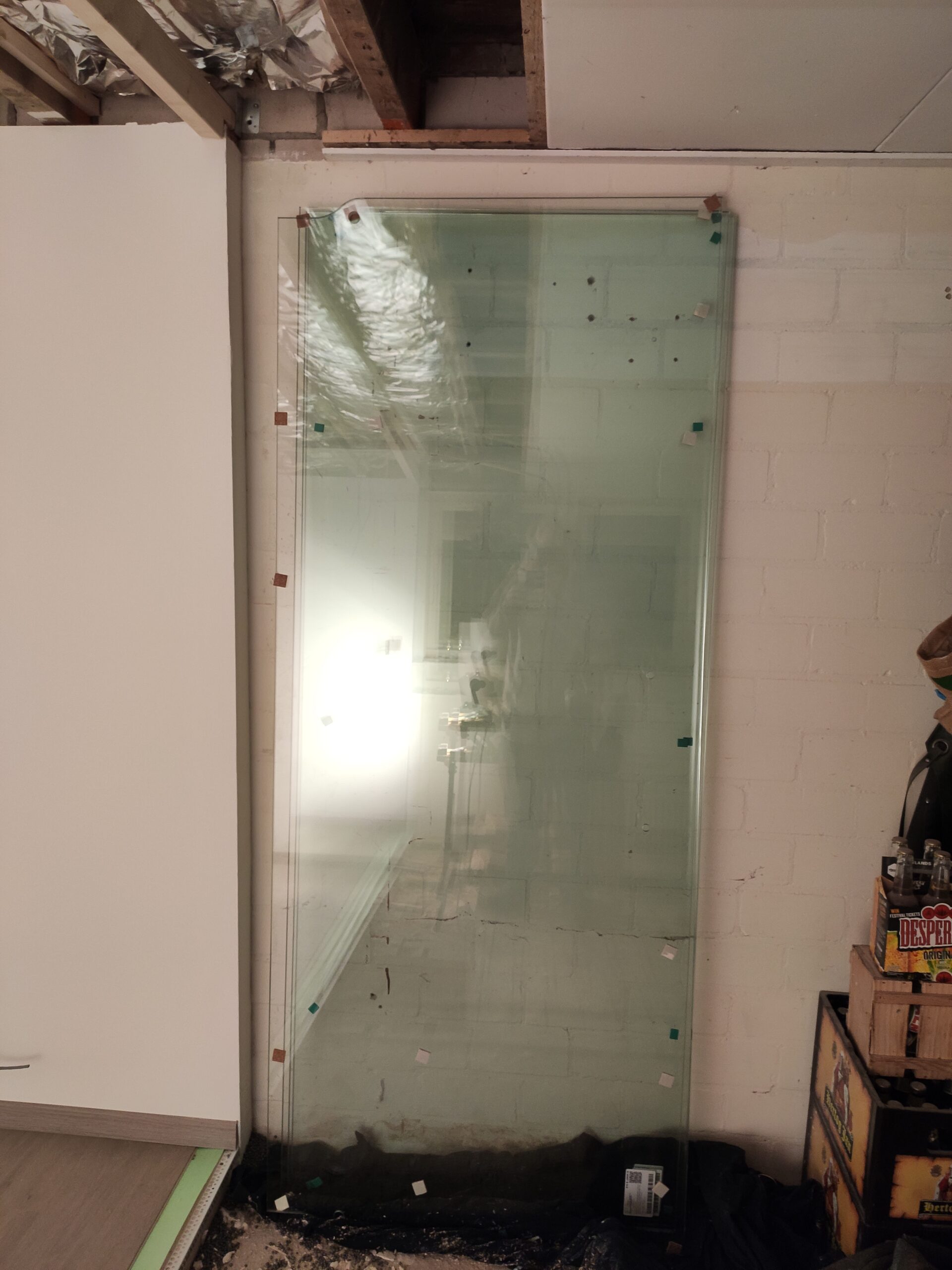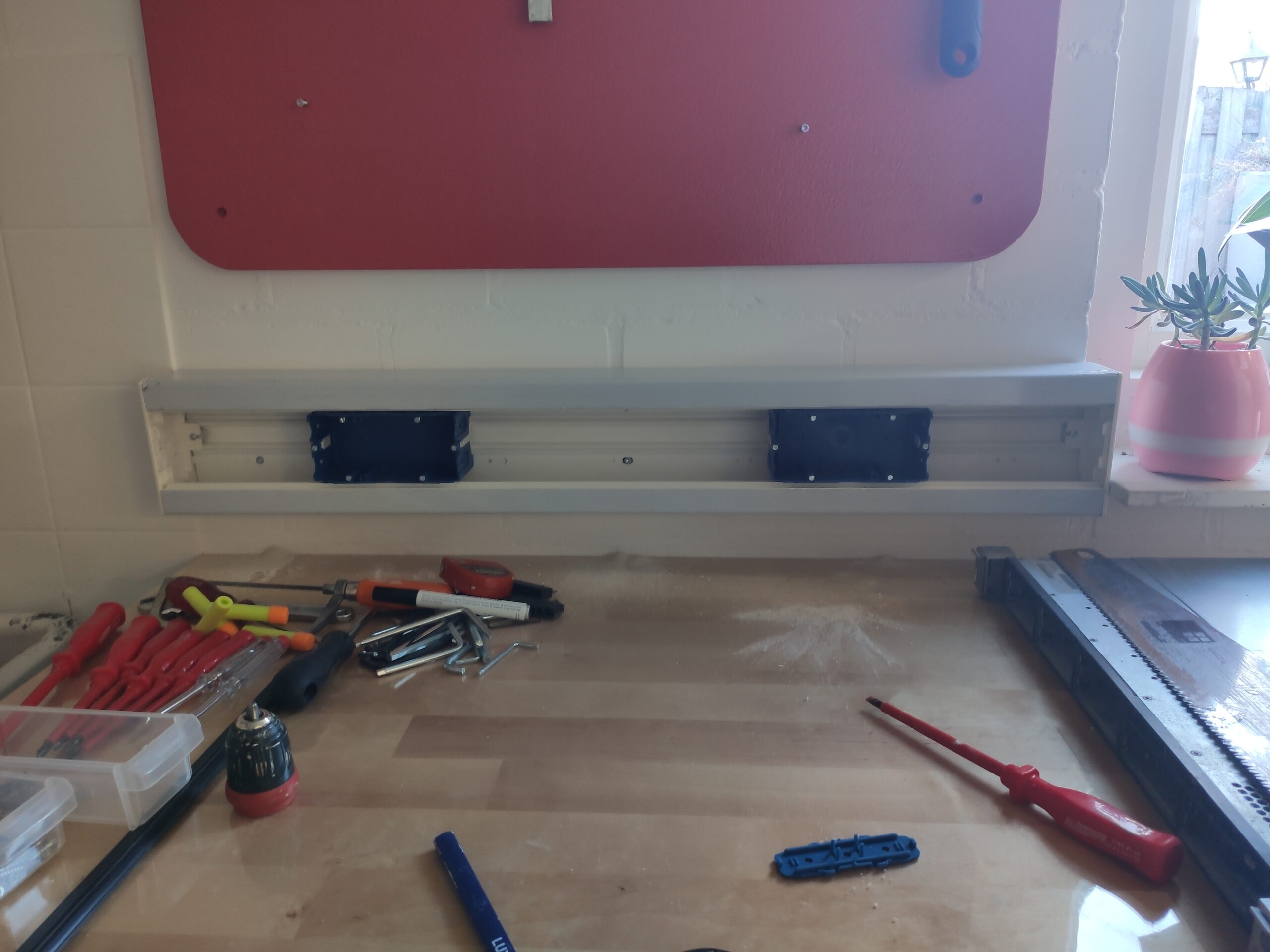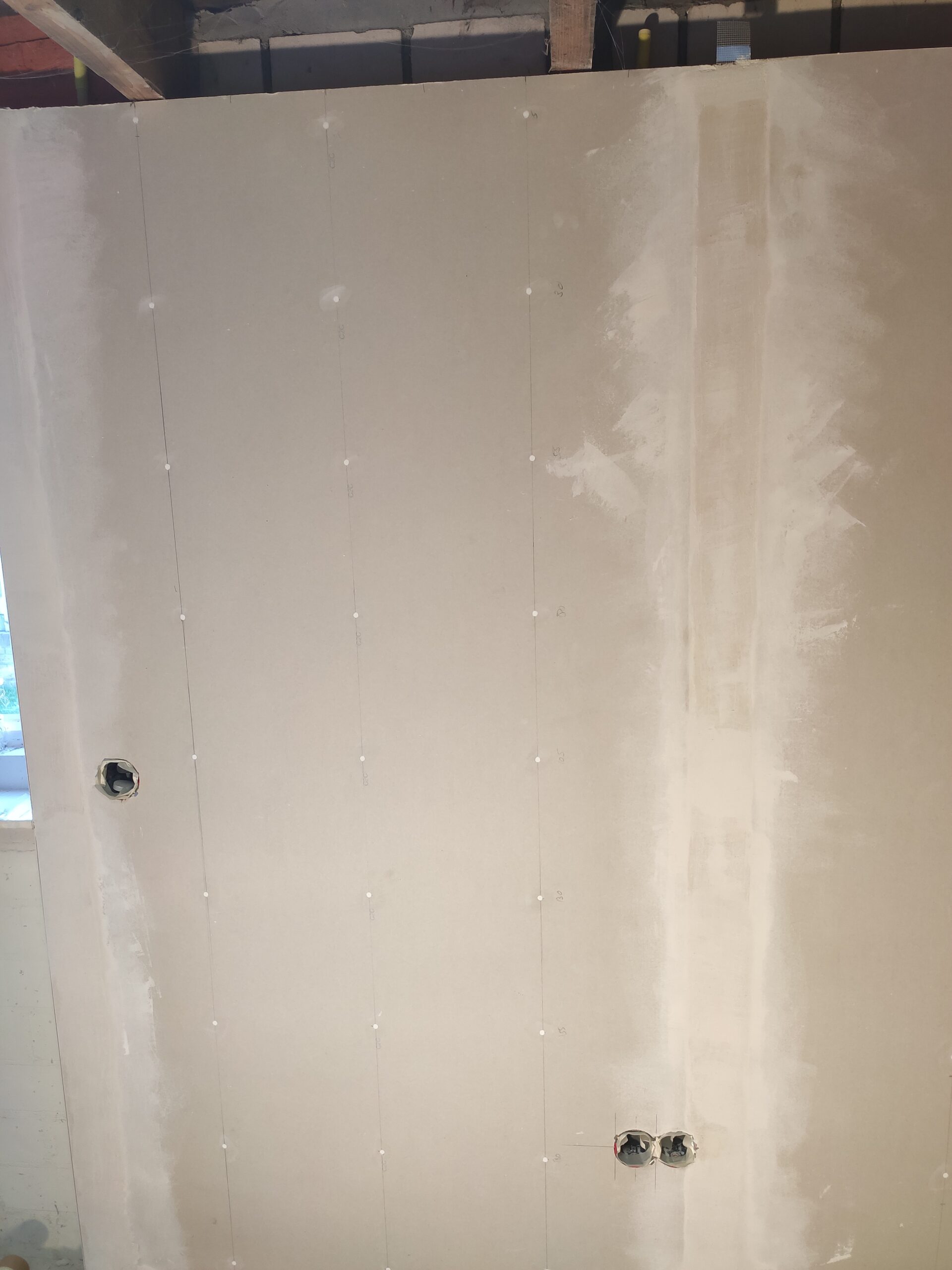 De wanddozen op deze foto’s hebben de uiteindelijke uitwerking niet gehaald, voor een professionele afwerking is gekozen hollewanddozen te gebruiken. Omdat een gipswand niet heel stevig is, en nog niet duidelijk was of er uiteindelijk dingen aan de wanden moesten komen hangen, is gekozen om het frame eerst met spaanplaten te bekleden. Hierdoor hebben de wanden wat meer body en kunnen in de toekomst eenvoudiger schappen en/of schilderijen geplaatst worden.