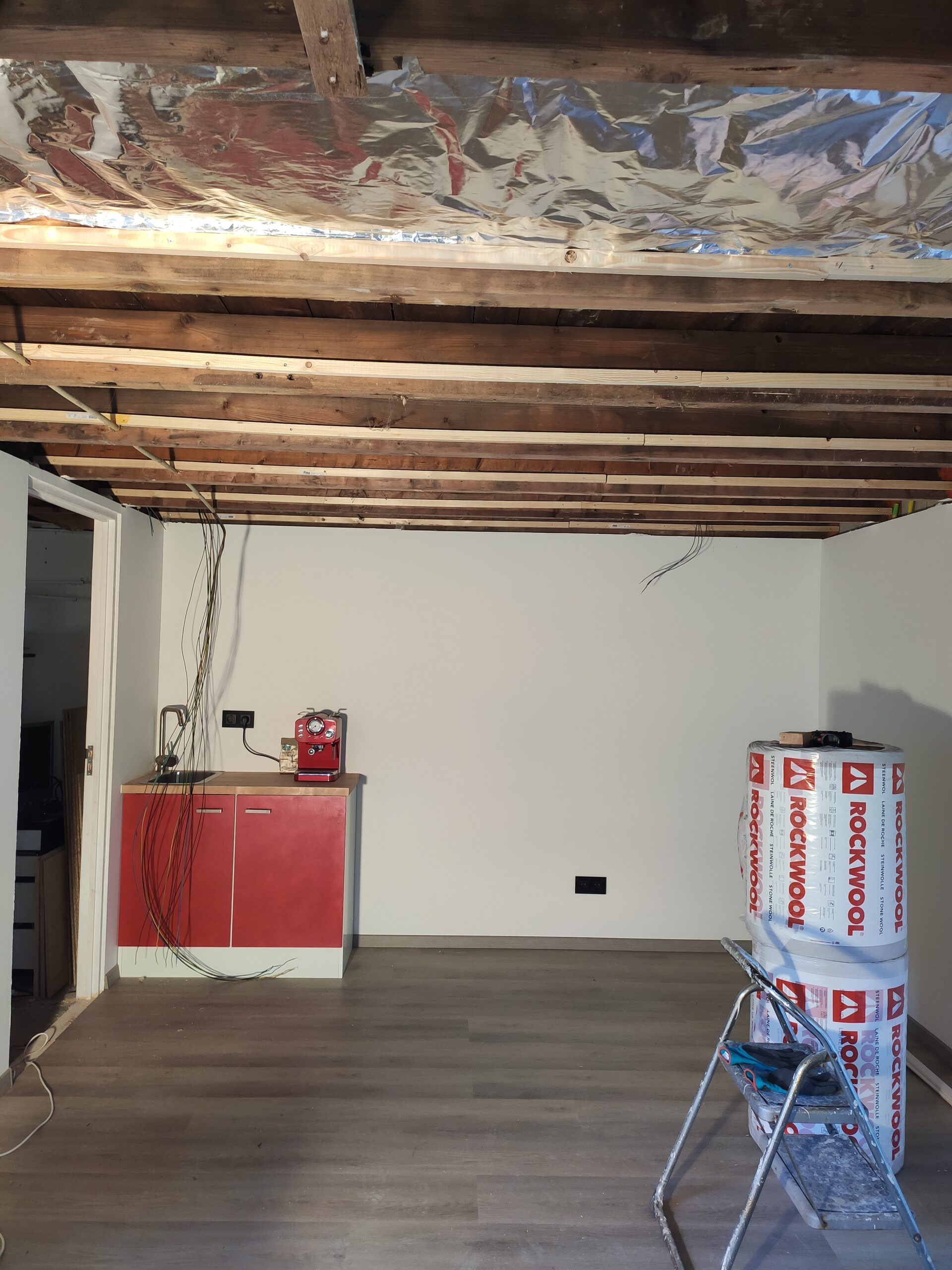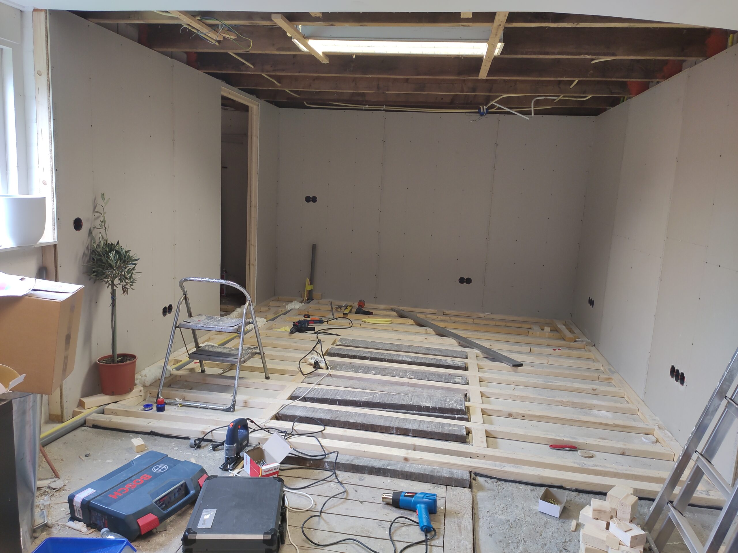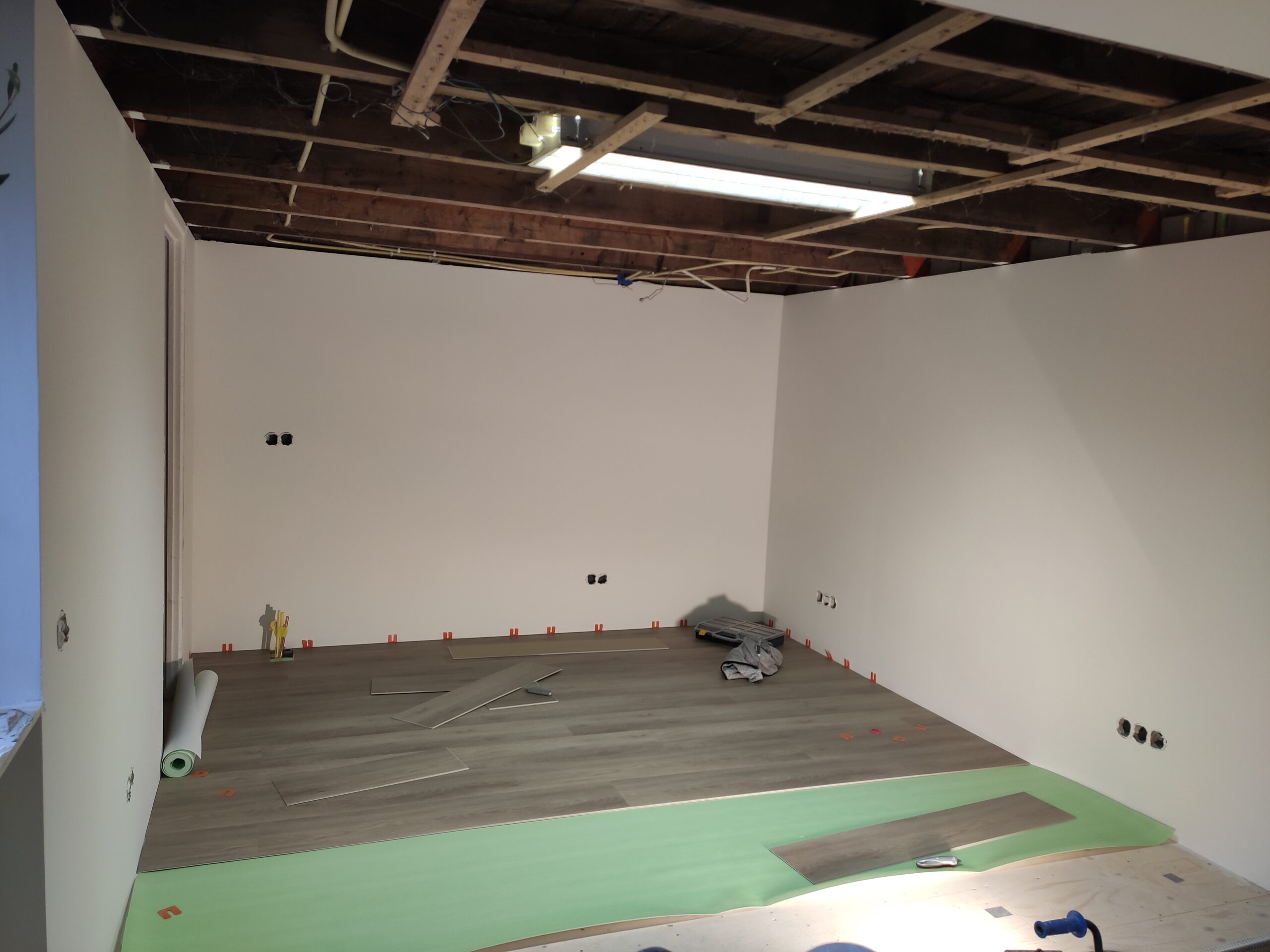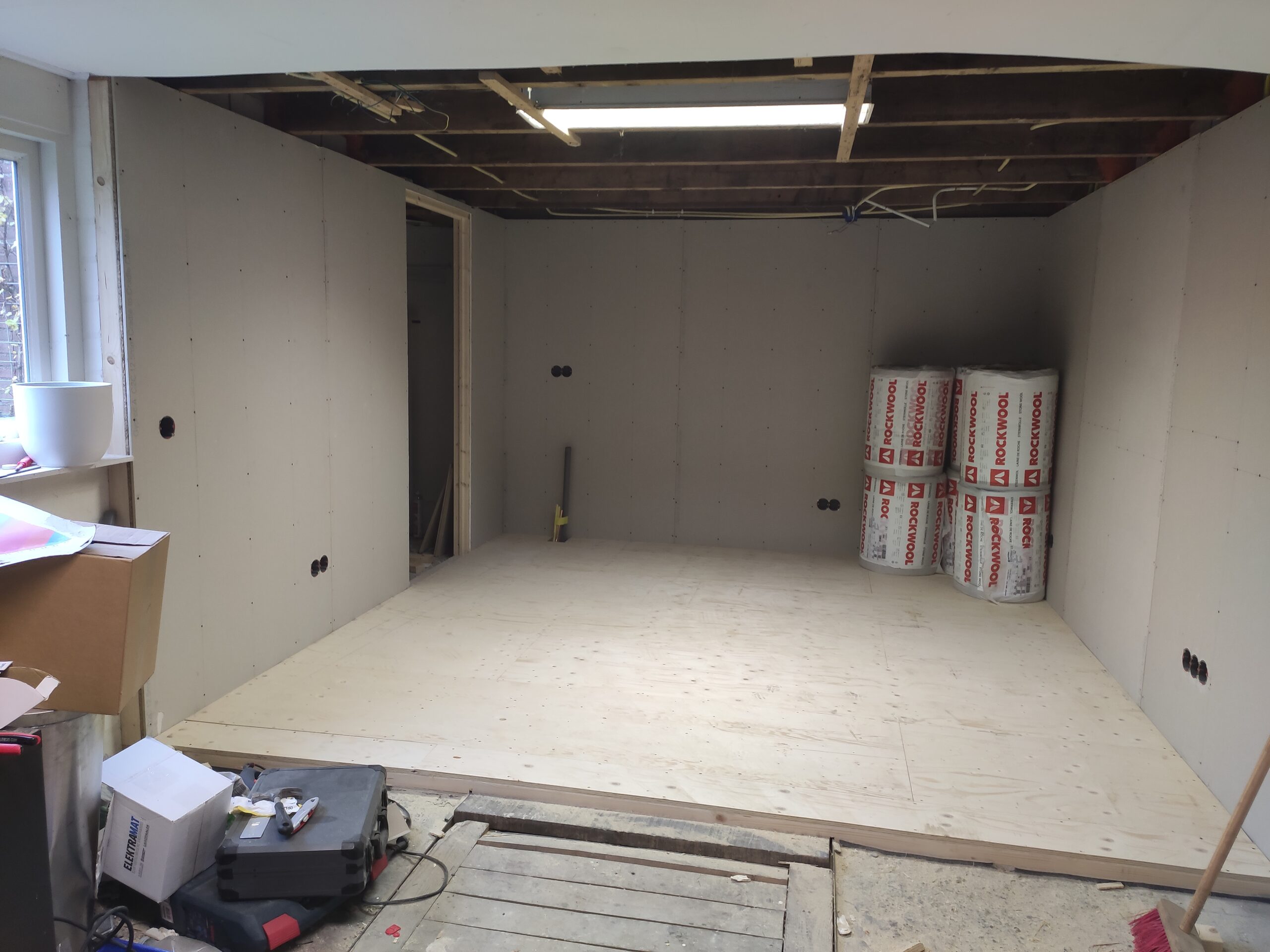 Uiteindelijk is de vloer betimmerd met ‘underlayment’ platen. Hier kan later een nette vloer (laminaat, pvc, tapijt) op aangebracht worden. Ondertussen zijn ook de hollewanddozen voor de stopcontacten en lichtschakelaars geplaatst.
