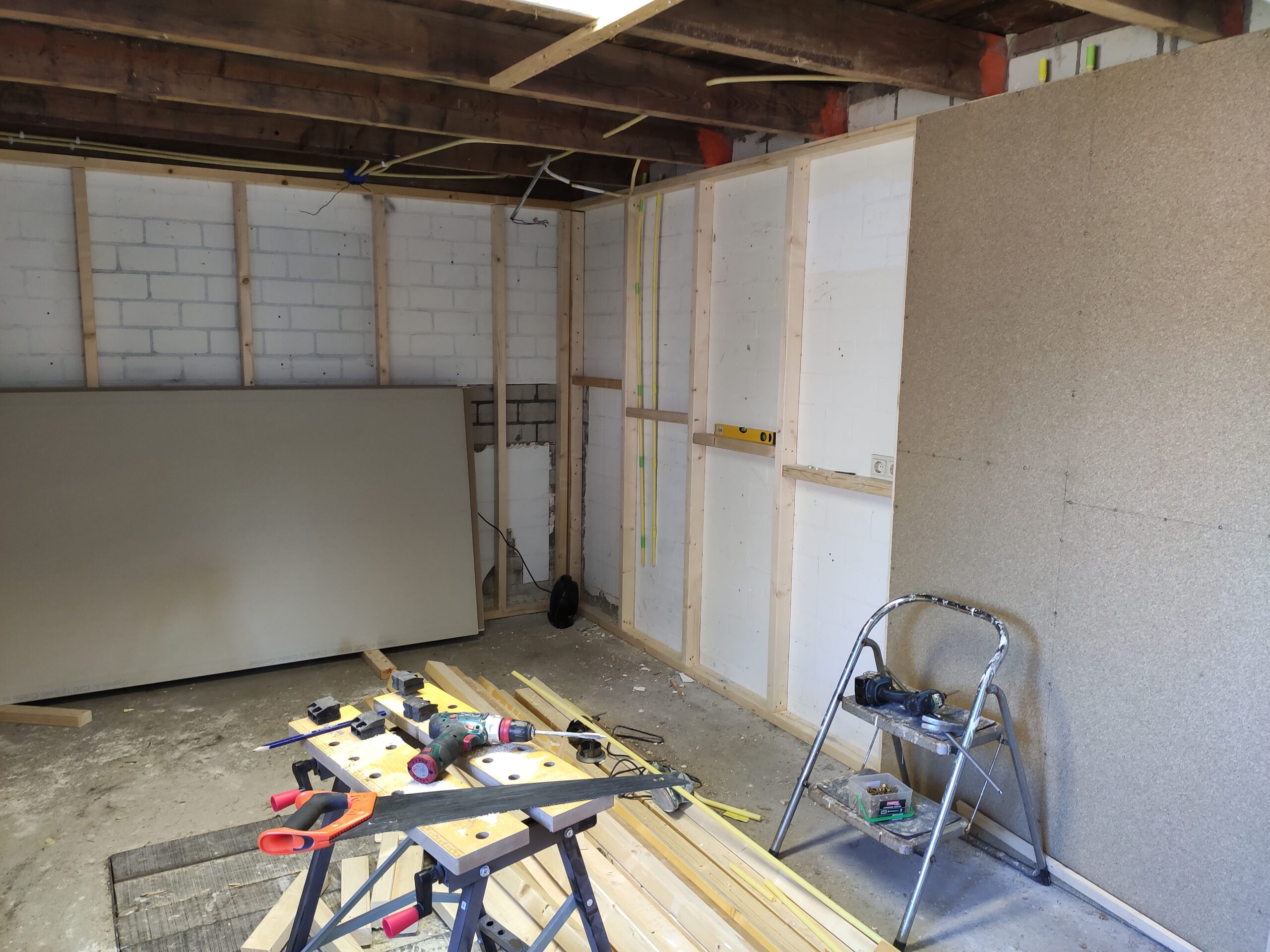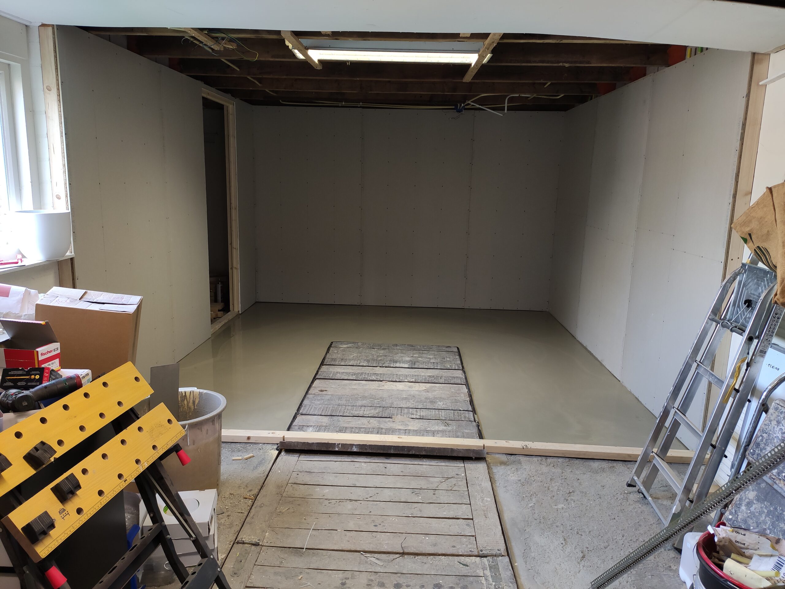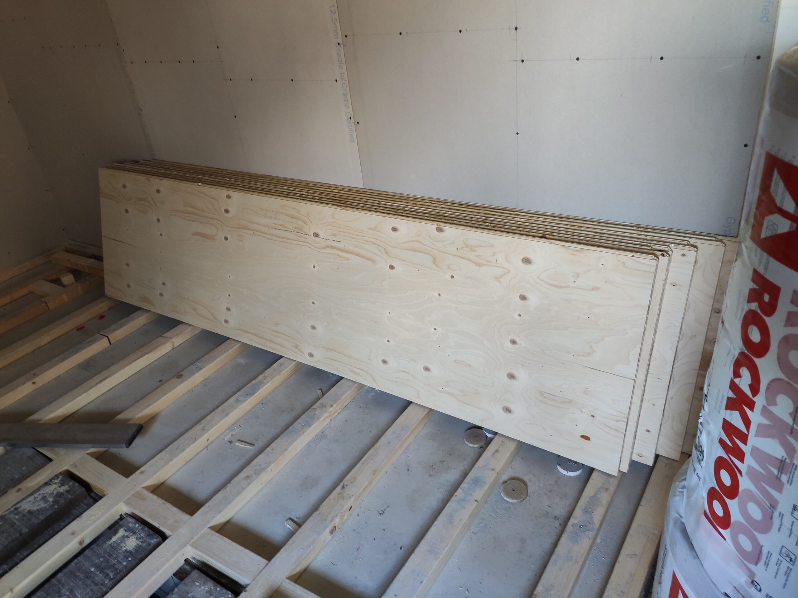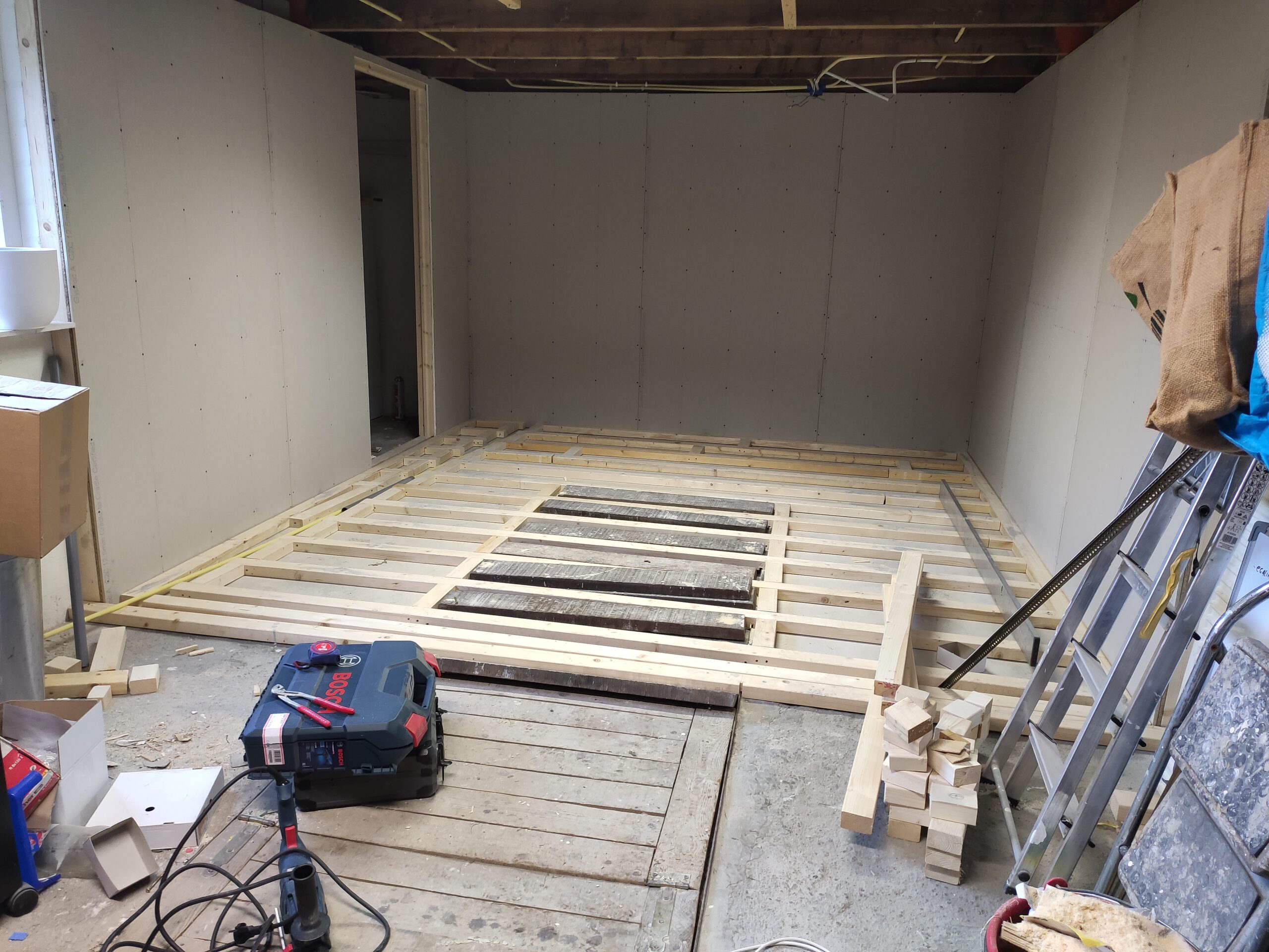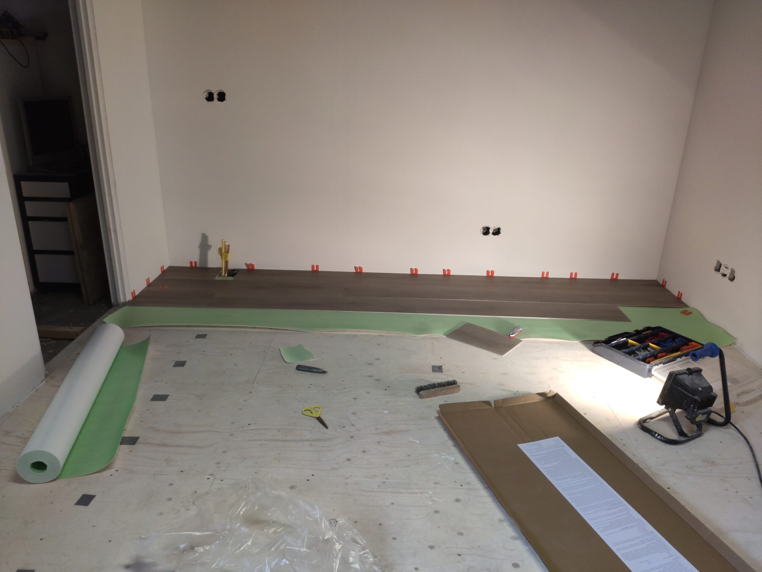 Uiteindelijk is de vloer betimmerd met ‘underlayment’ platen. Hier kan later een nette vloer (laminaat, pvc, tapijt) op aangebracht worden. Ondertussen zijn ook de hollewanddozen voor de stopcontacten en lichtschakelaars geplaatst.