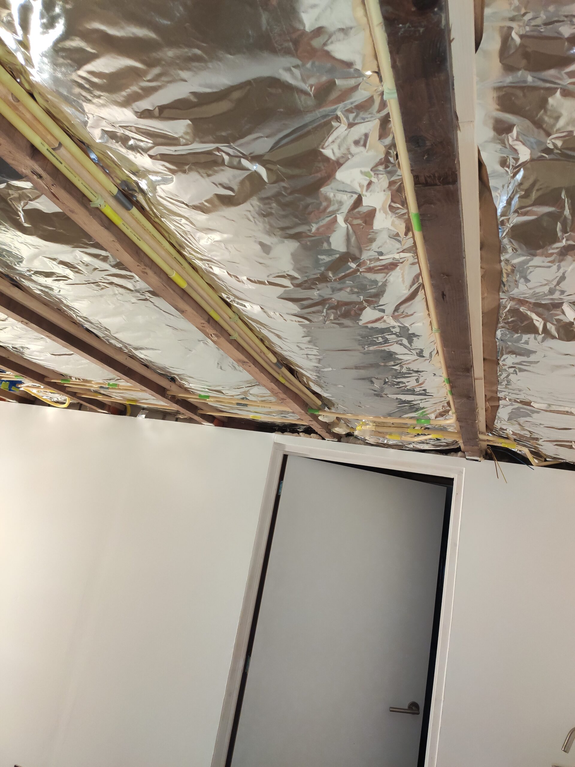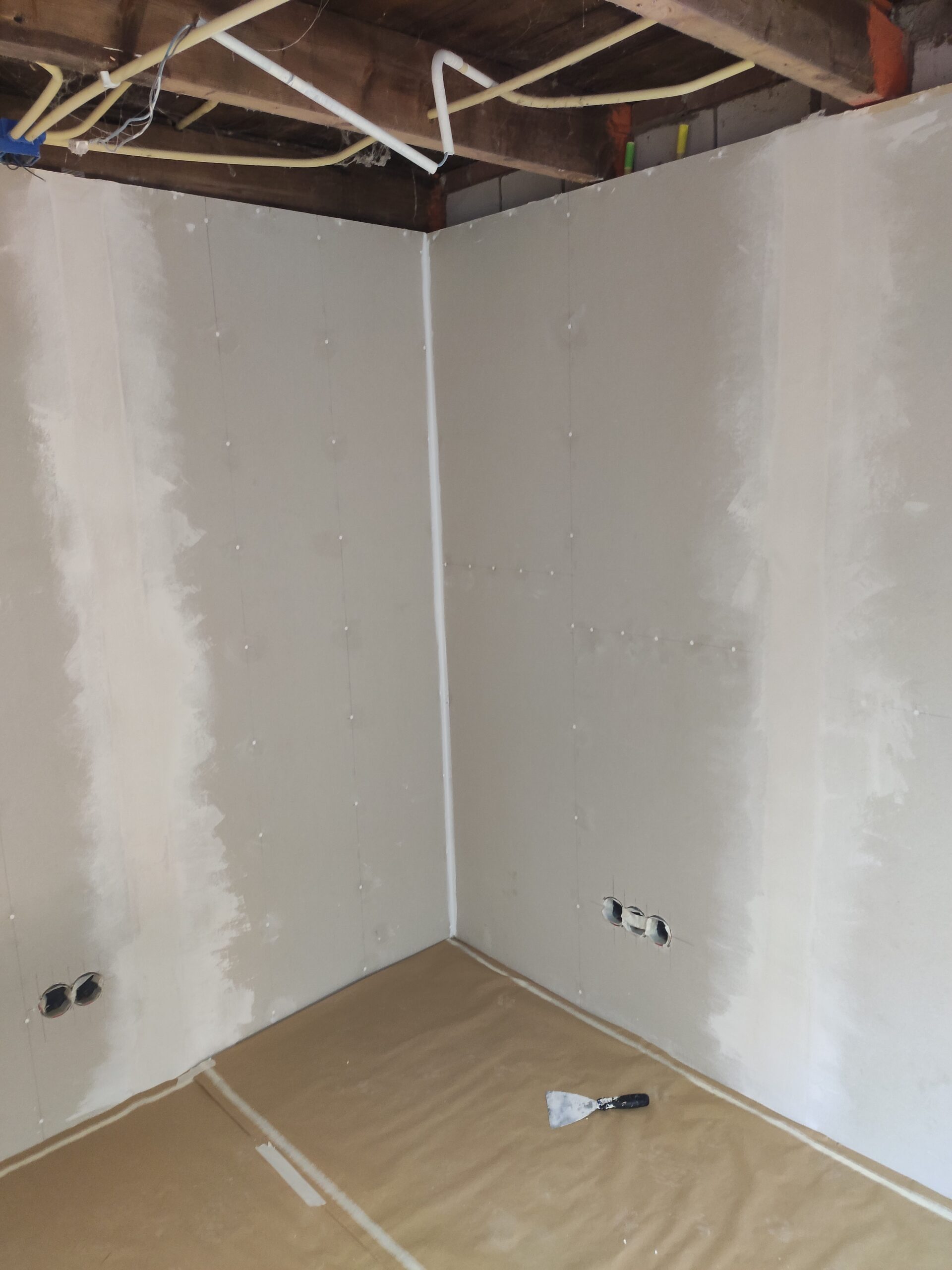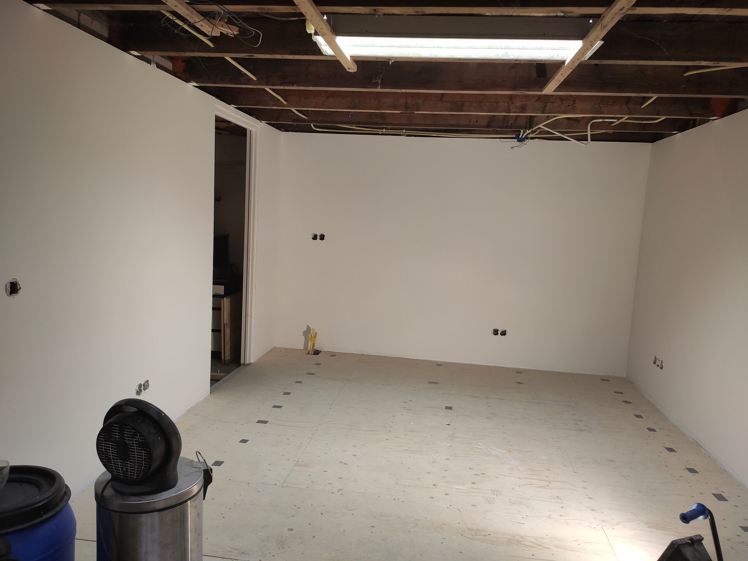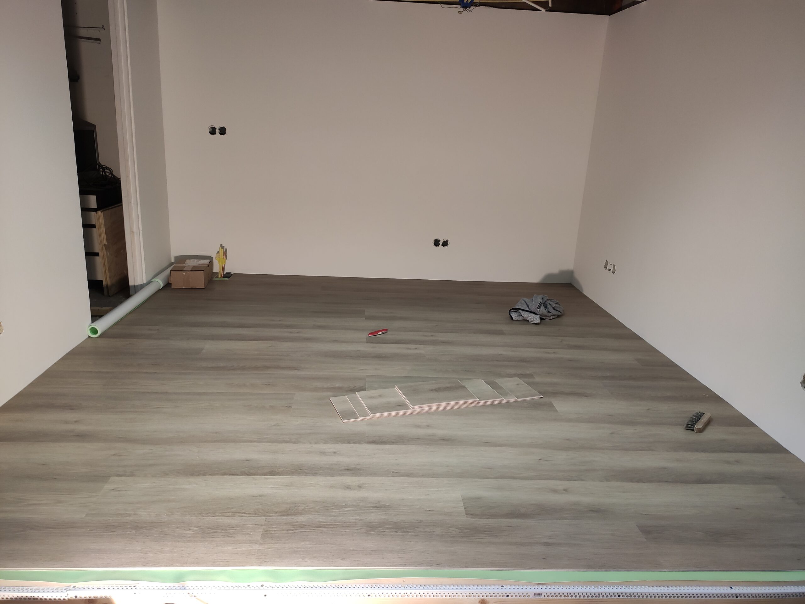 Uiteindelijk is de vloer betimmerd met ‘underlayment’ platen. Hier kan later een nette vloer (laminaat, pvc, tapijt) op aangebracht worden. Ondertussen zijn ook de hollewanddozen voor de stopcontacten en lichtschakelaars geplaatst.