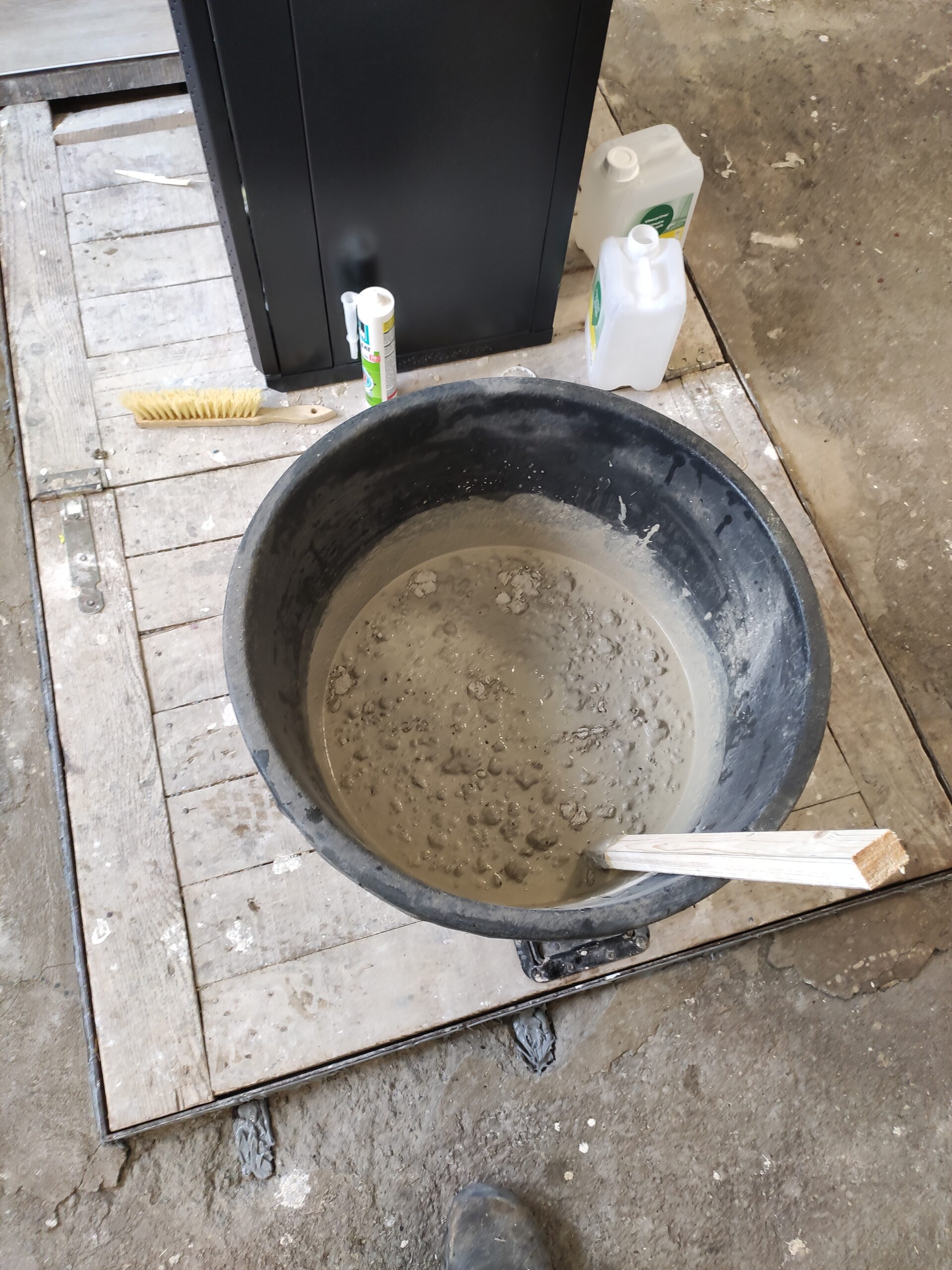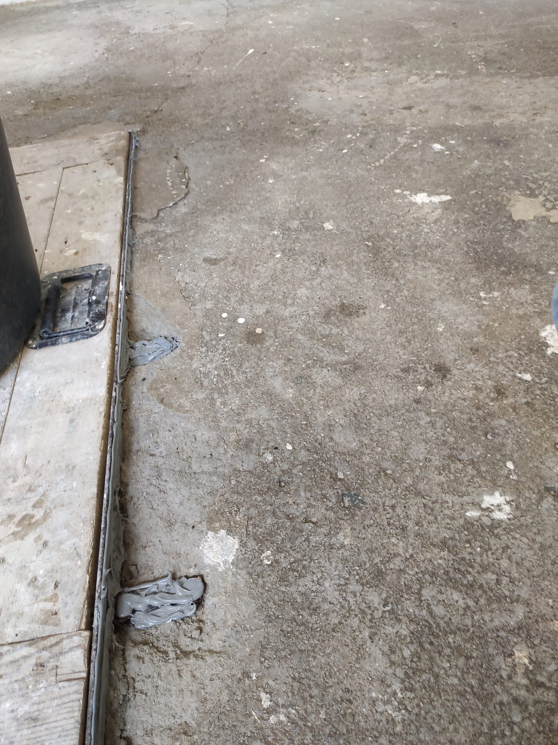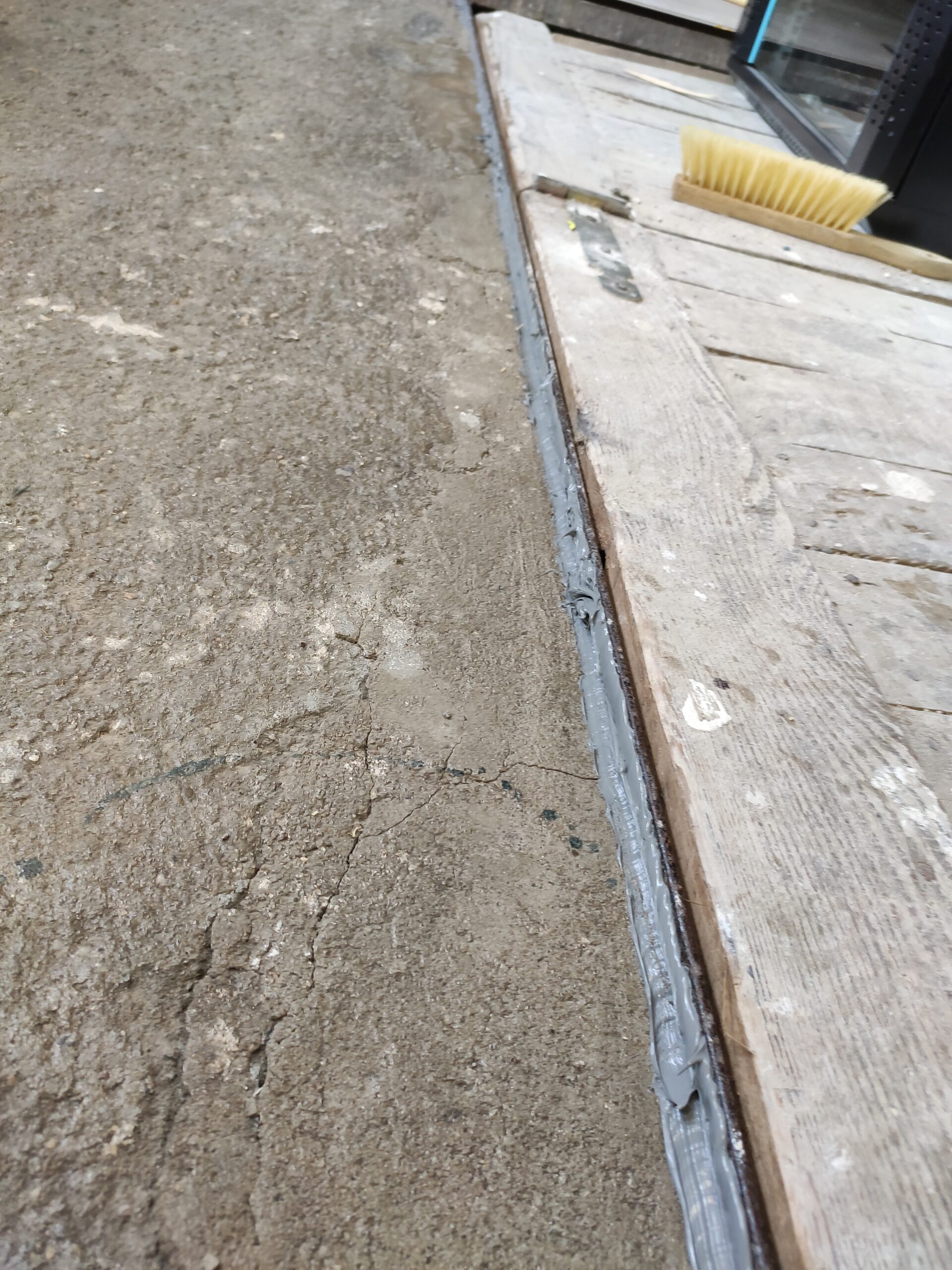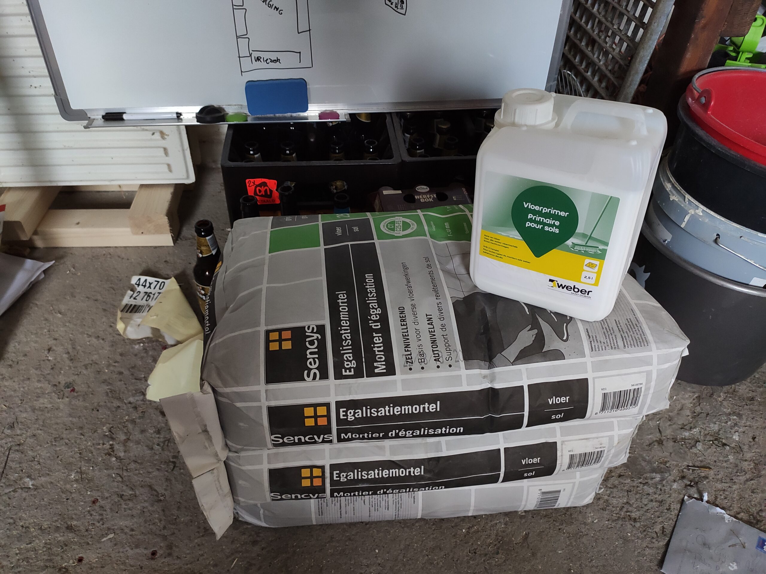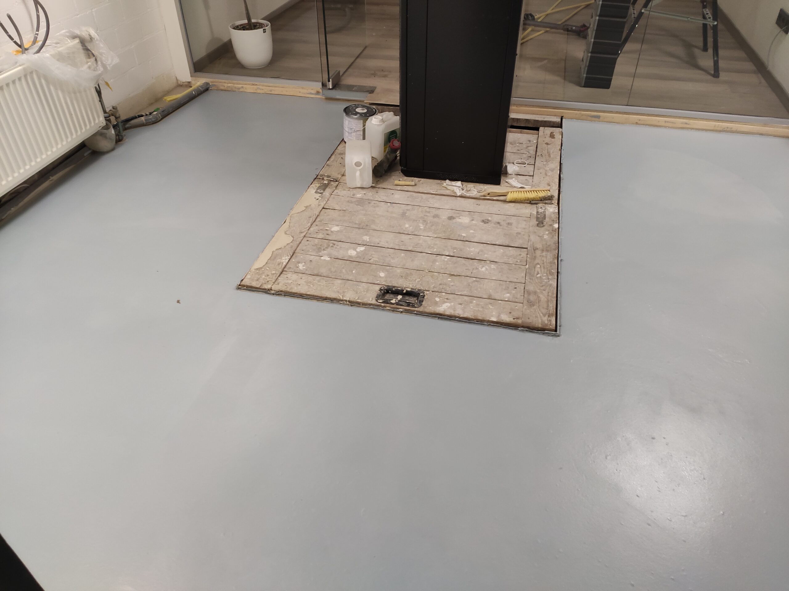 Tot nu toe is de werkplaats grotendeels onaangeraakt gebleven. Hoog tijd om hier verandering in te brengen. De vloer van de werkplaats was zwaar beschadigd, daarom is besloten deze op te vullen met egalisatiemortel.