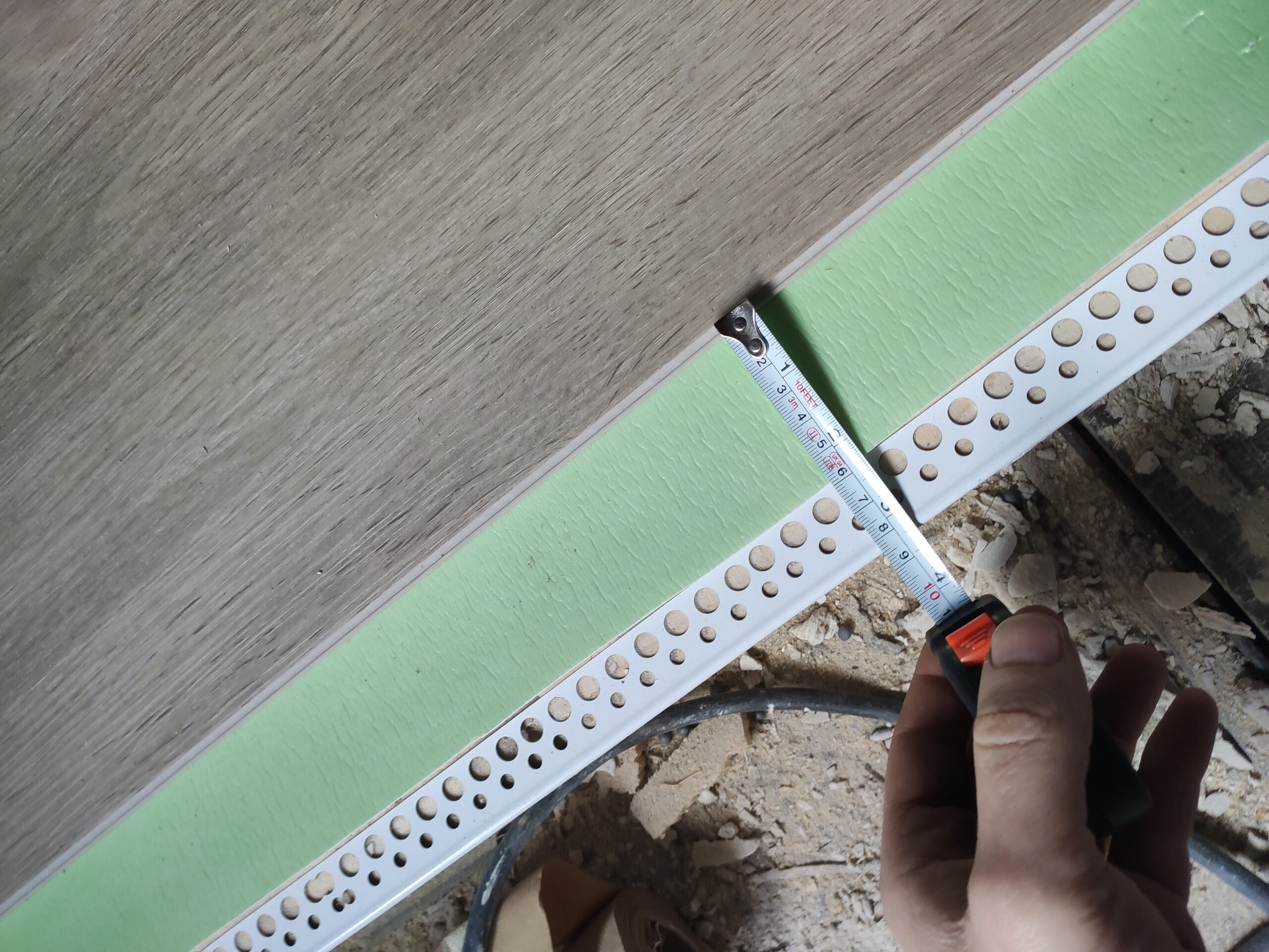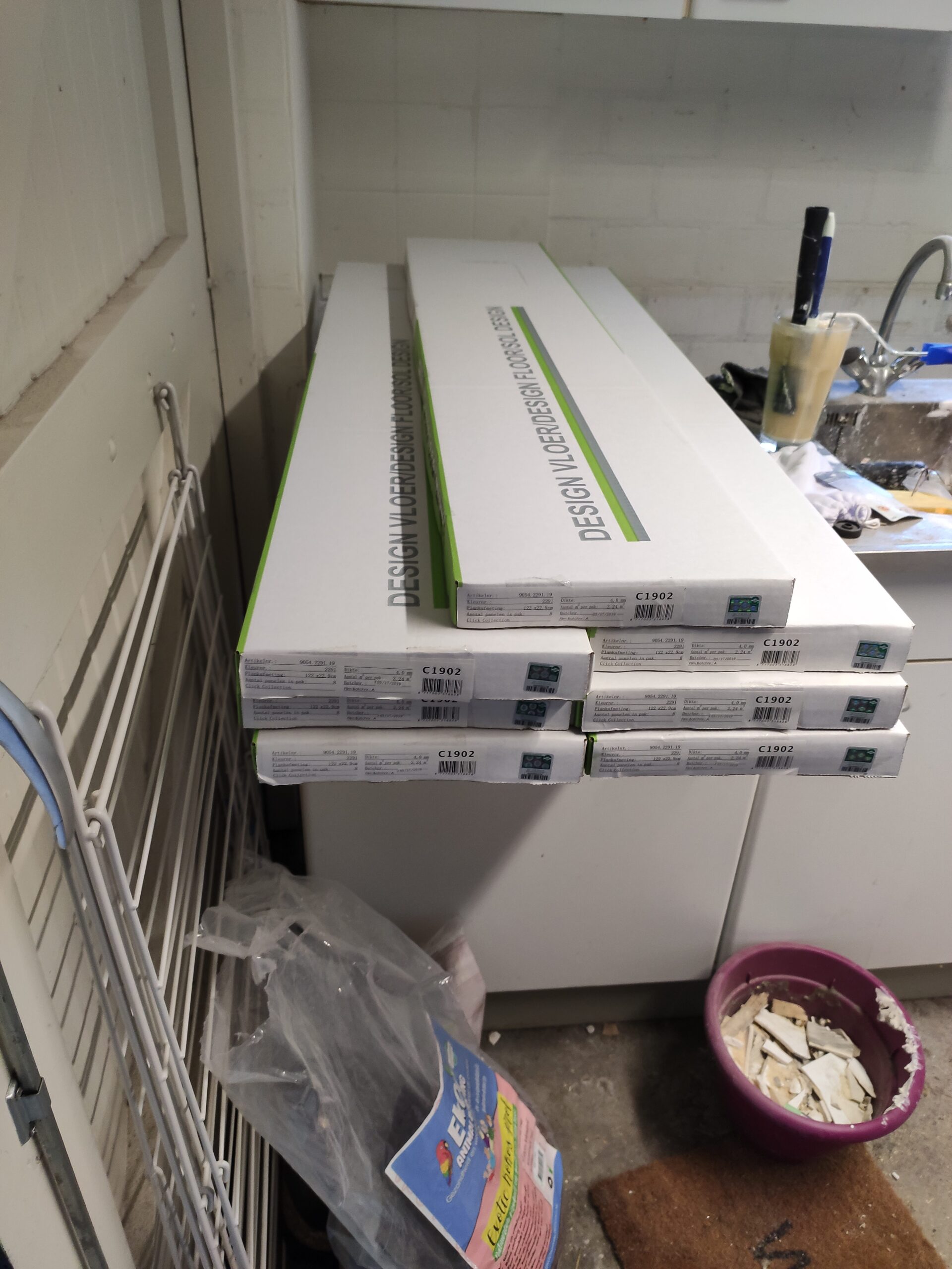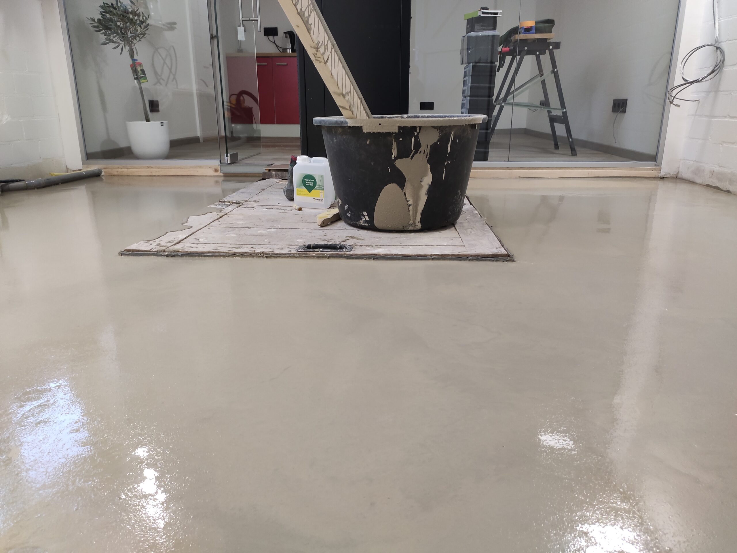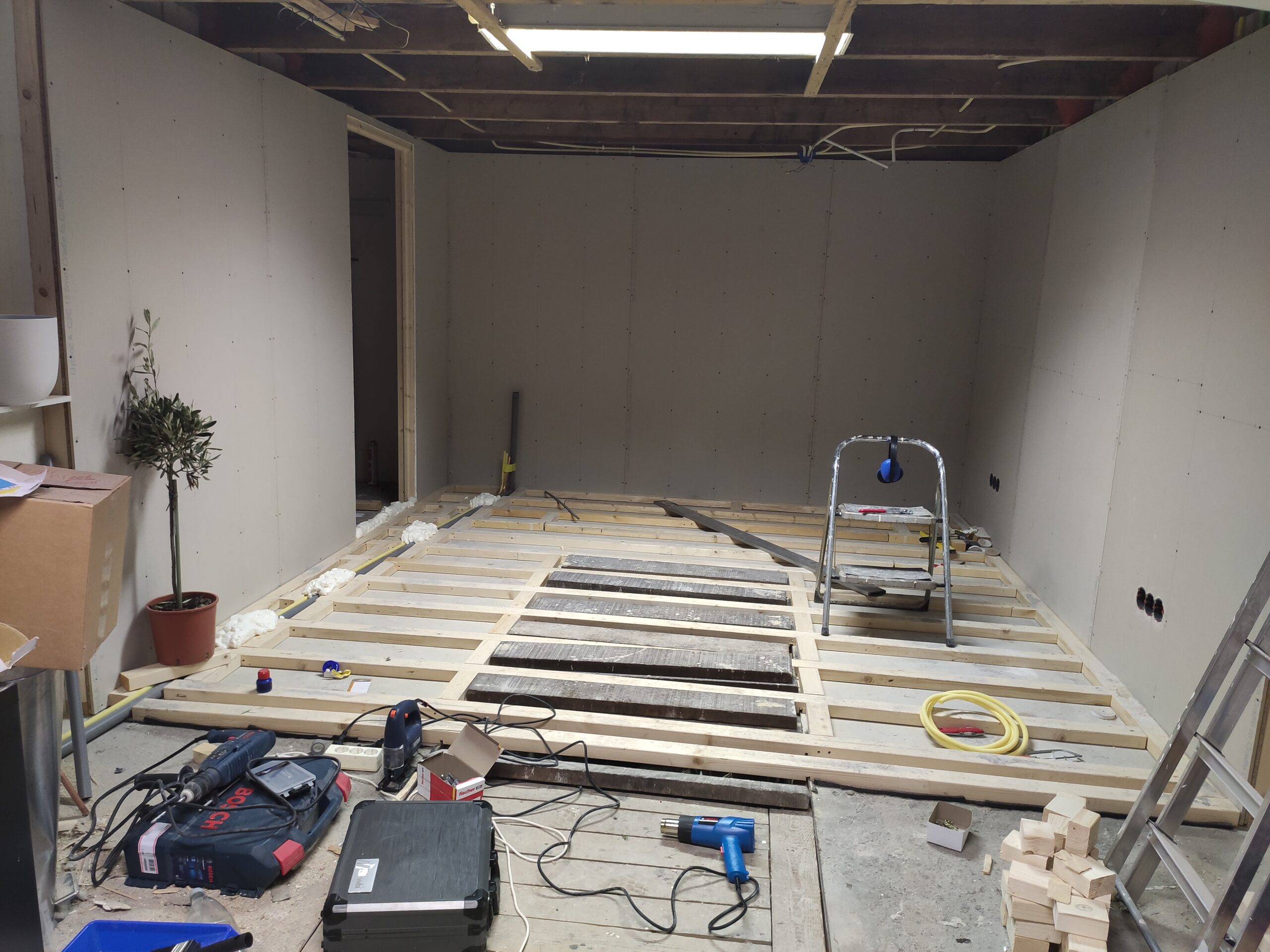 Vervolgens was het de beurt aan de vloer, om gemakkelijk een waterpas oppervlak te creëren is gekozen om de betonnen ondervloer te egaliseren. Hierna kon een frame geplaatst worden waar leidingen in weggewerkt konden worden, denk hierbij aan de aan en afvoer van water voor een keukenblok, en aan elektra.