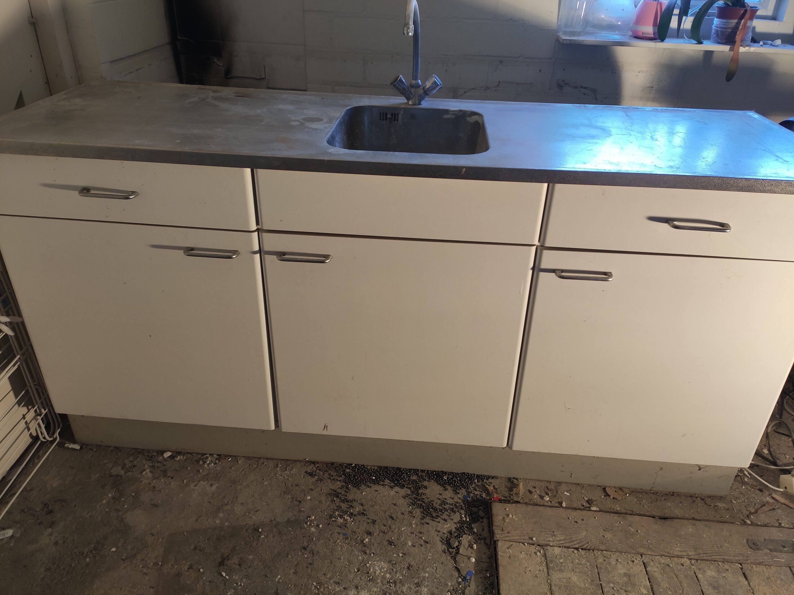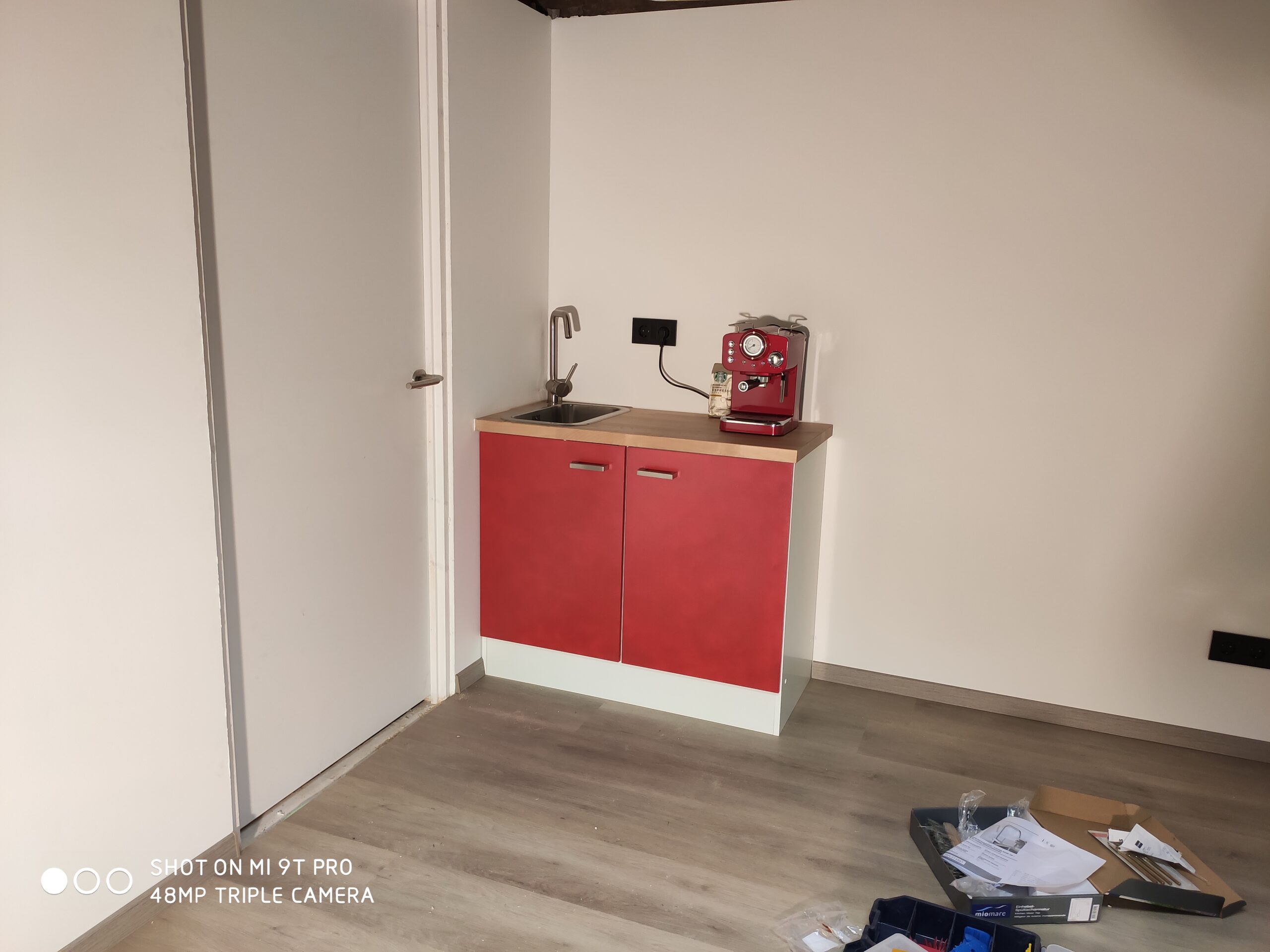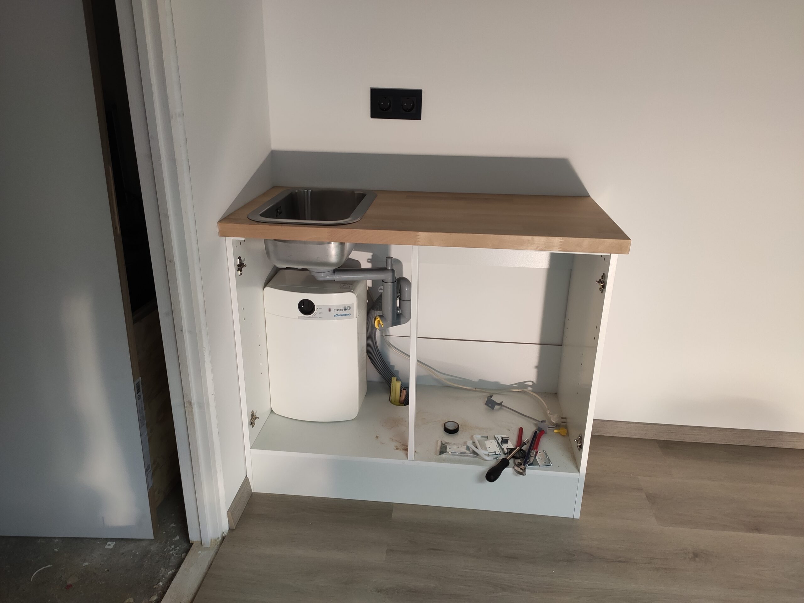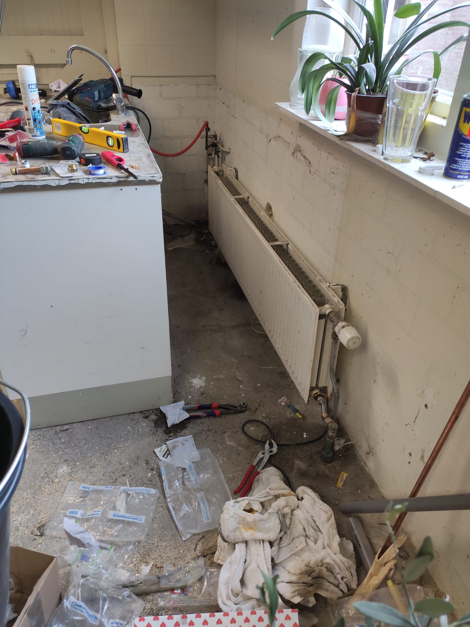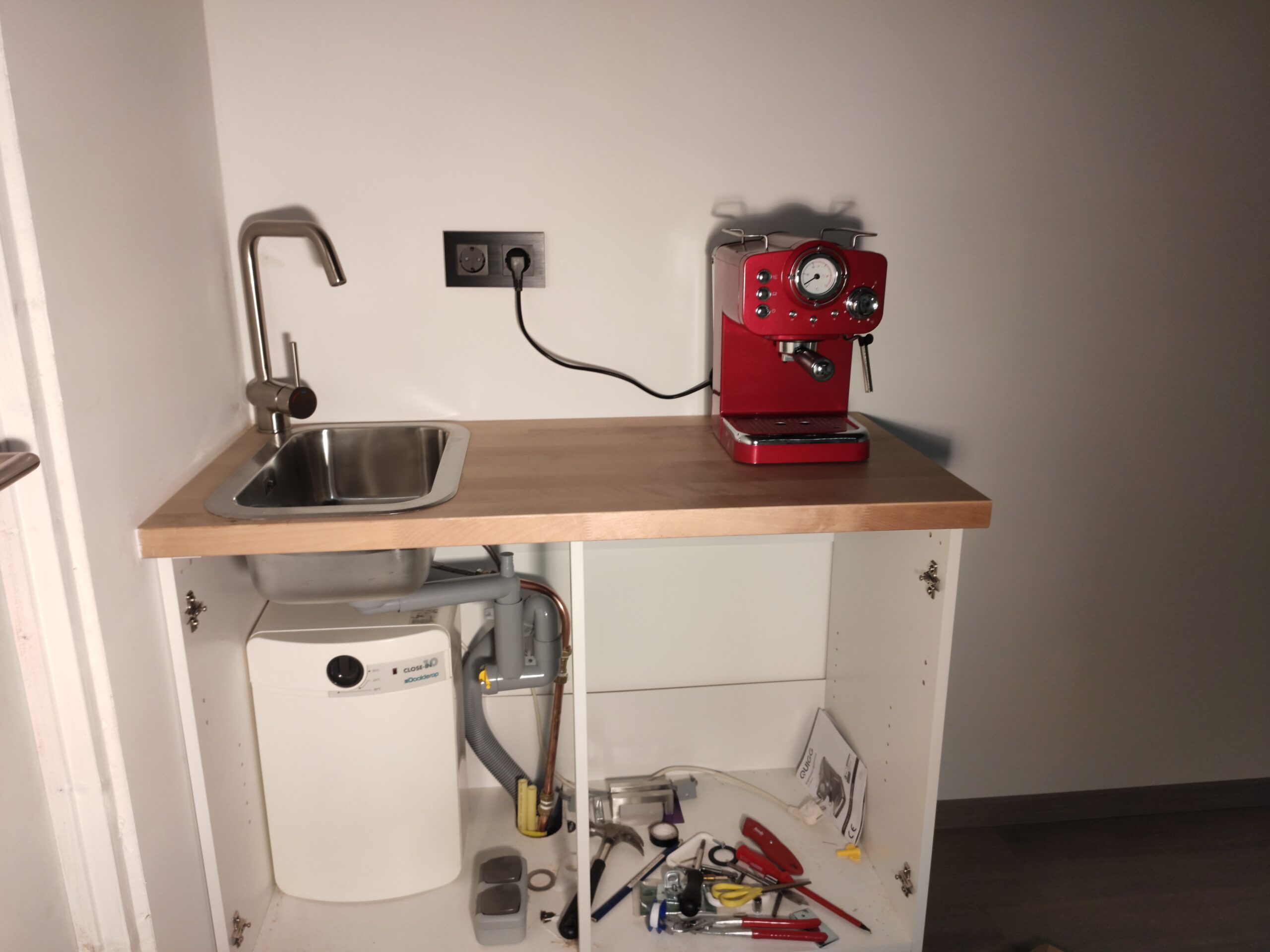 Ondertussen begon de winter zijn intreden te maken. Om het klussen wat behaaglijker te maken is de oorspronkelijke radiator terug geplaatst. In het kantoor staat tevens een aanrechtblok met stromend water, hierdoor is verse koffie altijd binnen handbereik. Voor dit project is gekozen een op maat gemaakt aanrecht te plaatsen. Als uitgangsbasis is een eenvoudig aanrechtblok van 100x60cm gebruikt. Hierop is een massief berkenhouten werkblad gemonteerd met een moderne roestvrijstalen wasbak en kraan.
