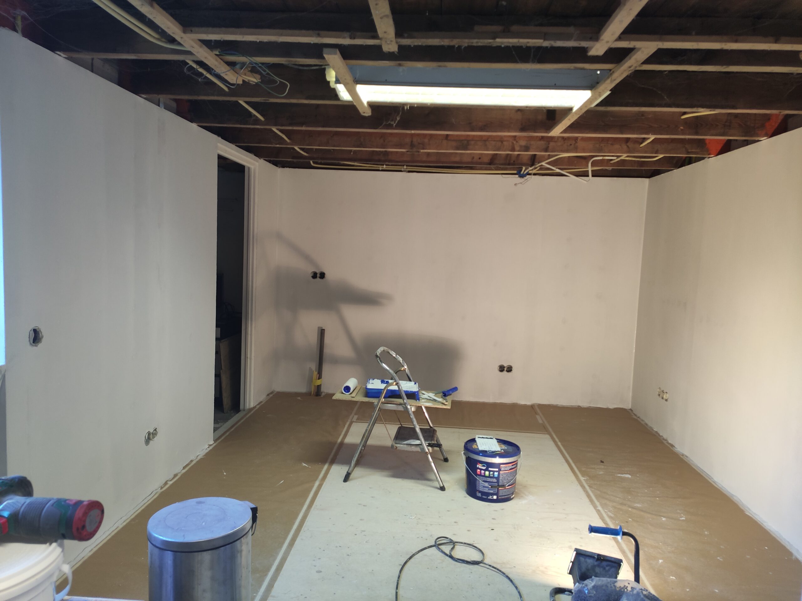 Na het installeren van de ondervloer en wanden, kon het afwerken beginnen. Om te voorkomen dat er verf op de definitieve vloer terecht komt begon Gijs met stuken en schilderen van de wanden. Voor een simpele doch professionele uitstraling is een matwitte muurverf gekozen.