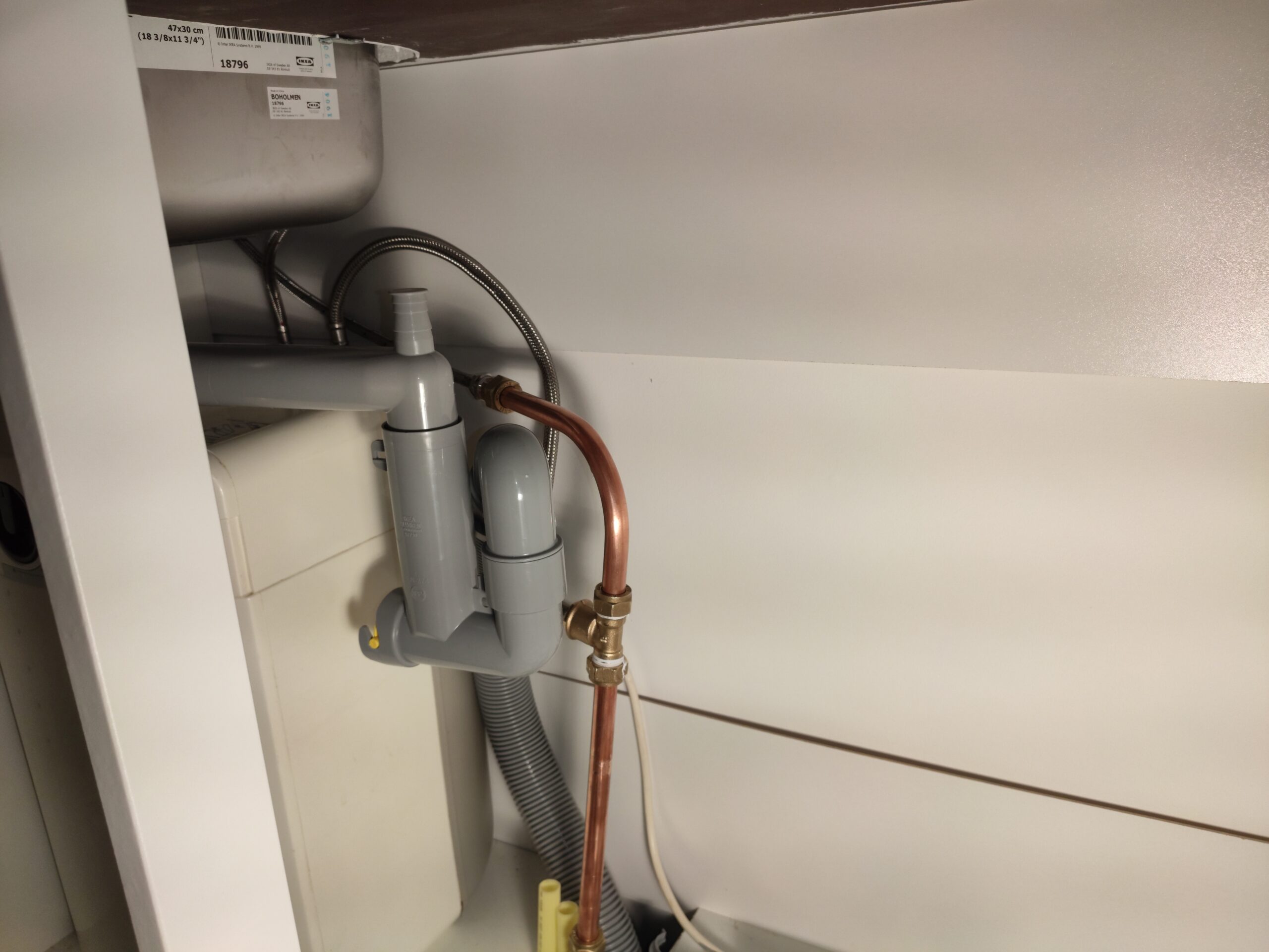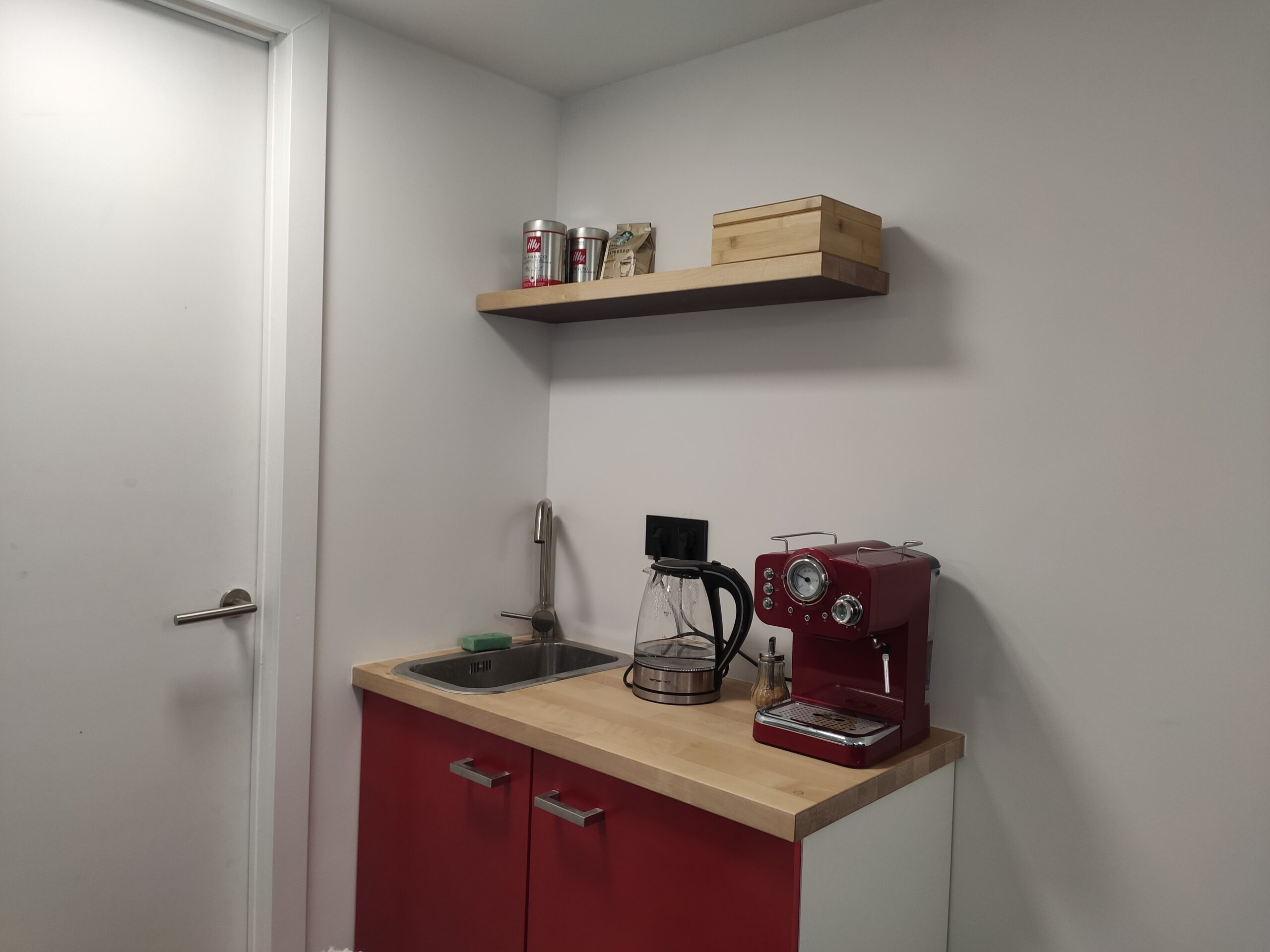 Voor een strakkere uitstraling is gekozen de deurtjes over te schilderen met een metallic rode verf, en roestvrijstalen handgrepen te monteren. In verband met de grote afstand tot de CV ketel is gekozen geen warm water leiding te trekken naar de garage, in plaats daarvan is een boiler geplaatst. Dit is niet alleen zuiniger, maar hierdoor is er ook altijd snel warm water beschikbaar.