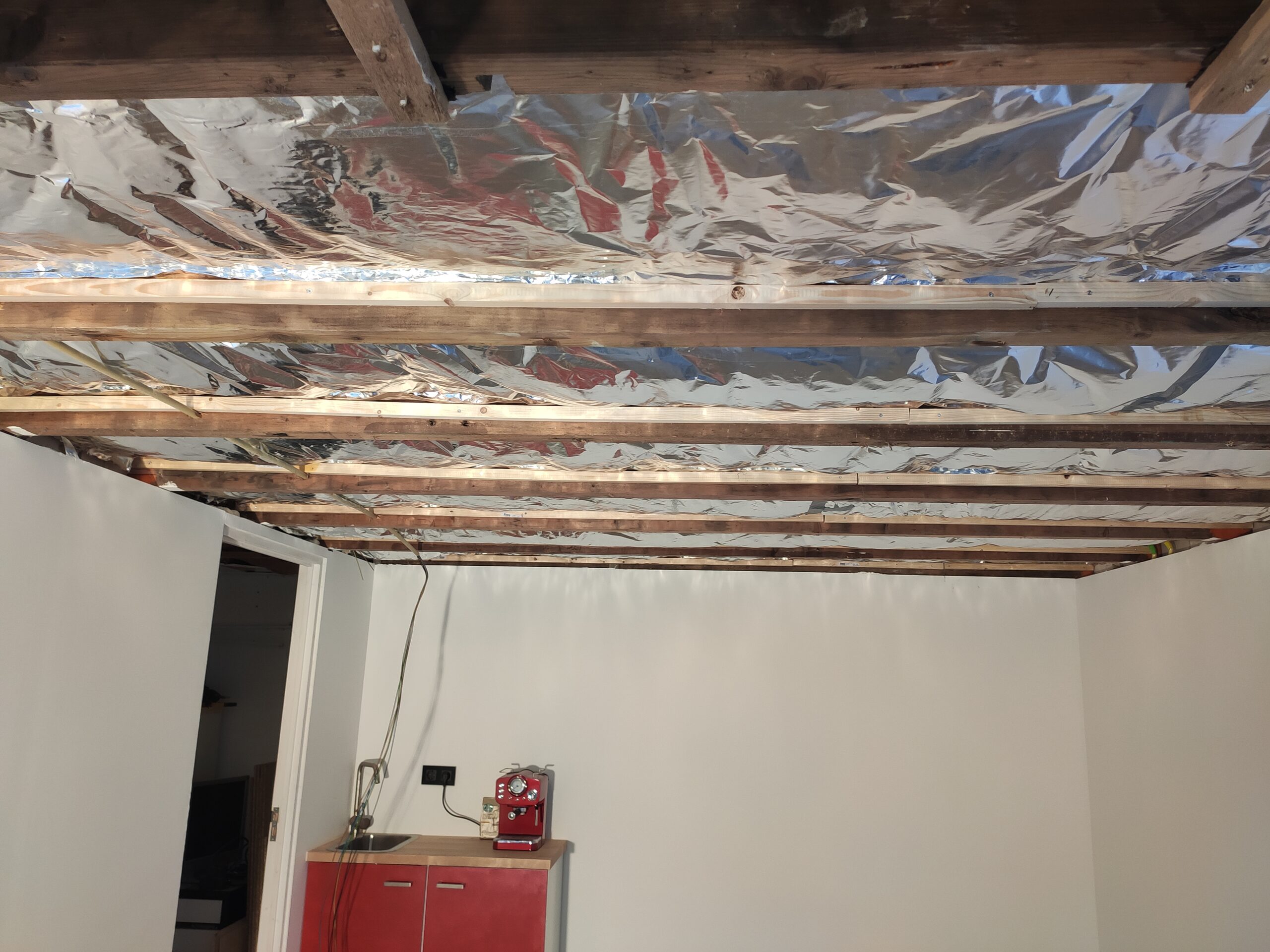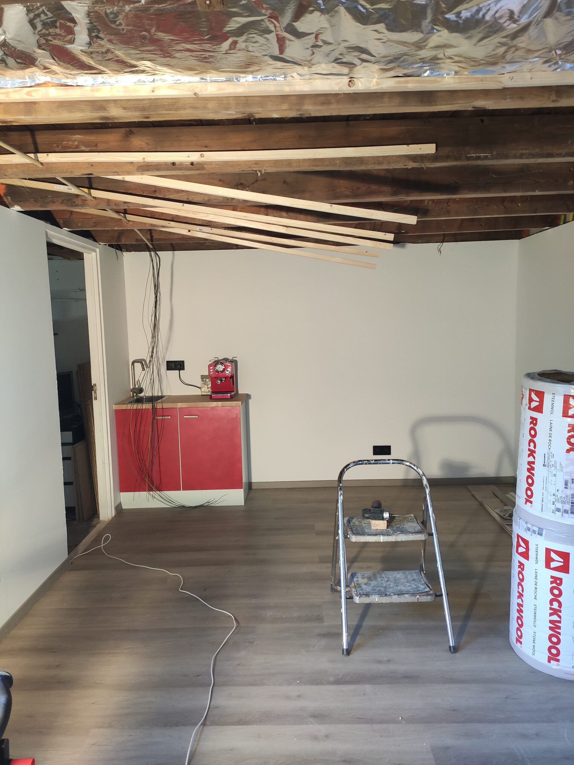 Nadat het plafond geïsoleerd is en de elektra geplaatst, kon ook deze worden afgewerkt. Omdat het kantoor wat aan de lage kant is, telt iedere centimeter. Dit is de reden om het oorspronkelijke plan voor een systeemplafond, wat erg praktisch is voor toekomstige aanpassingen, te laten varen en voor een gips plafond te kiezen. Hiervoor zijn eerst latten tussen de balken gemonteerd, waarop de gipsplaten vastgeniet zijn. Daarna is het plafond, net als de wanden, gestukt en geschilderd. Met het plafond af begint het kantoor dan toch echt vorm te krijgen.