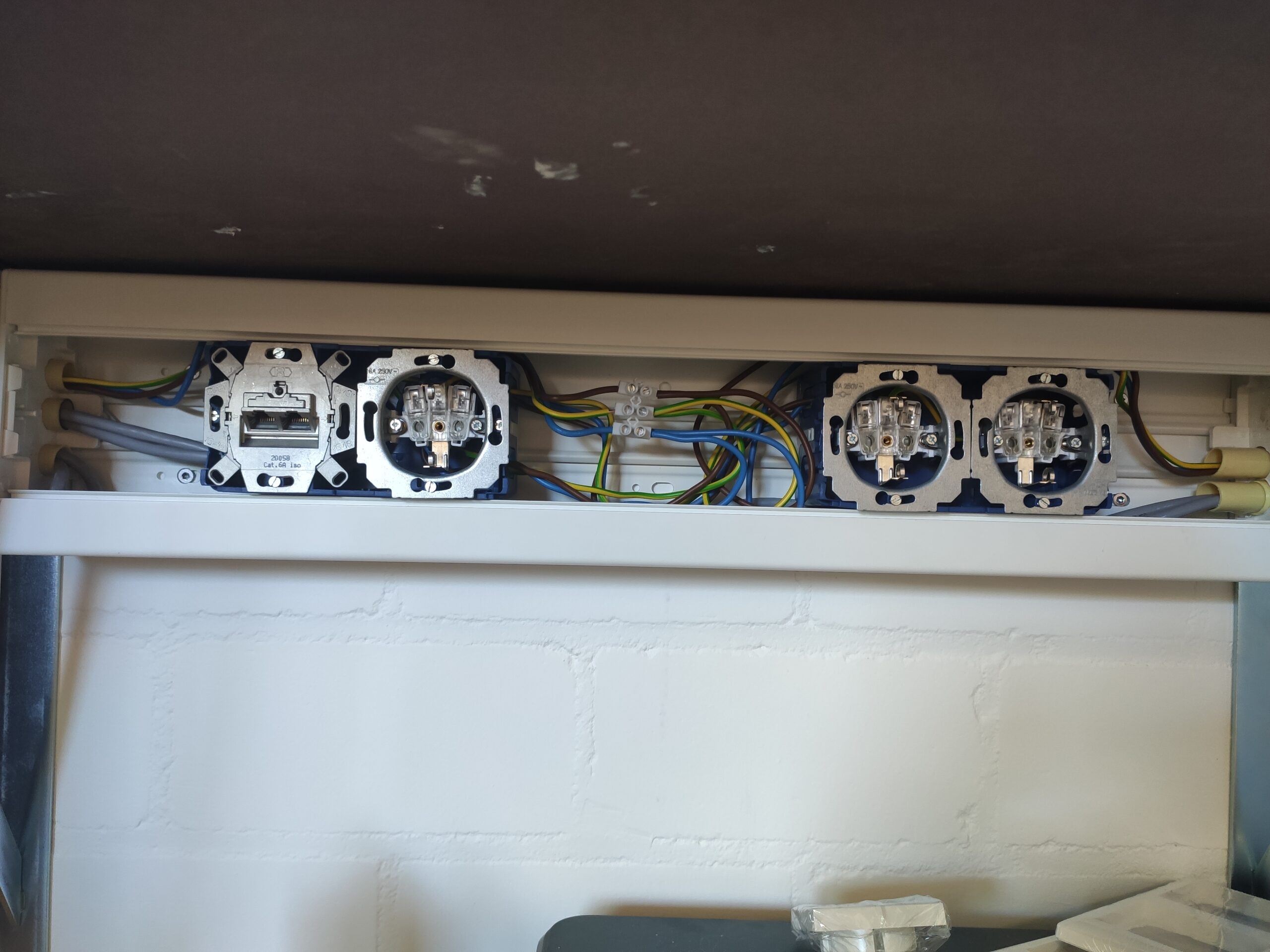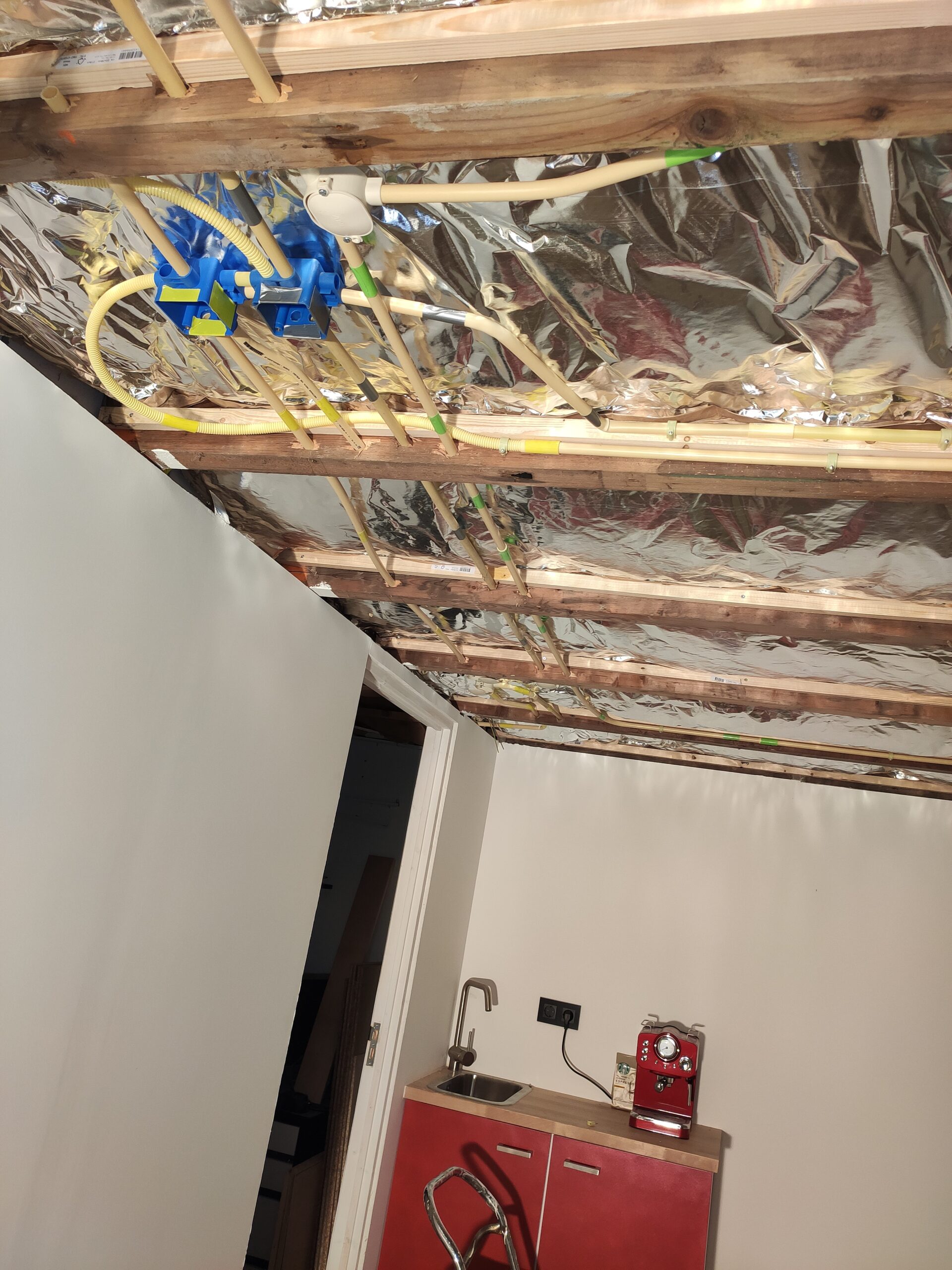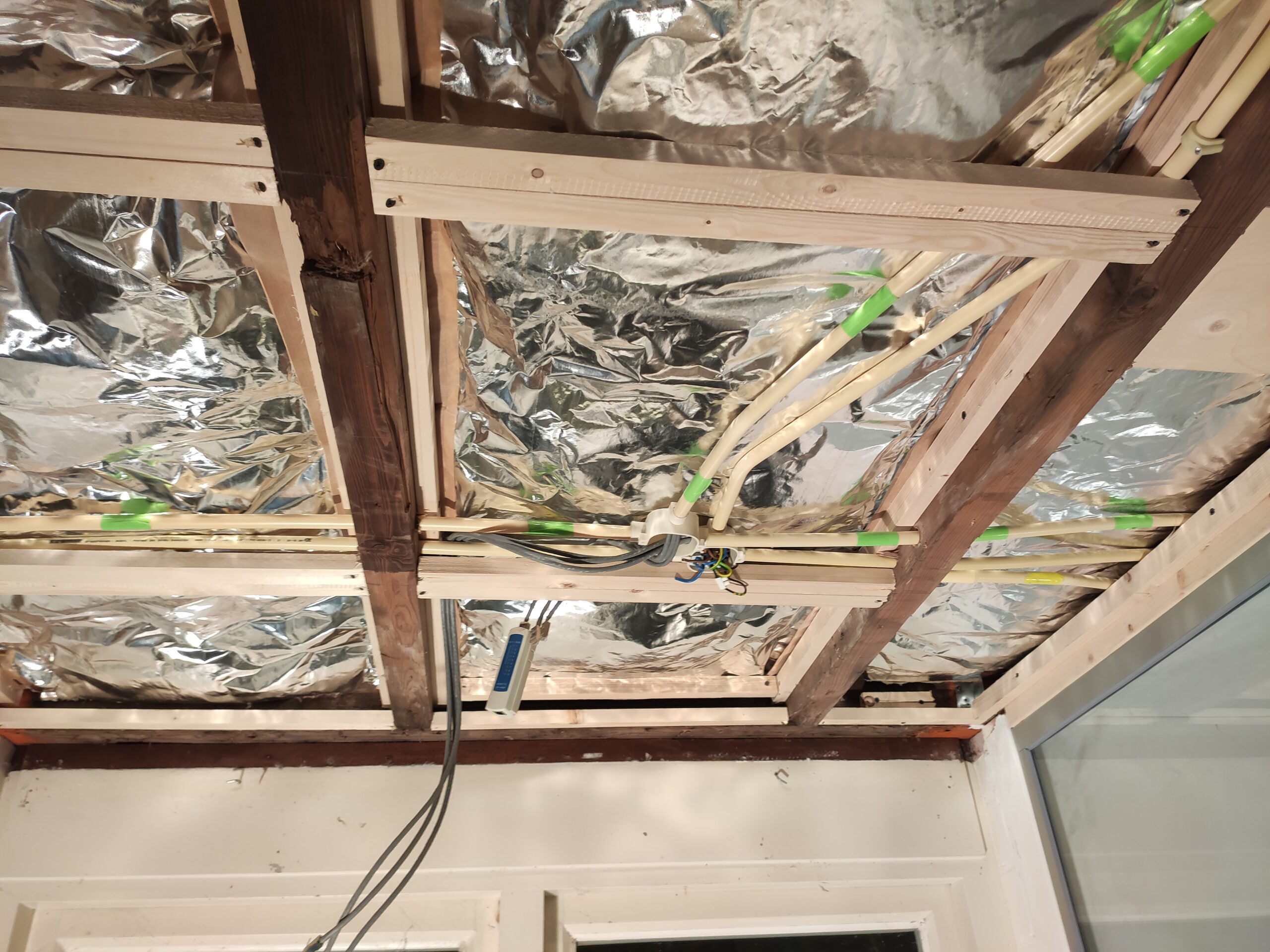 Om nog meer energie te besparen, en de temperatuur in de garage beter te kunnen reguleren, is het plafond geïsoleerd met steenwol. De oorspronkelijke elektra in de garage voldeed helaas niet om het kantoor en de werkplaats veilig te voorzien. Daarom is gekozen deze te vervangen voor een nieuw systeem waarbij stroom, internet en licht door gescheiden netwerken lopen.