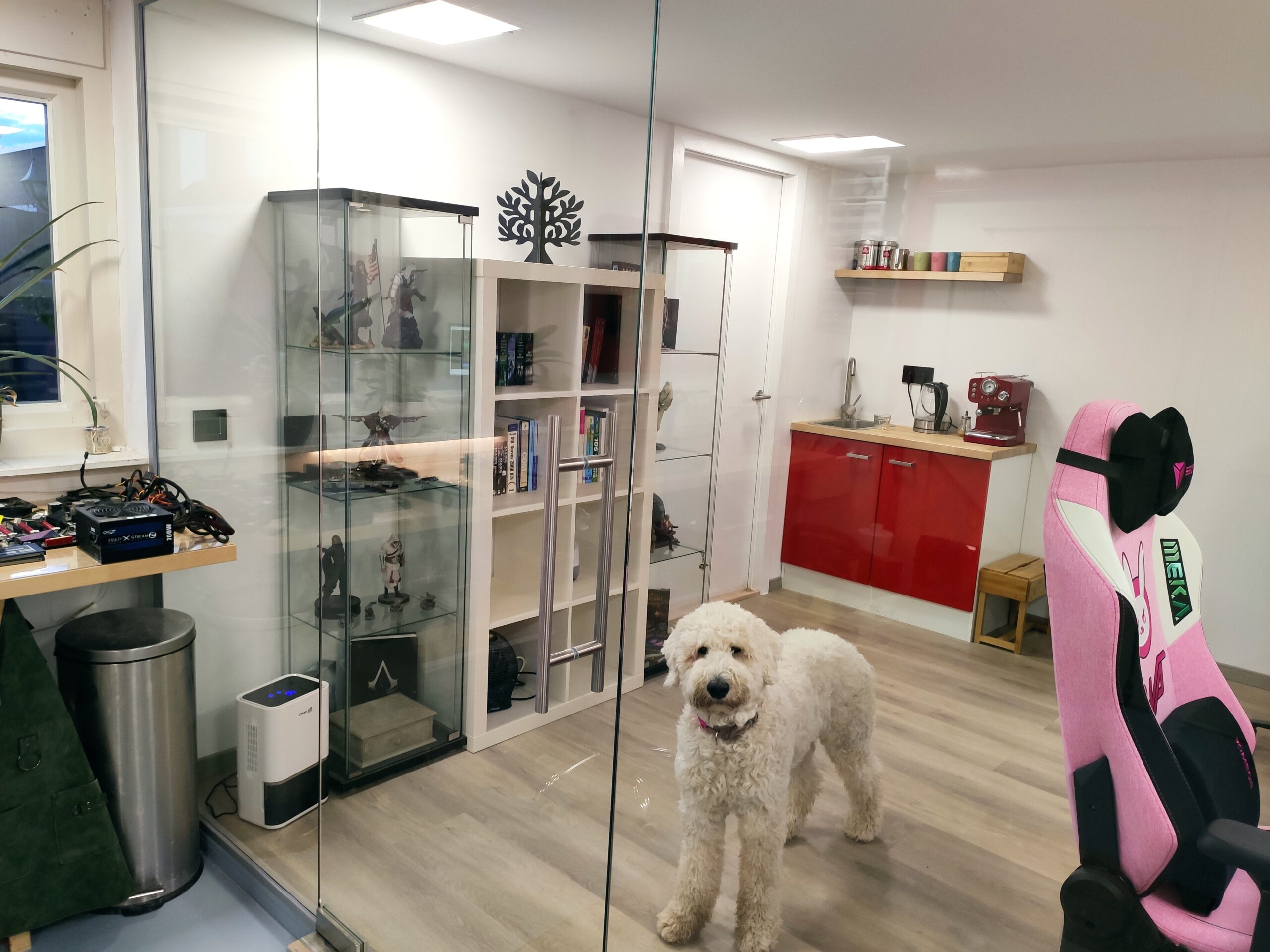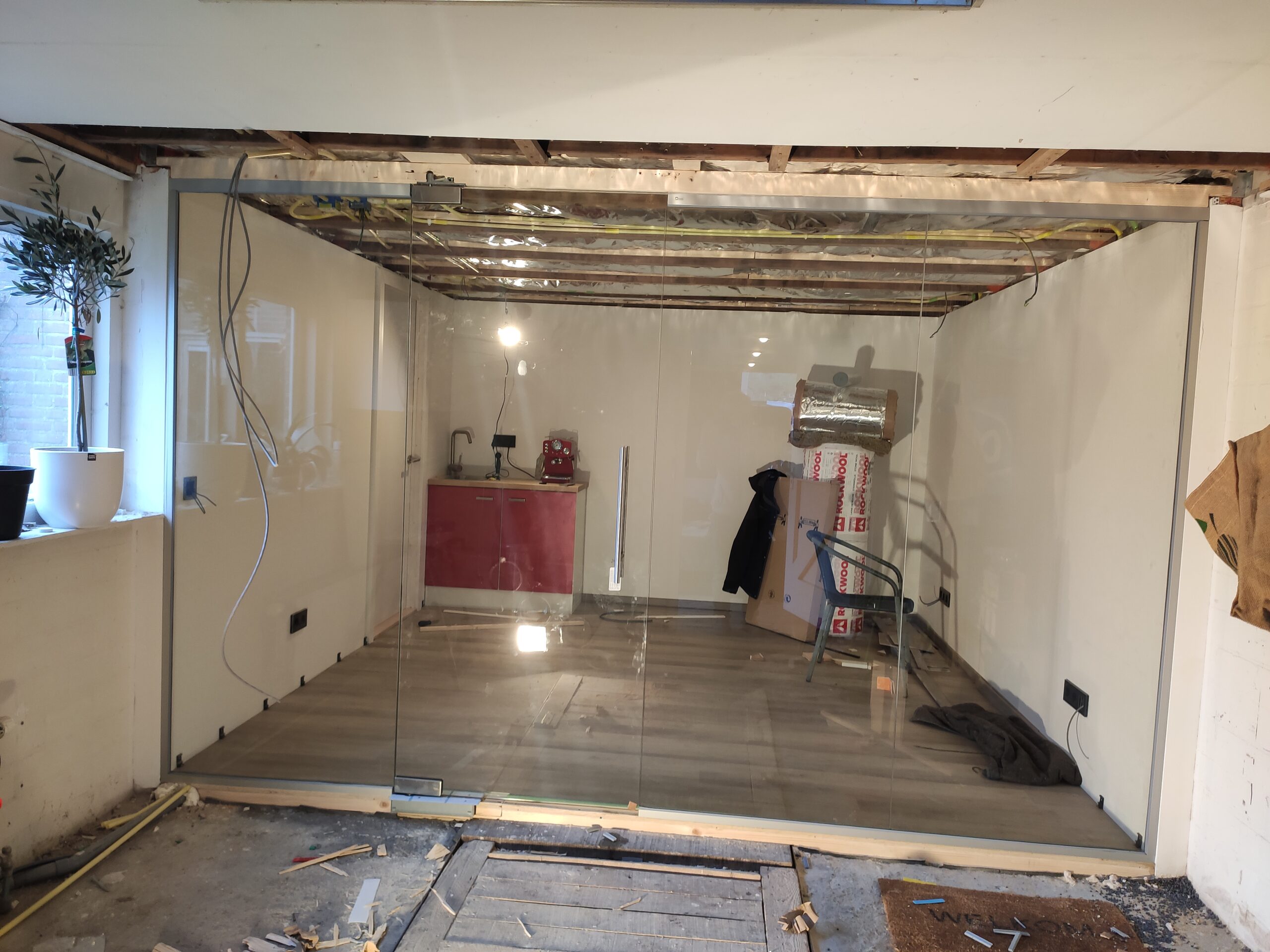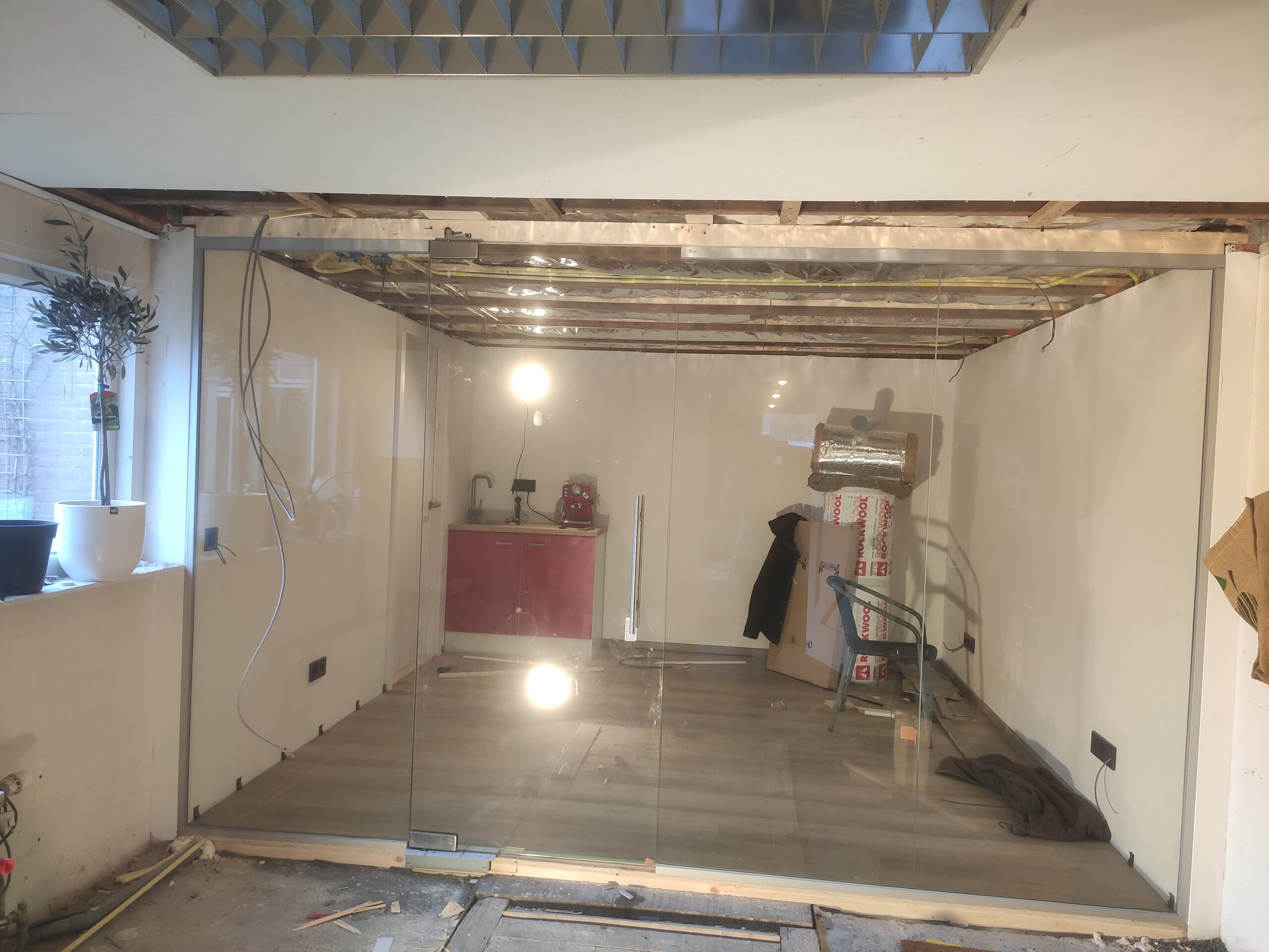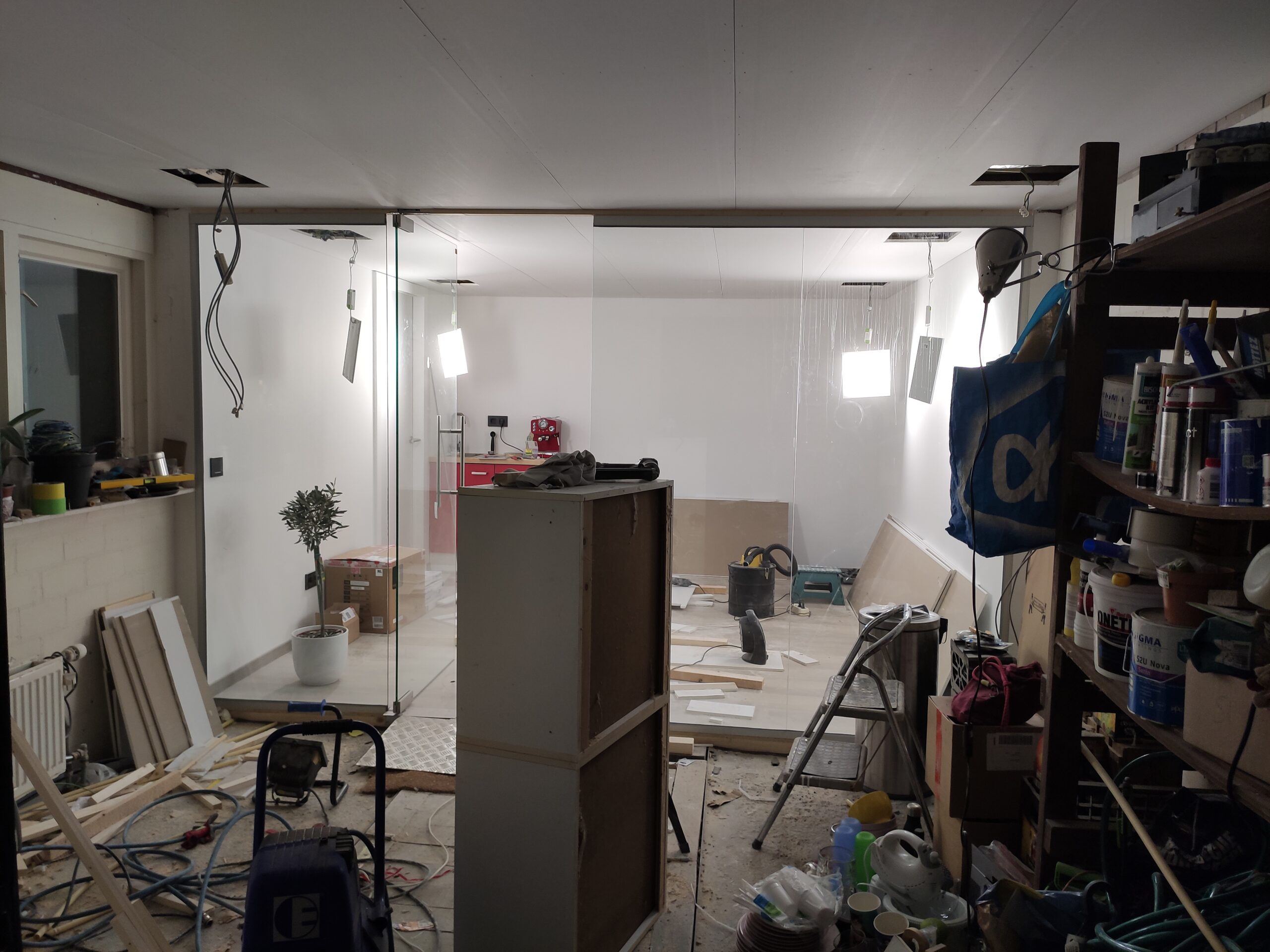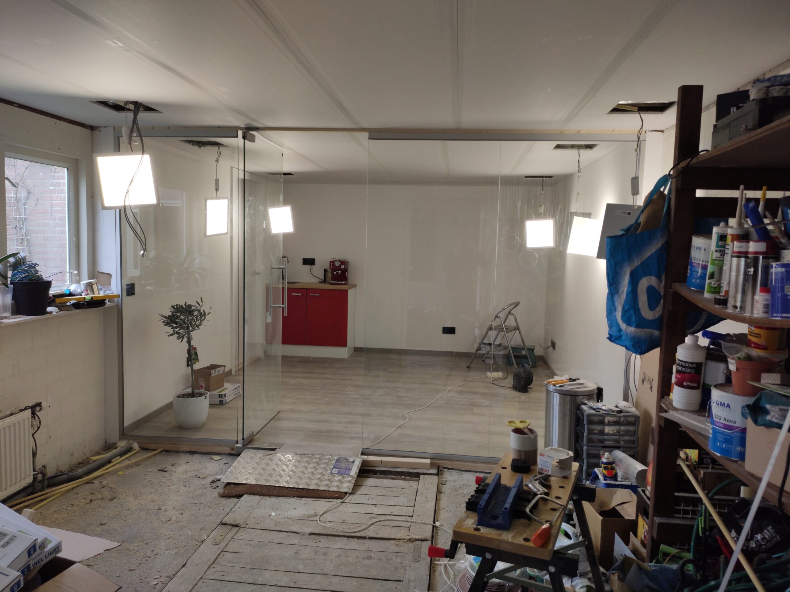 De garage is met zijn 23,5m2 erg ruim. Om te voorkomen dat, door de splitsing tussen kantoor en werkplaats, dit als twee kleine ruimtes gaat aanvoelen is gekozen een glazen afscheiding te laten plaatsen. In verband met de verzekering, of het gebrek hieraan, is deze wand door een professioneel geplaatst. Het resultaat mag er wezen!