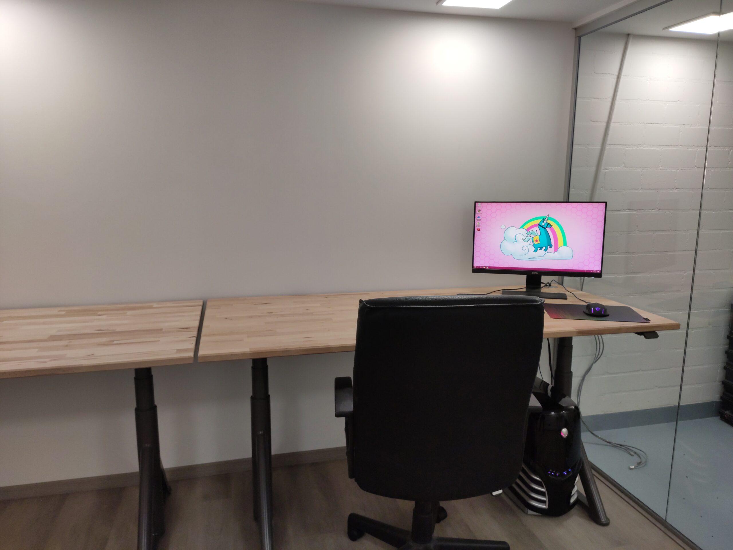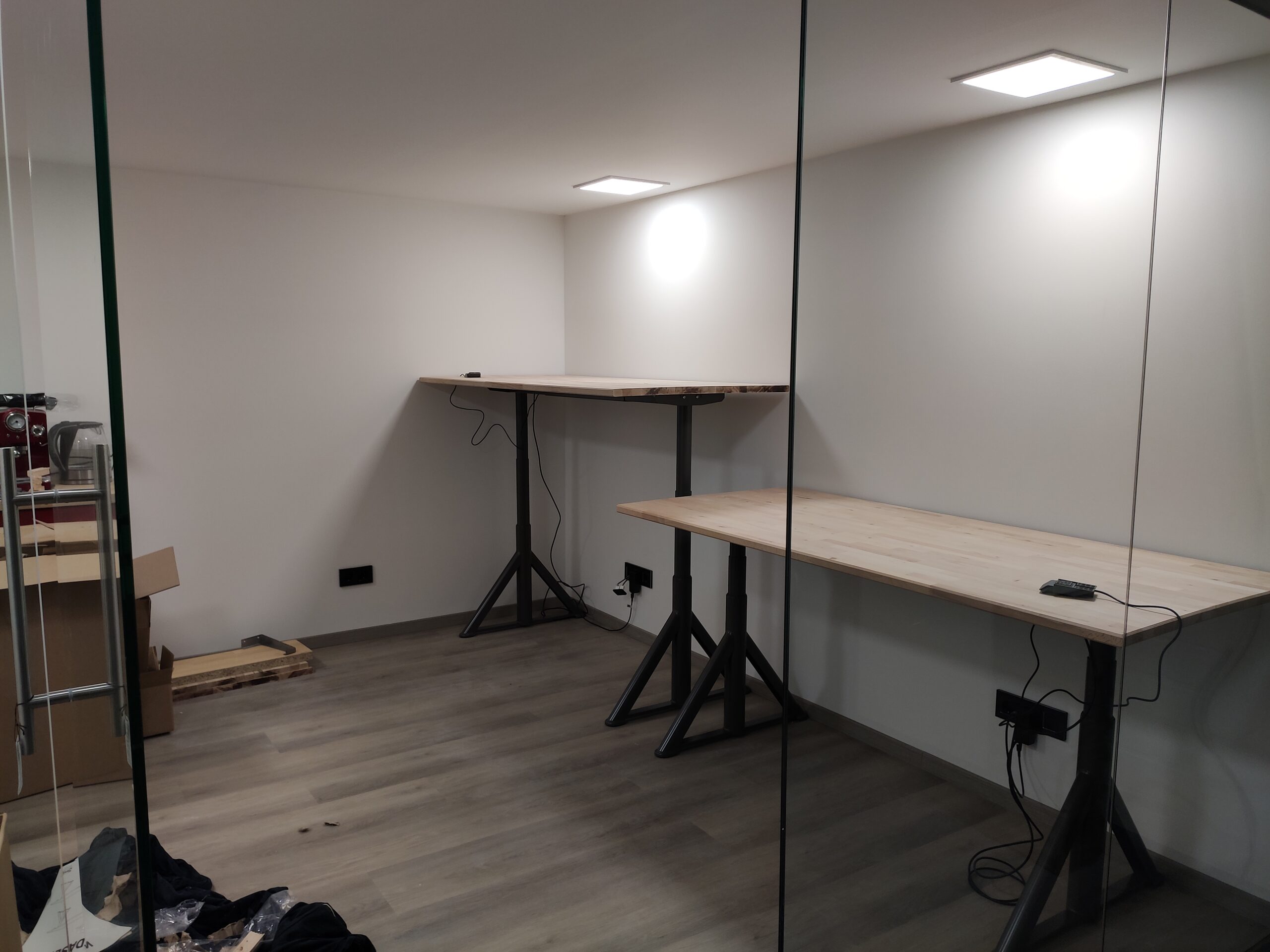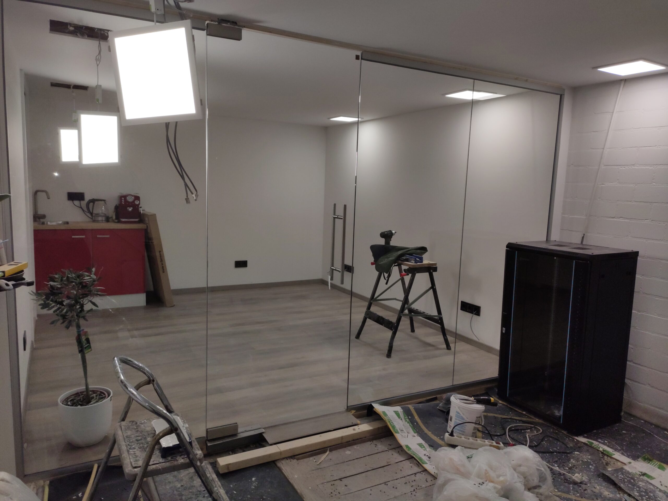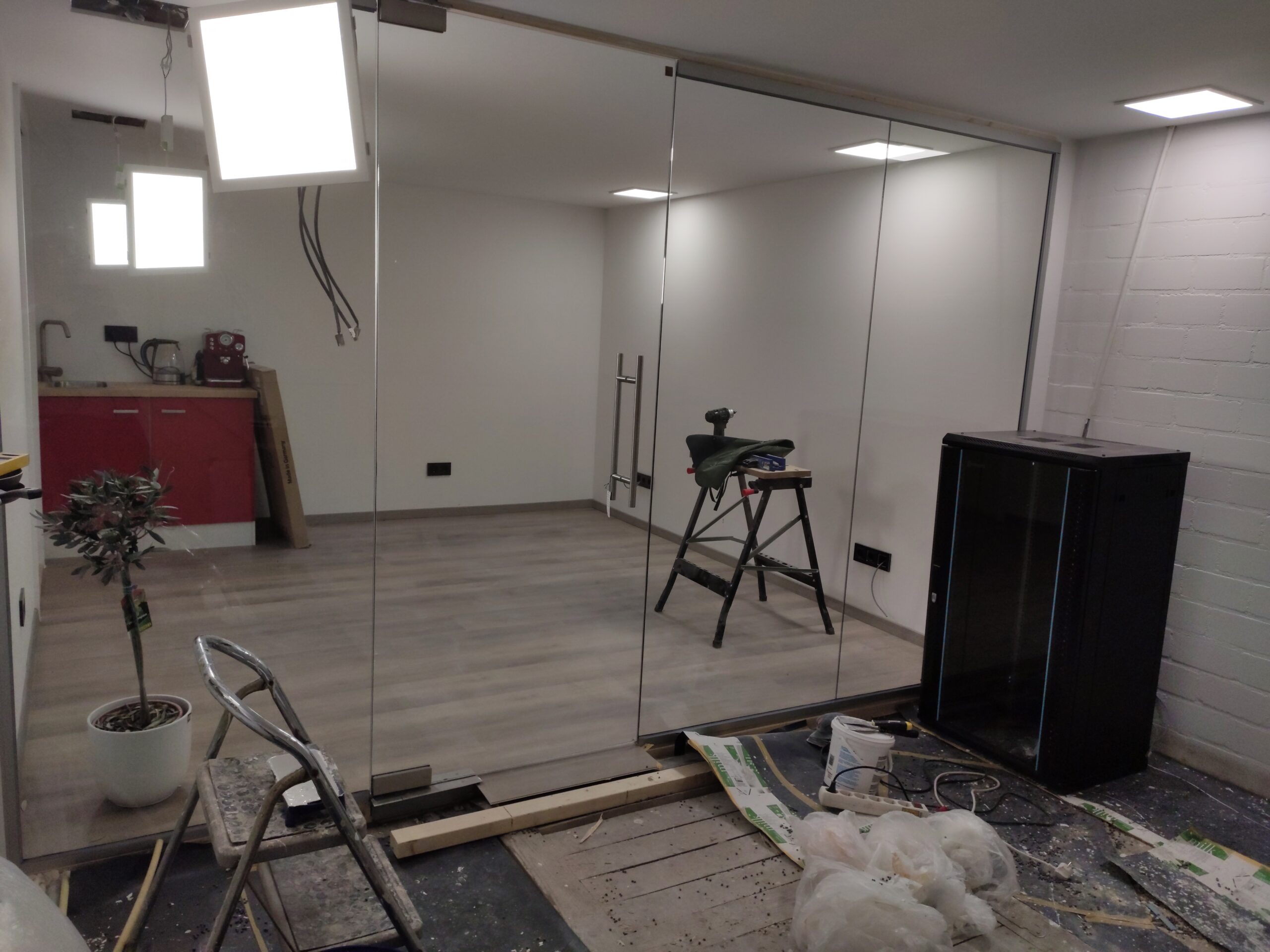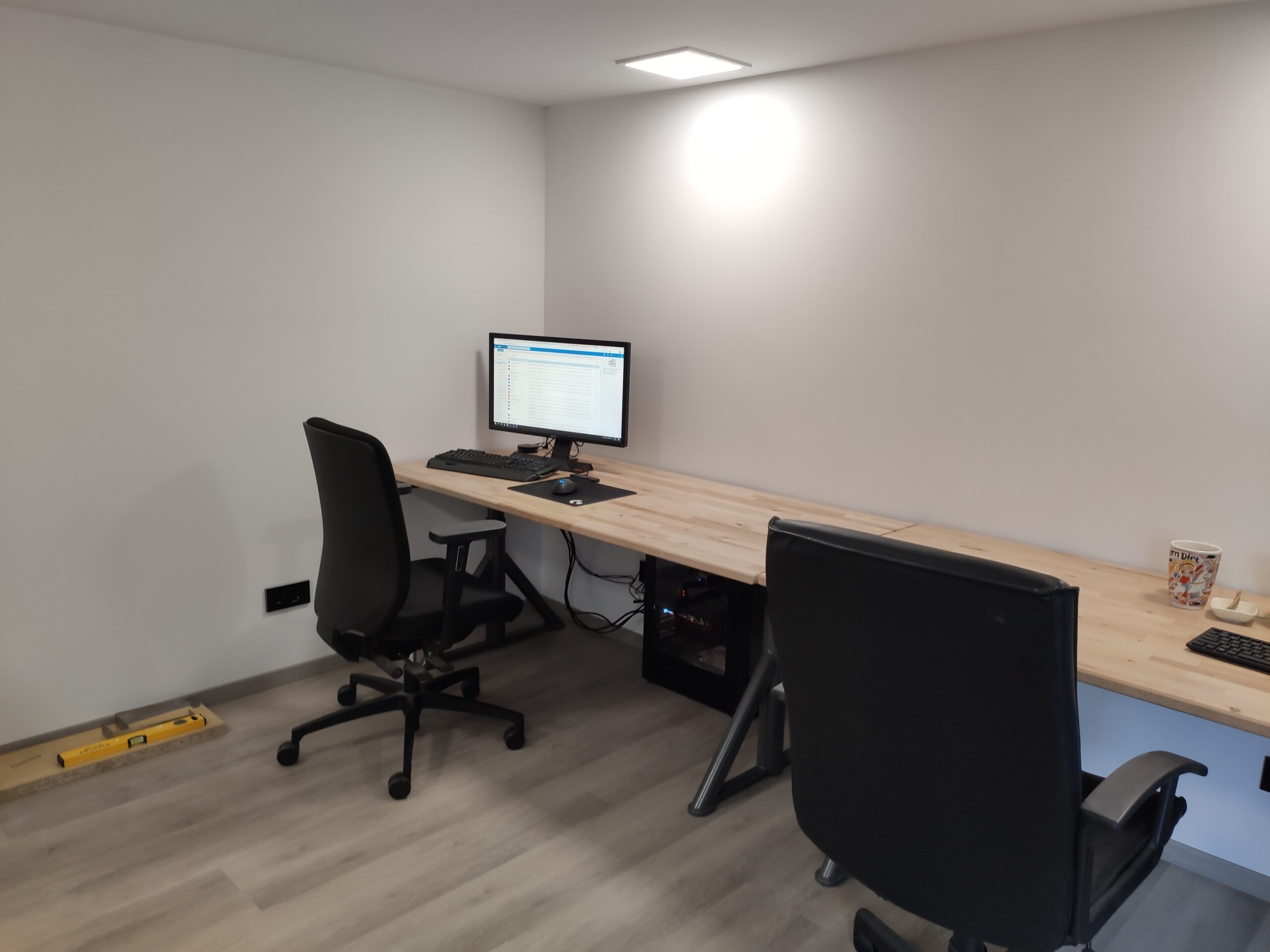 Om het kantoor een strakke look te geven, werden de wanden bekleed met gips. Hiervoor moest echter eerst een frame geplaatst worden waarbij al rekening gehouden is met de elektra.