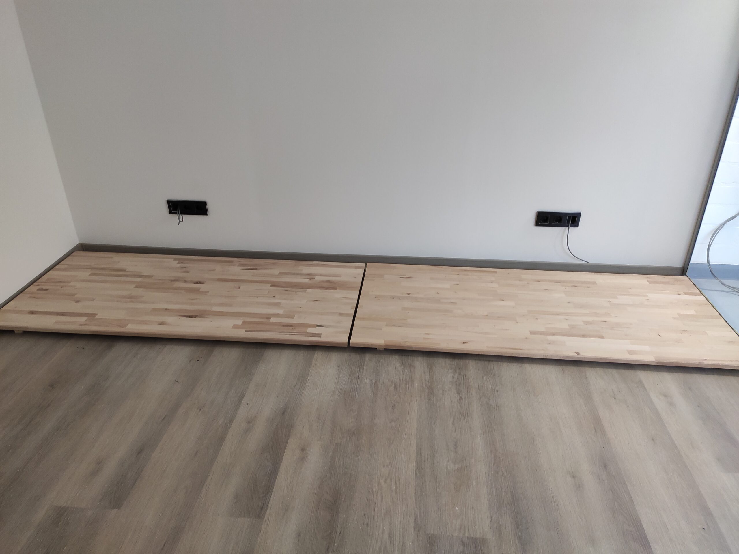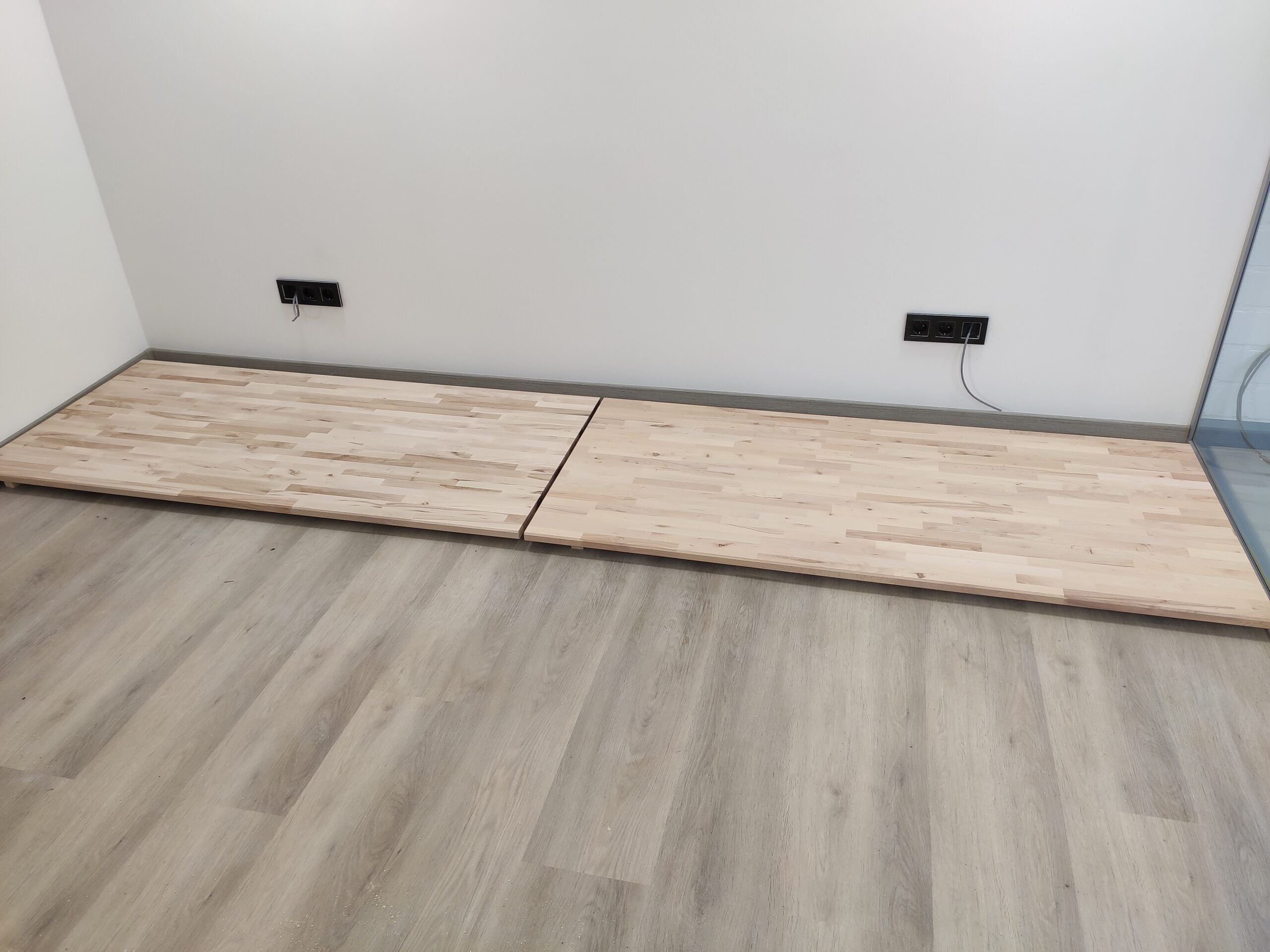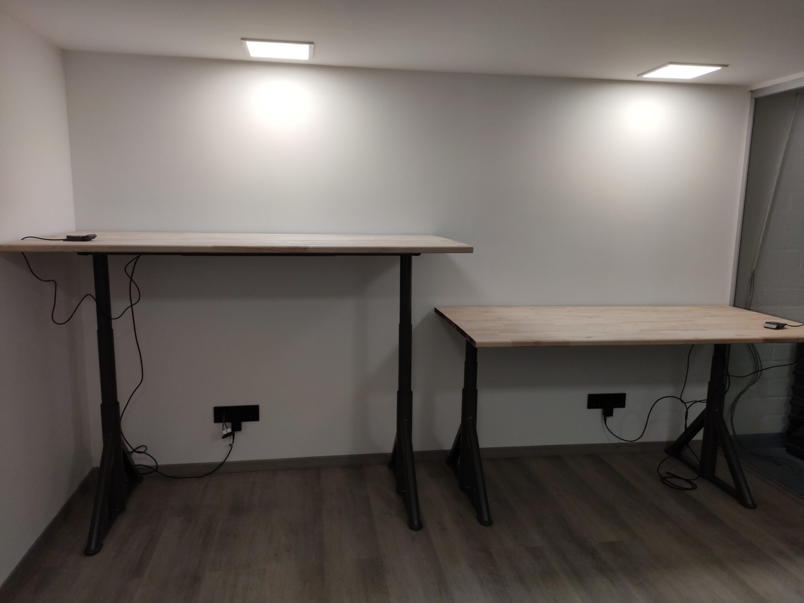 Niets in Gijs Grote Garageverbouwing© is standaard, en zo ook de bureaus niet. Om de stijl van het aanrecht en de eerder gemaakte schap aan te houden, is gekozen om 2 ruime bureaus te maken van beukenhout. Hiervoor zijn twee ruime tafelbladen gebruikt welke, na deze te lakken, dezelfde kleur en vingerlas-stijl hebben. Om het blad te dragen is voor een tweetal elektrisch verstelbare onderstellen gekozen. Hiermee kunnen de bureaus met een druk op een knop van hoogte gewijzigd worden.