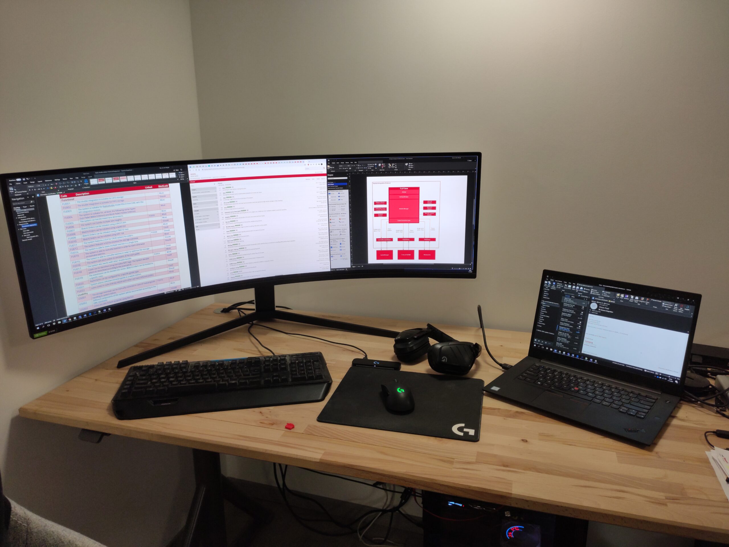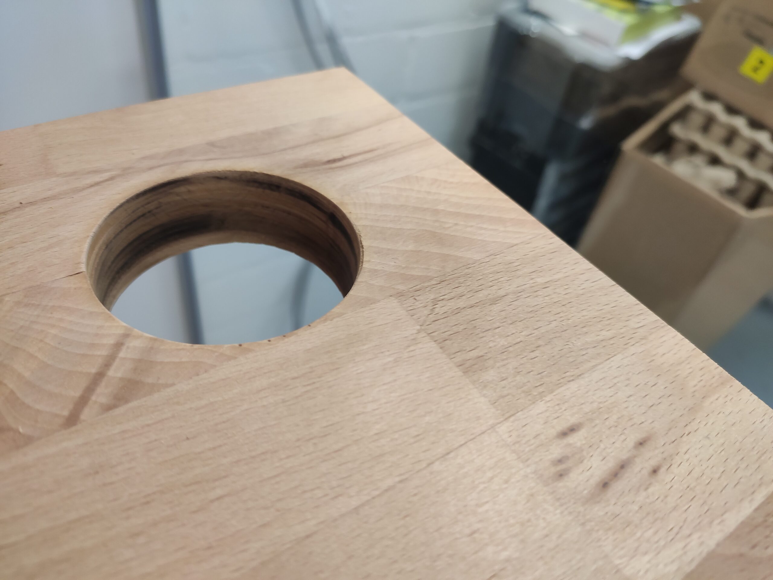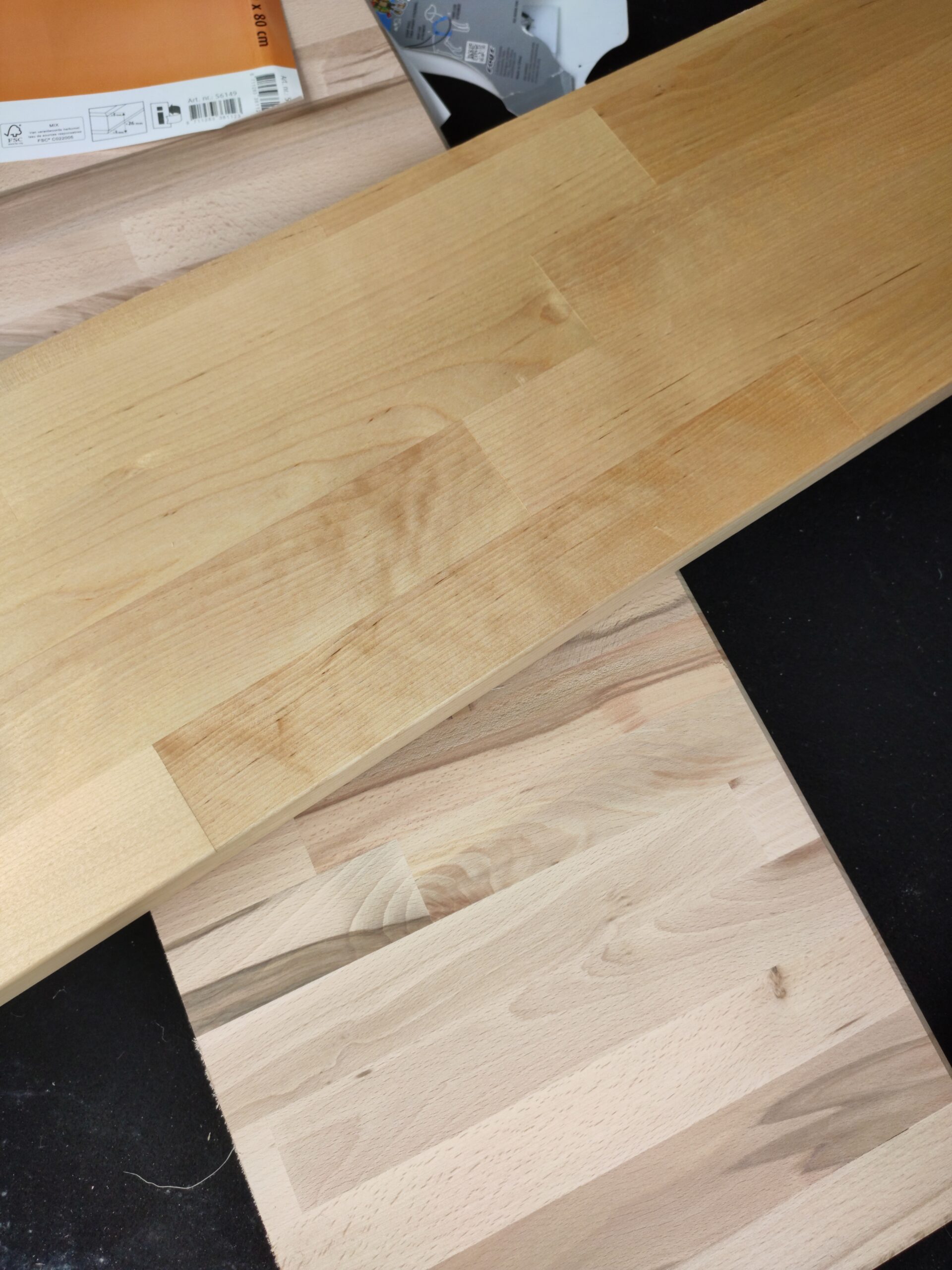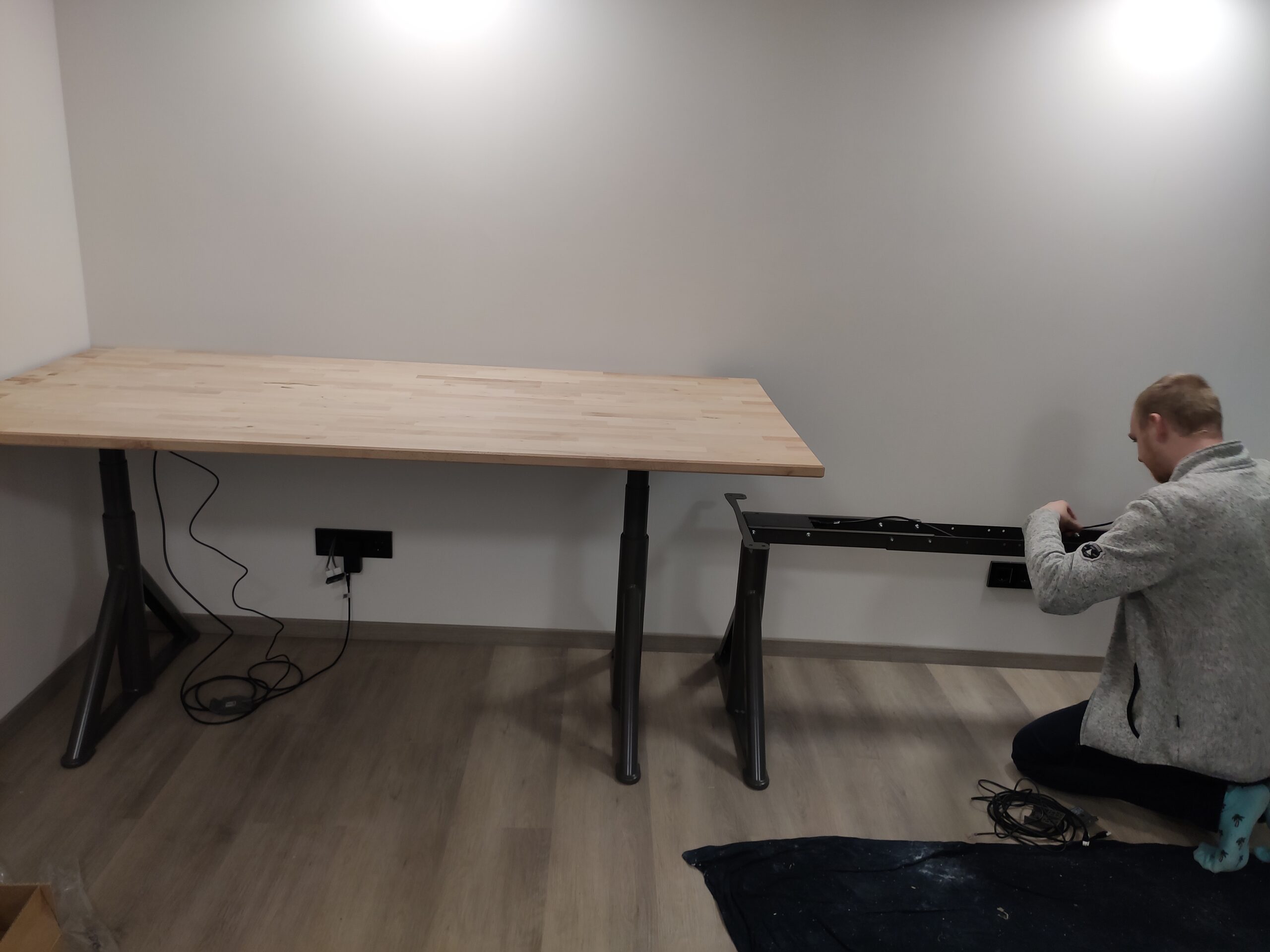 Niets in Gijs Grote Garageverbouwing© is standaard, en zo ook de bureaus niet. Om de stijl van het aanrecht en de eerder gemaakte schap aan te houden, is gekozen om 2 ruime bureaus te maken van beukenhout. Hiervoor zijn twee ruime tafelbladen gebruikt welke, na deze te lakken, dezelfde kleur en vingerlas-stijl hebben. Om het blad te dragen is voor een tweetal elektrisch verstelbare onderstellen gekozen. Hiermee kunnen de bureaus met een druk op een knop van hoogte gewijzigd worden.