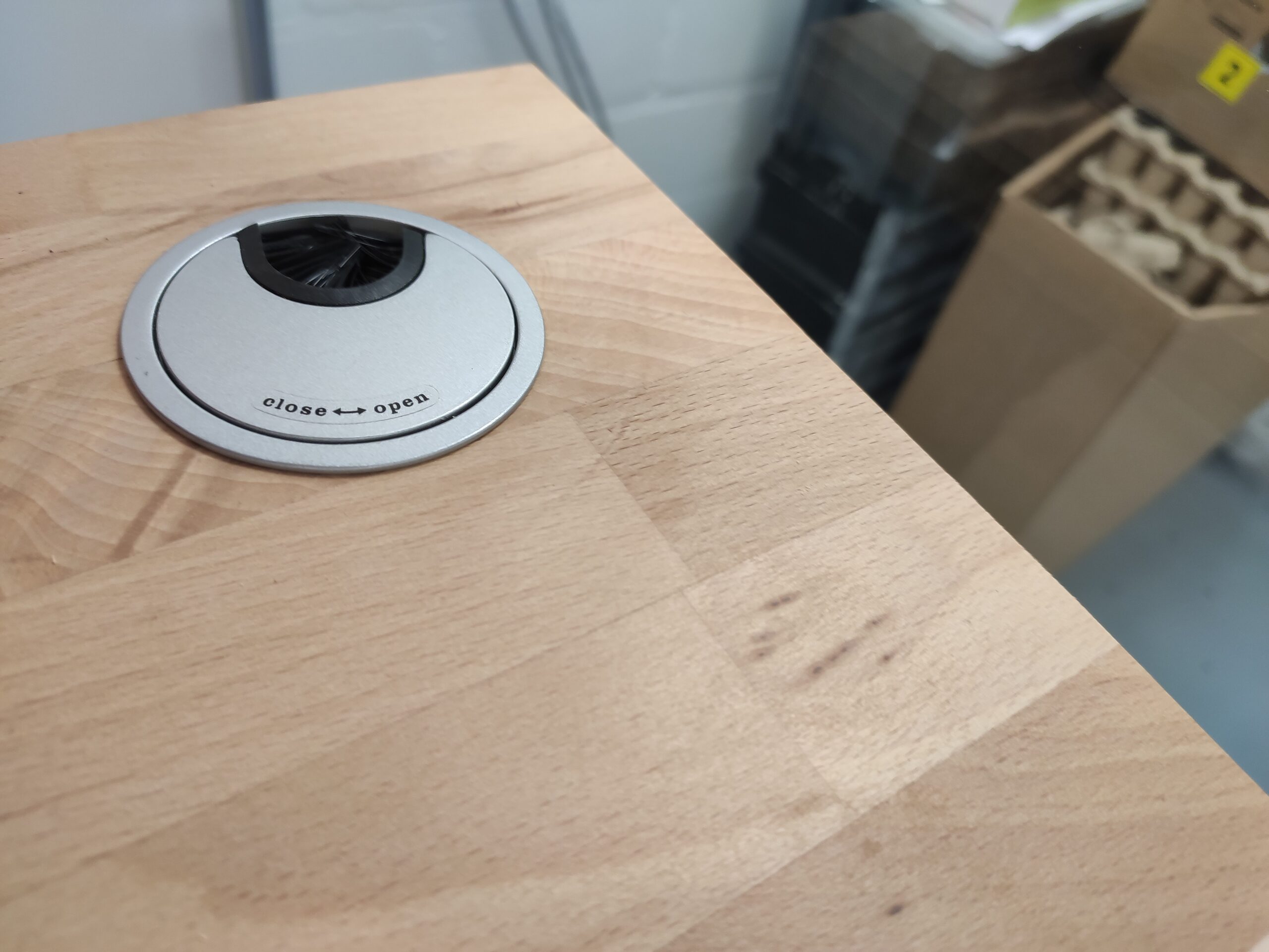 Doordat het werkblad omhoog en omlaag kan bewegen, kunnen kabels bekneld raken tussen de muur en het werkblad. Om dit te voorkomen wordt een robuust metalen kabeldoorvoer geplaatst in ieder werkblad.