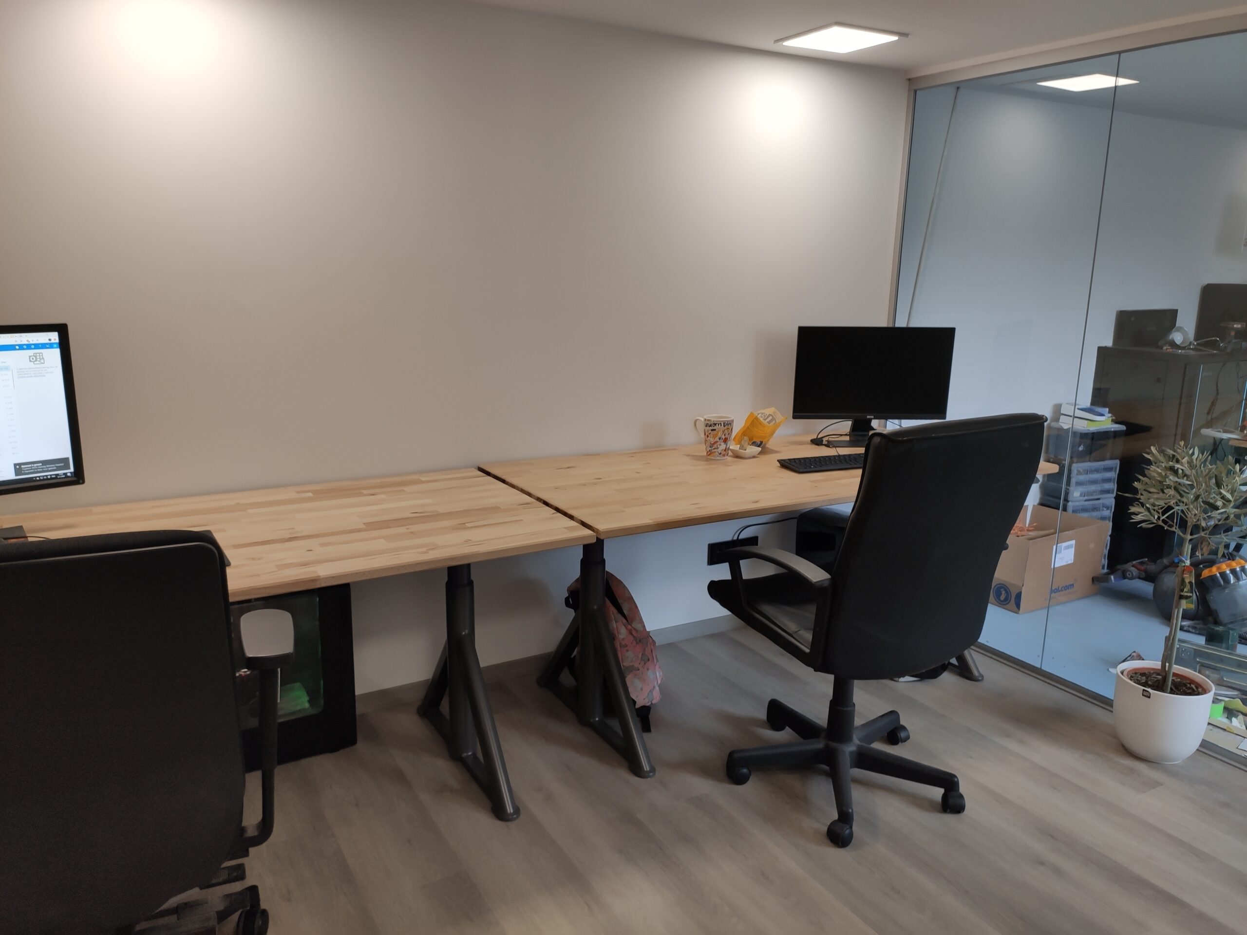 Omdat de vloer in het kantoor ernstig te lijden krijgt onder het rollen van bureaustoelen en het binnenlopen van zand, is gekozen voor een stevige PVC vloer. Deze vloeren zijn eenvoudig schoon te maken en zijn sterker dan laminaat en de meeste houtsoorten.