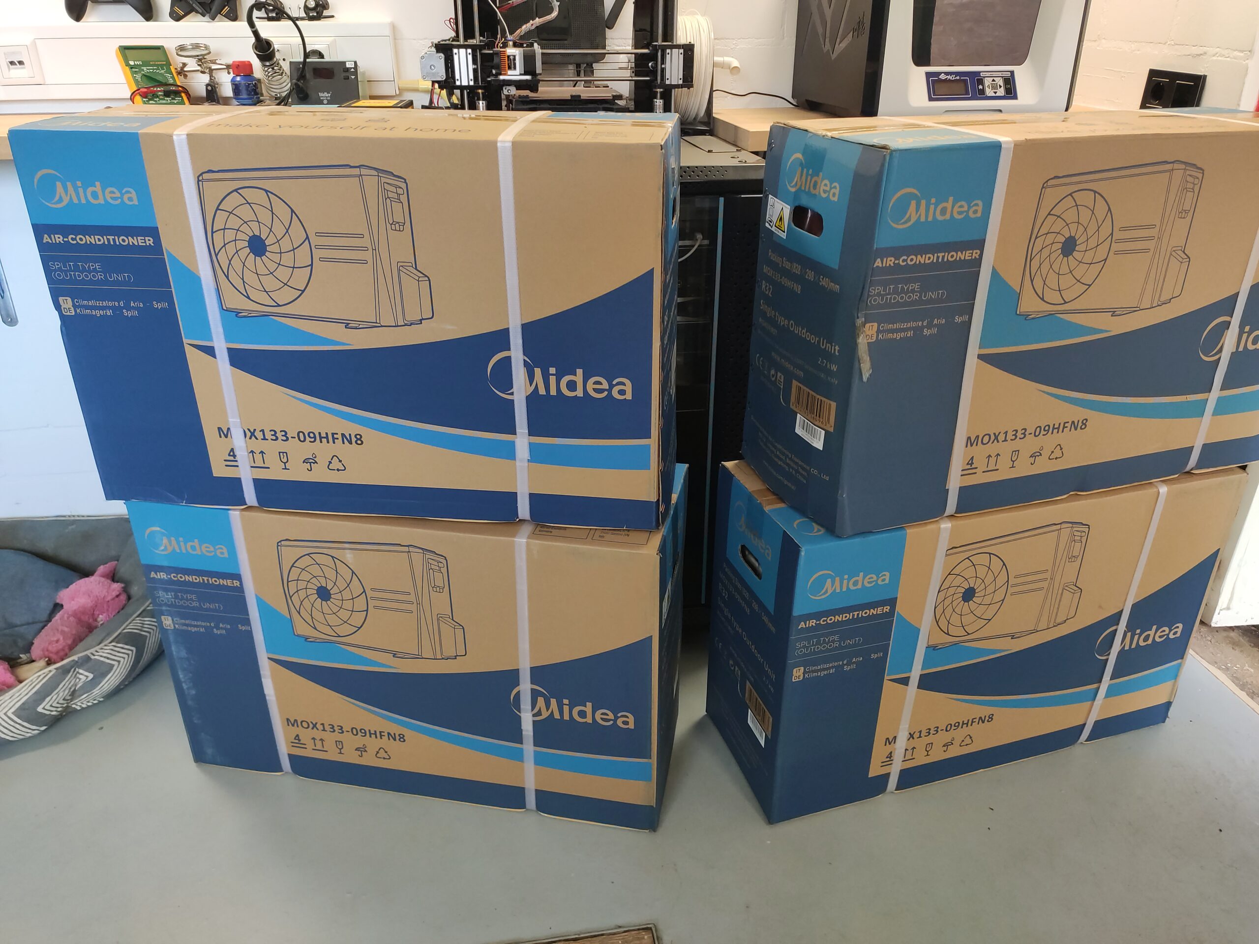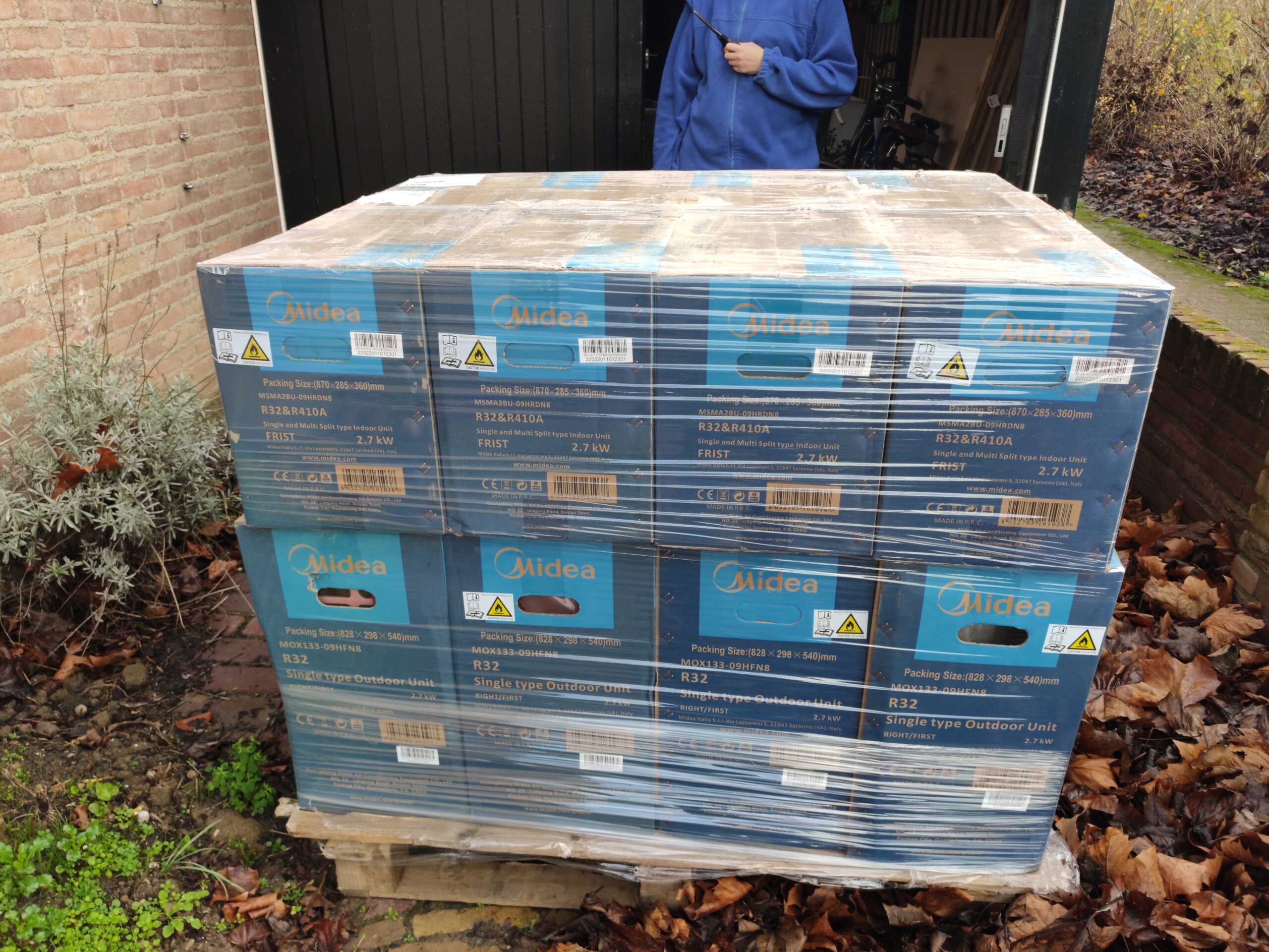 Omdat er maximaal vier airco’s op een pallet passen heeft Gijs besloten er vier te bestellen en zo de verzendkosten te splitsen. De overige drie airco’s verkoopt hij door.