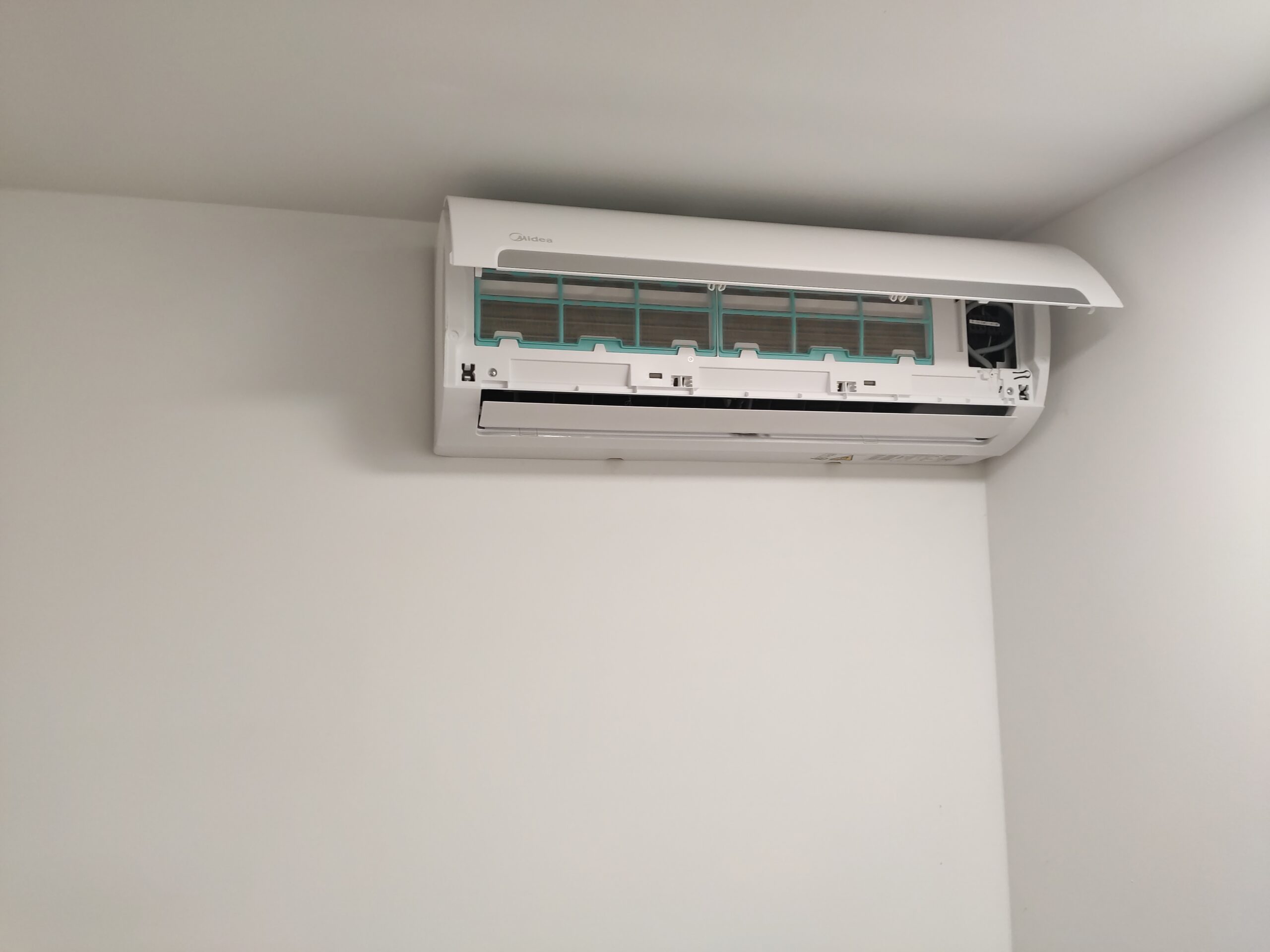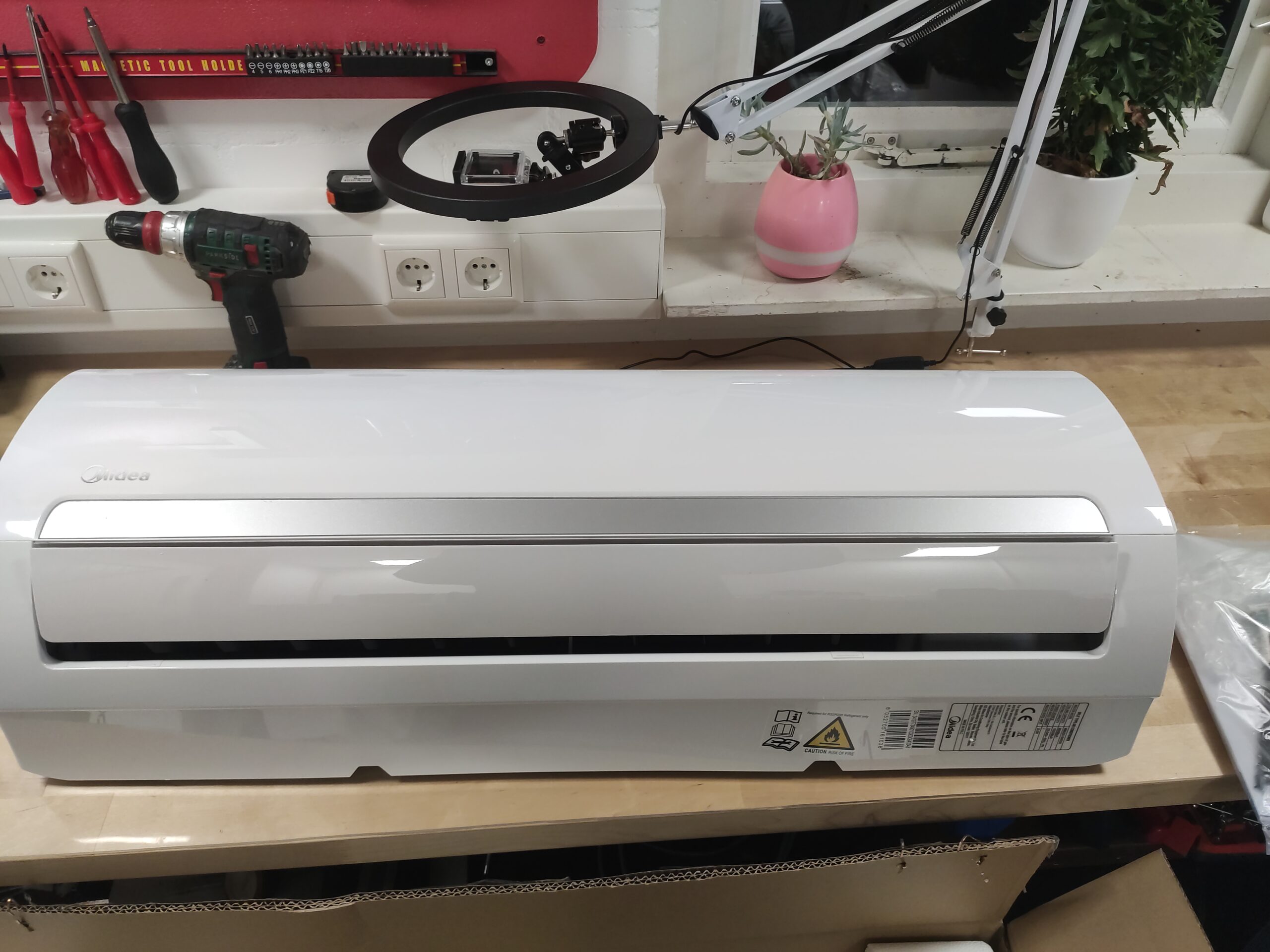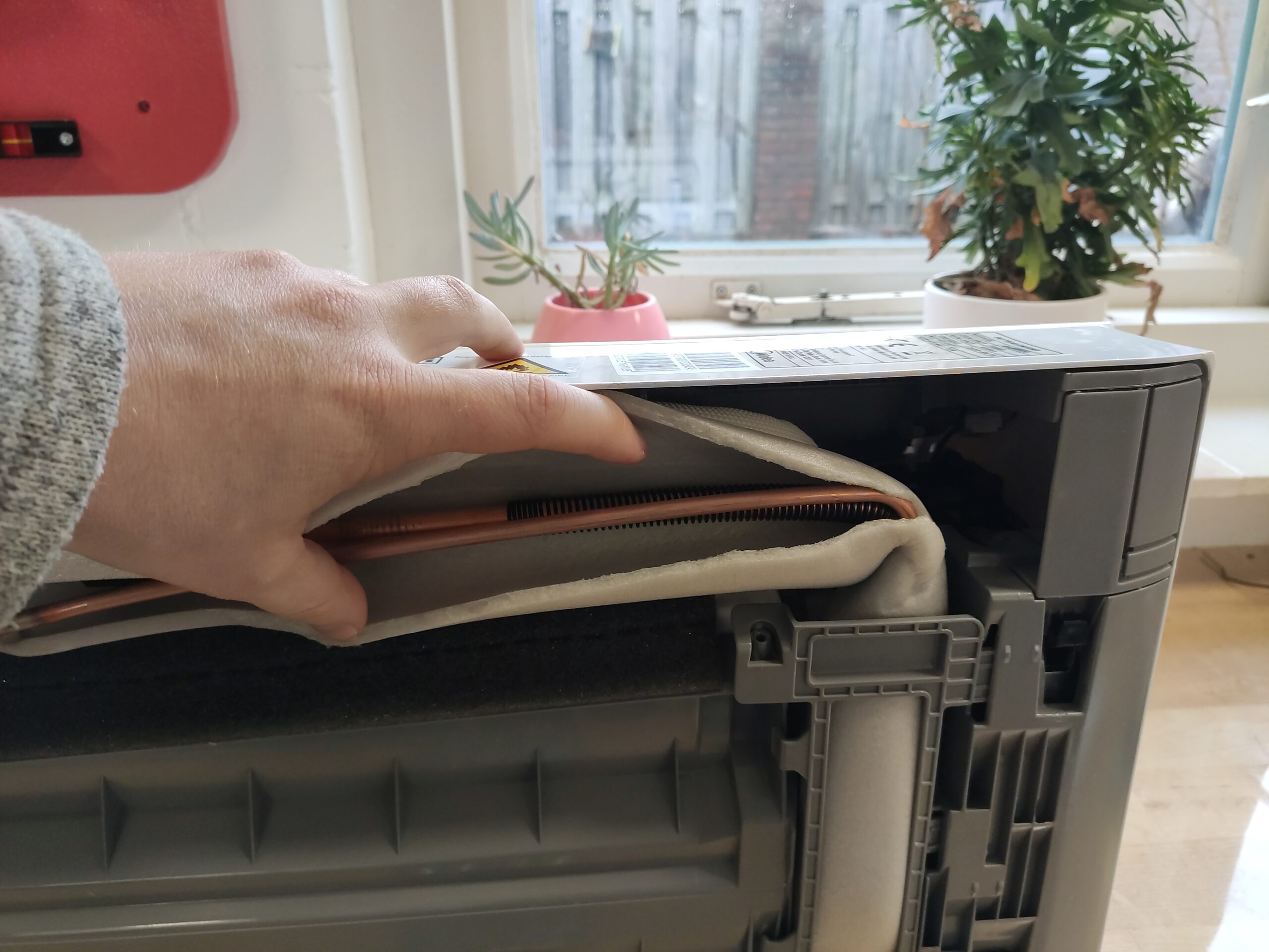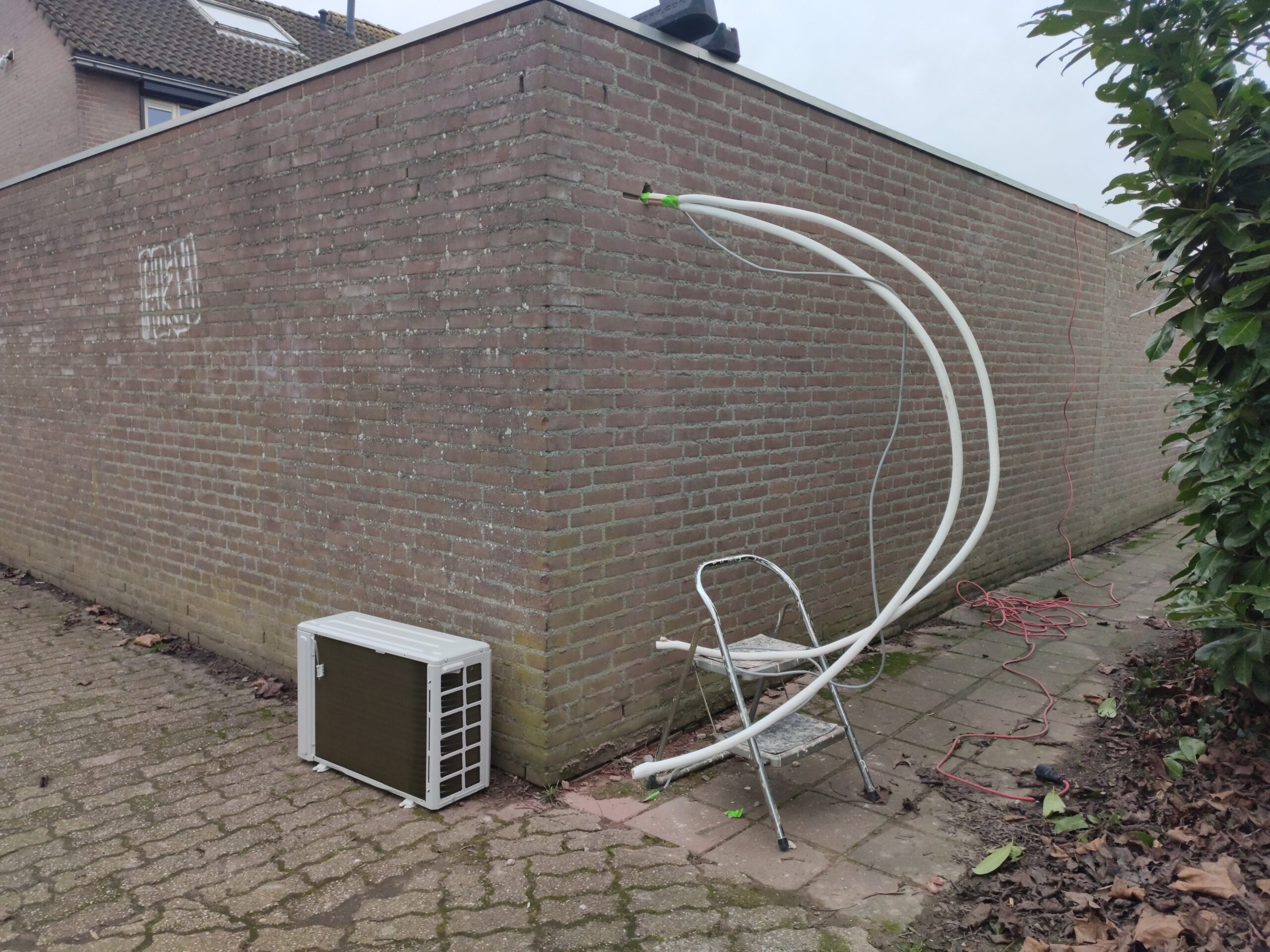 Het installeren van een airco is eigenlijk een koud kunstje (pun intended). De binnen-unit wordt met een speciaal mechanisme aan de muur gehangen. Uit de binnen-unit komen drie leidingen en een kabel, Gijs werkt deze weg door een gat van ongeveer 6 centimeter achter de binnen-unit in zijn muur boren. Hiervoor gebruikt hij een zogenaamde droogboor.