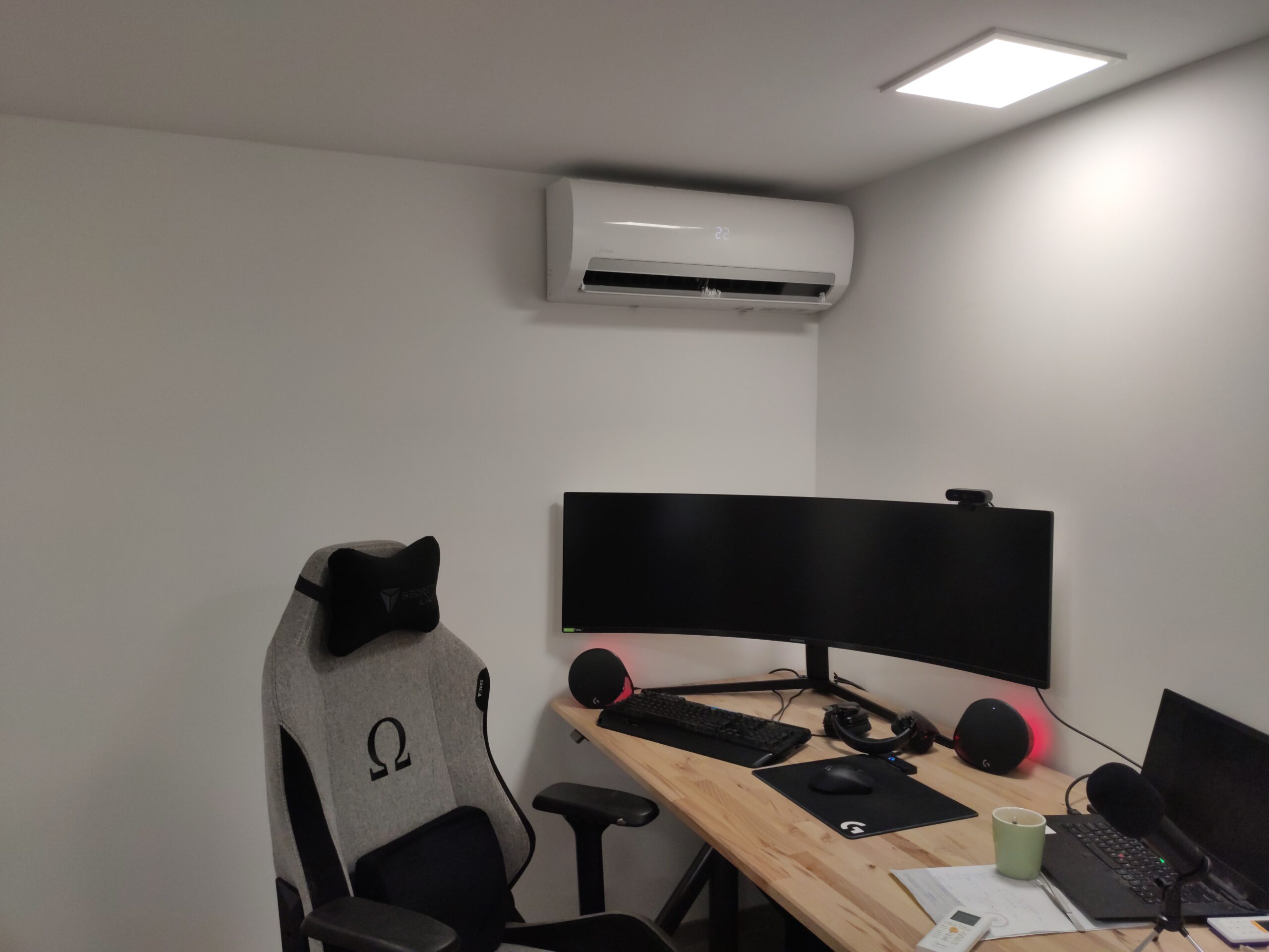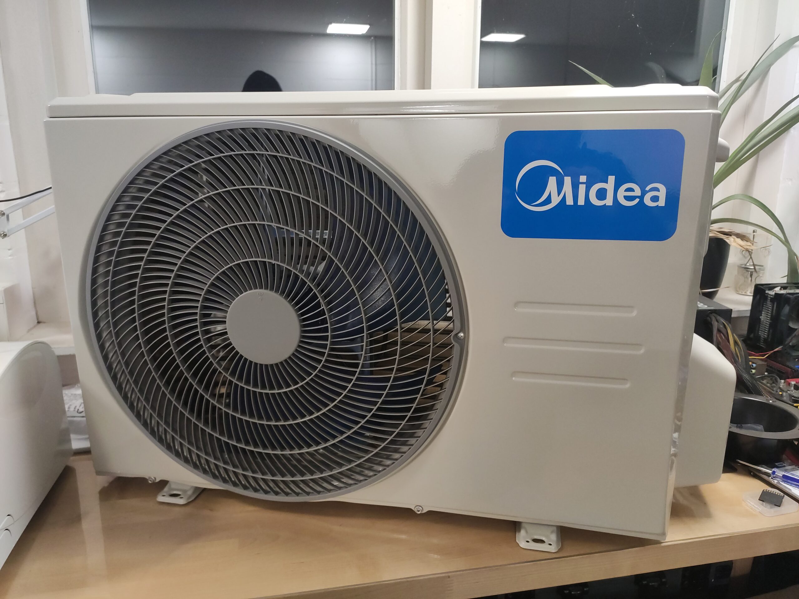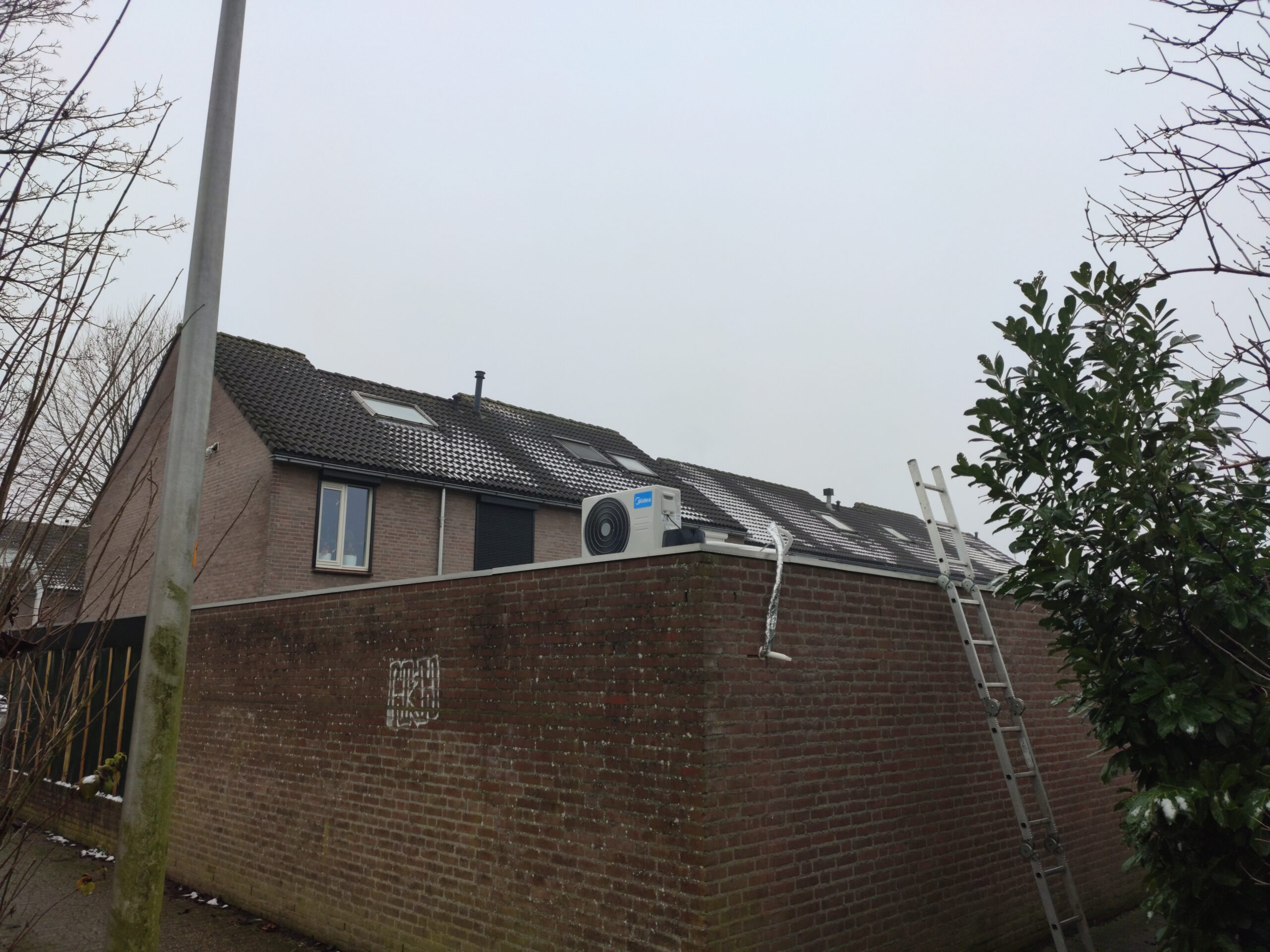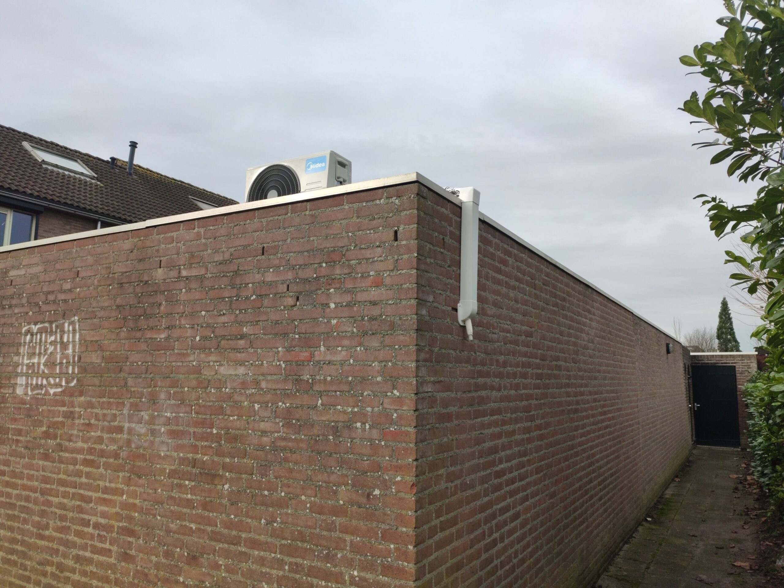 Een nadeel aan de garage, is dat het een plat bitumen dak heeft. Dit betekend dat de garage in de zomer, ondanks alle isolatie, erg warm kan worden. Om er toch comfortabel bij te zitten heeft Gijs besloten een airco te installeren. Een bijkomend voordeel is dat veel airco’s tegenwoordig ook in staat zijn om te verwarmen, en hierbij een zeer hoog rendement behalen. Door het plaatsen van zo’n airco zit Gijs er ook in de winter warmpjes bij.