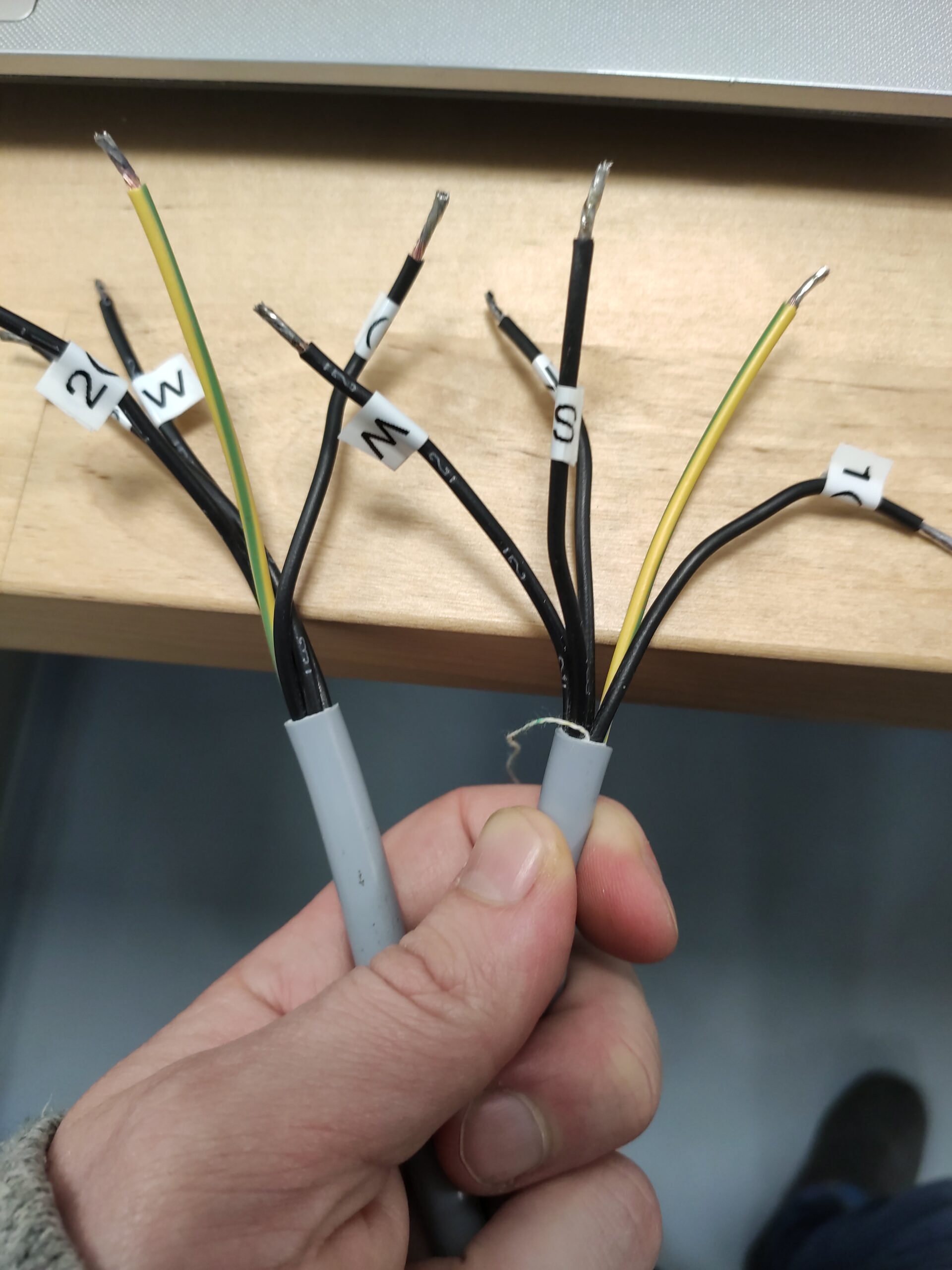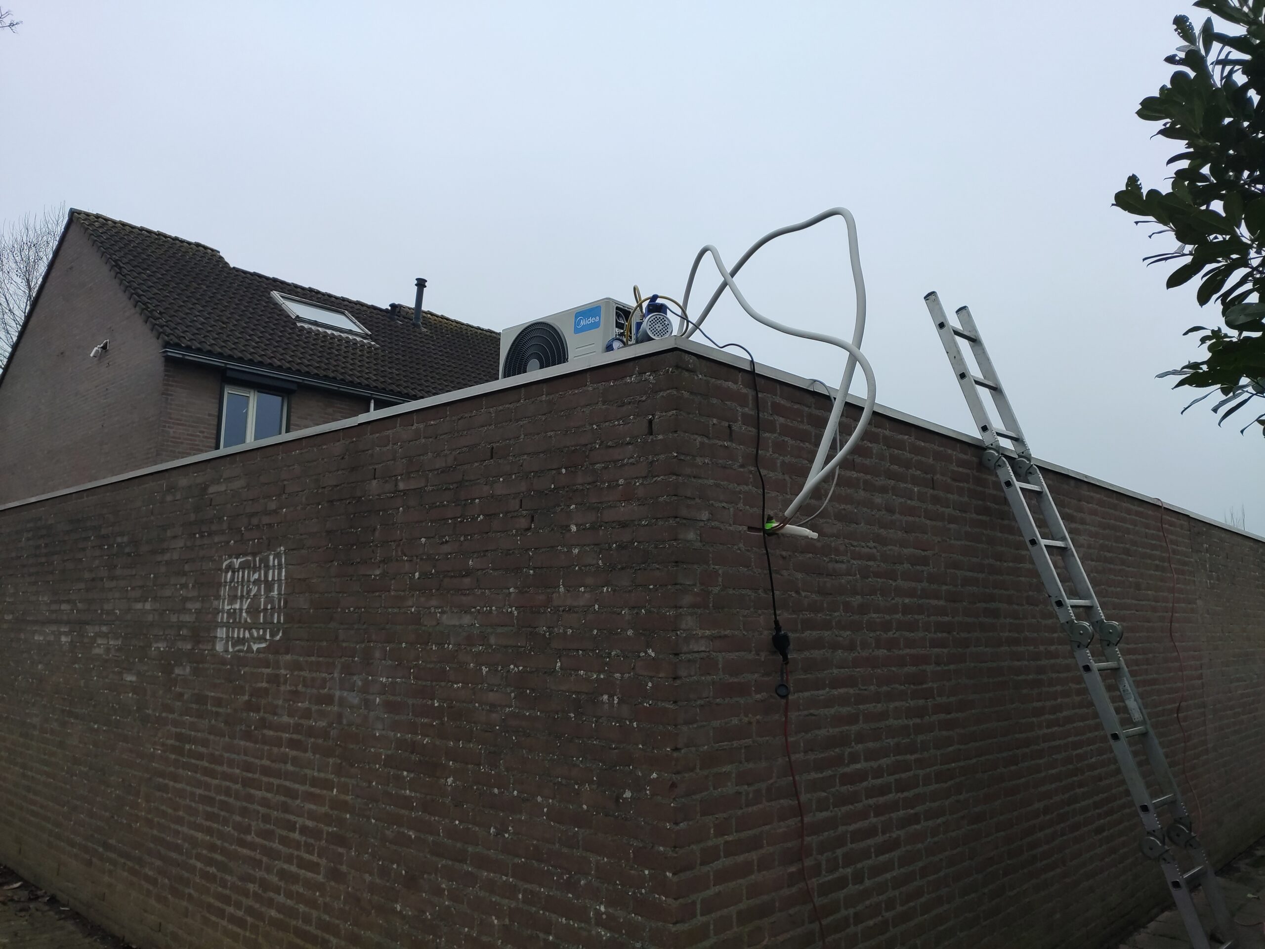 Tot slot is er de kabel om de binnen en buiten unit met elkaar te verbinden. De binnen-unit wordt van stroom voorzien via de buiten-unit en de twee units moeten ook met elkaar communiceren. Daarom is er een vijf aderige kabel om beide units met elkaar te verbinden. Voor de duidelijkheid heeft Gijs de kabels vooraf gelabeld.