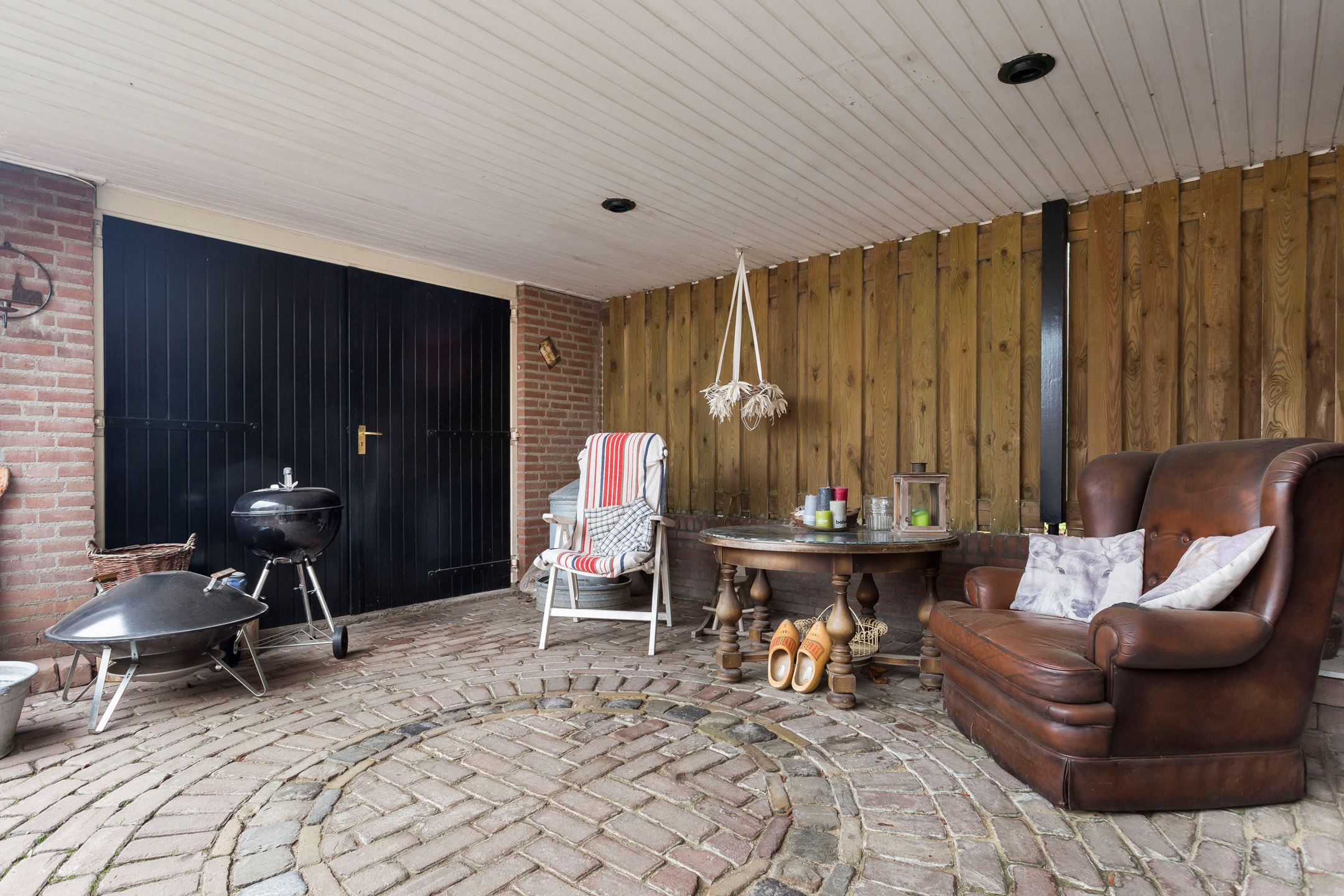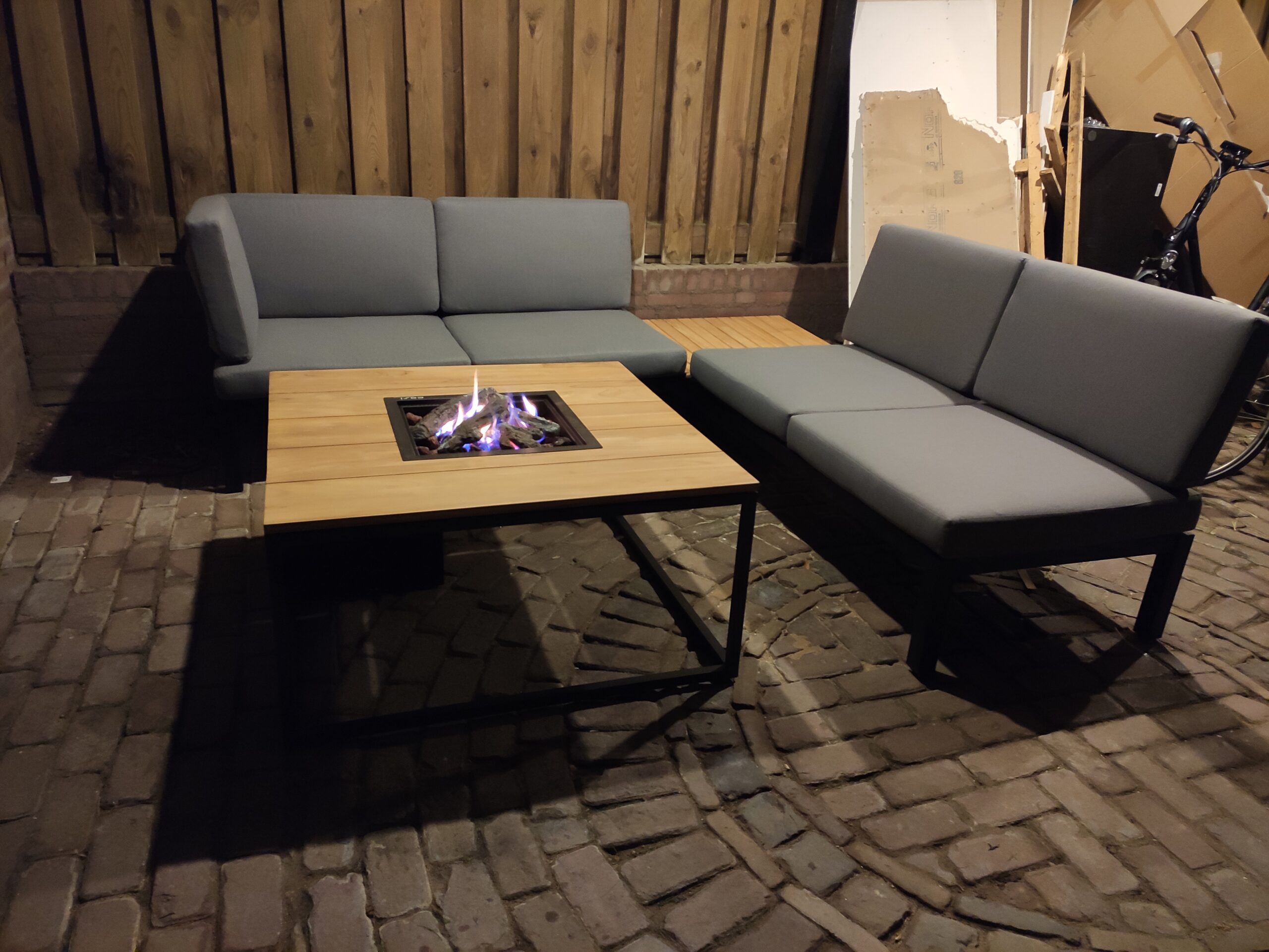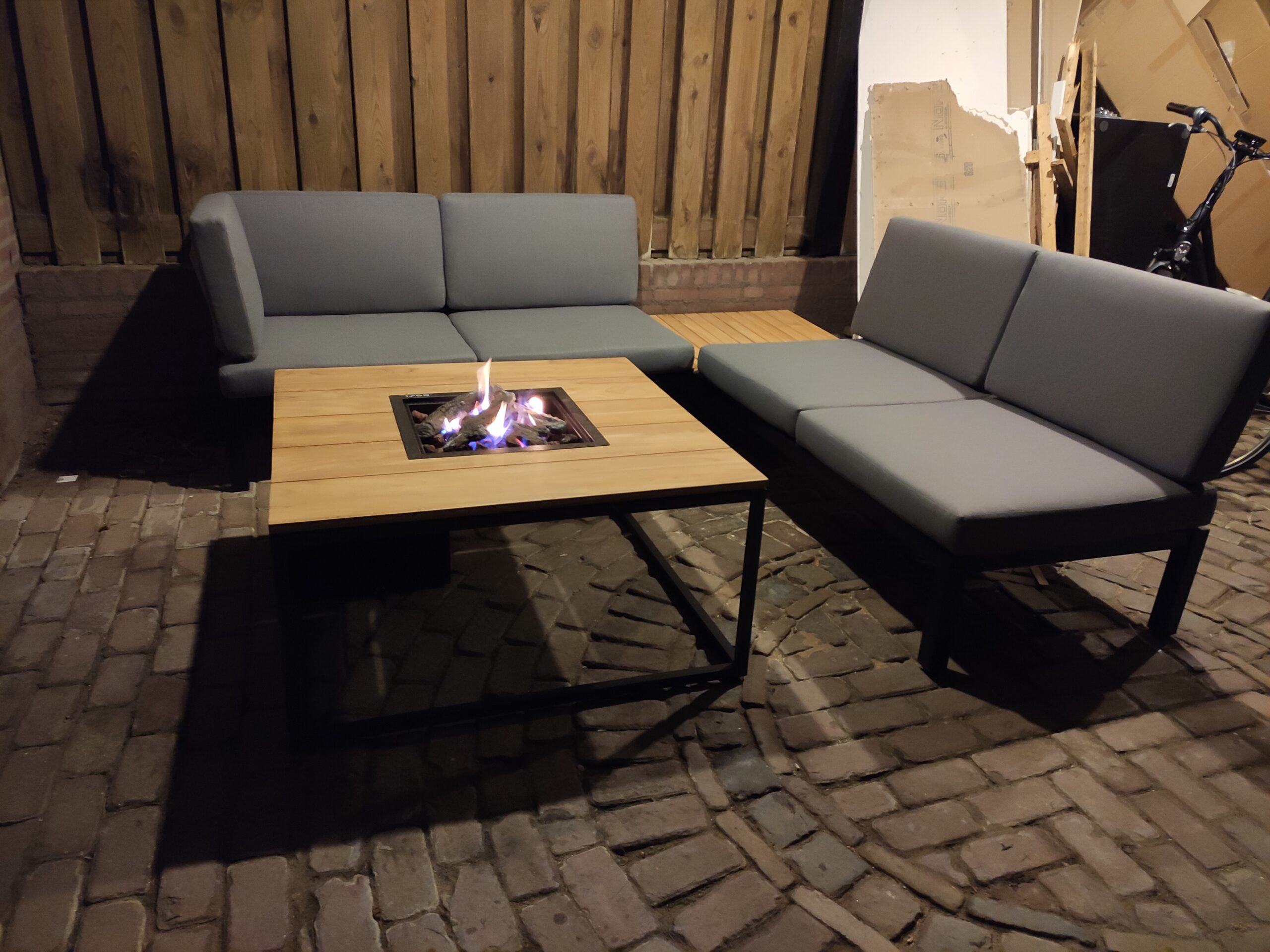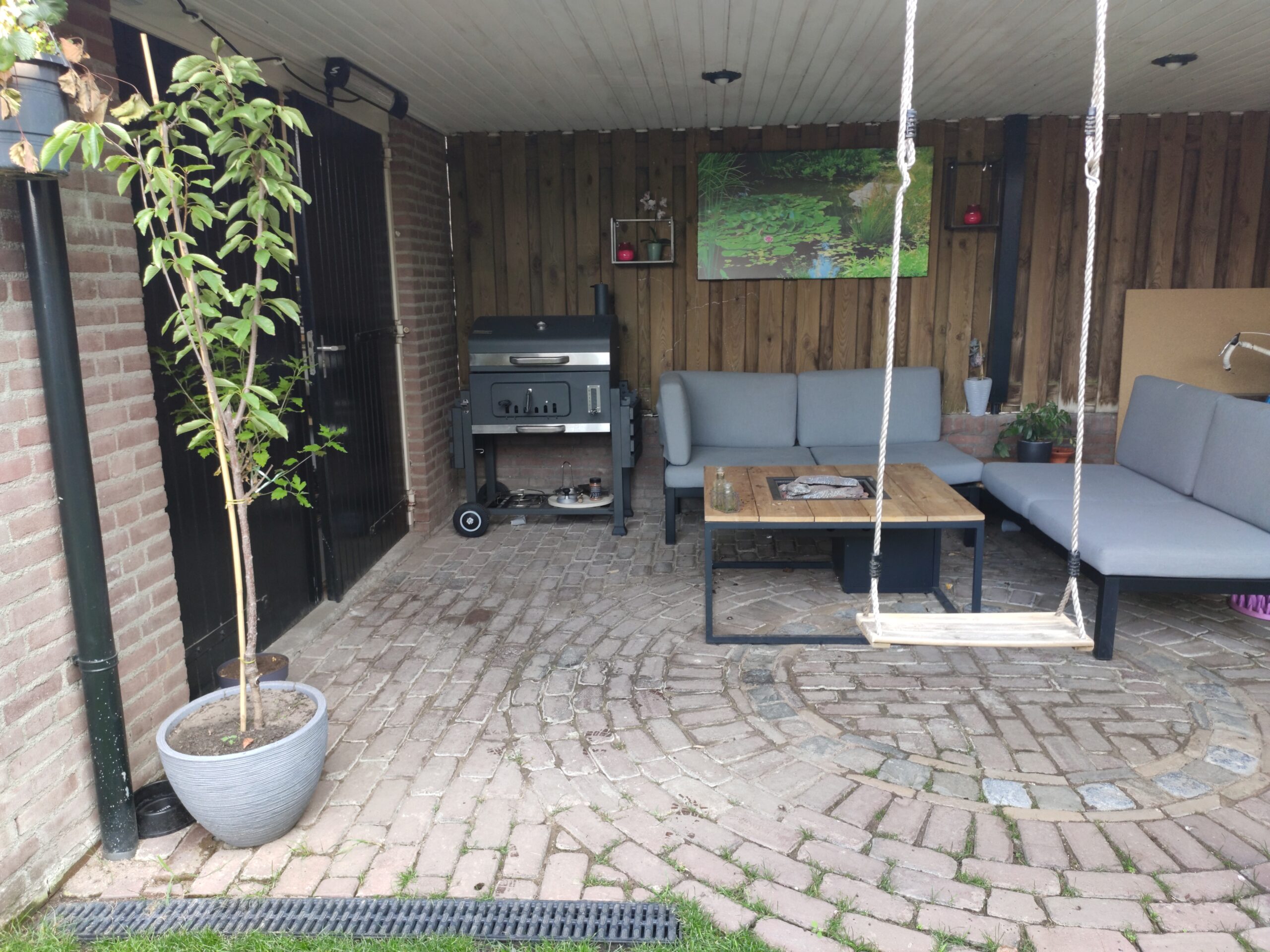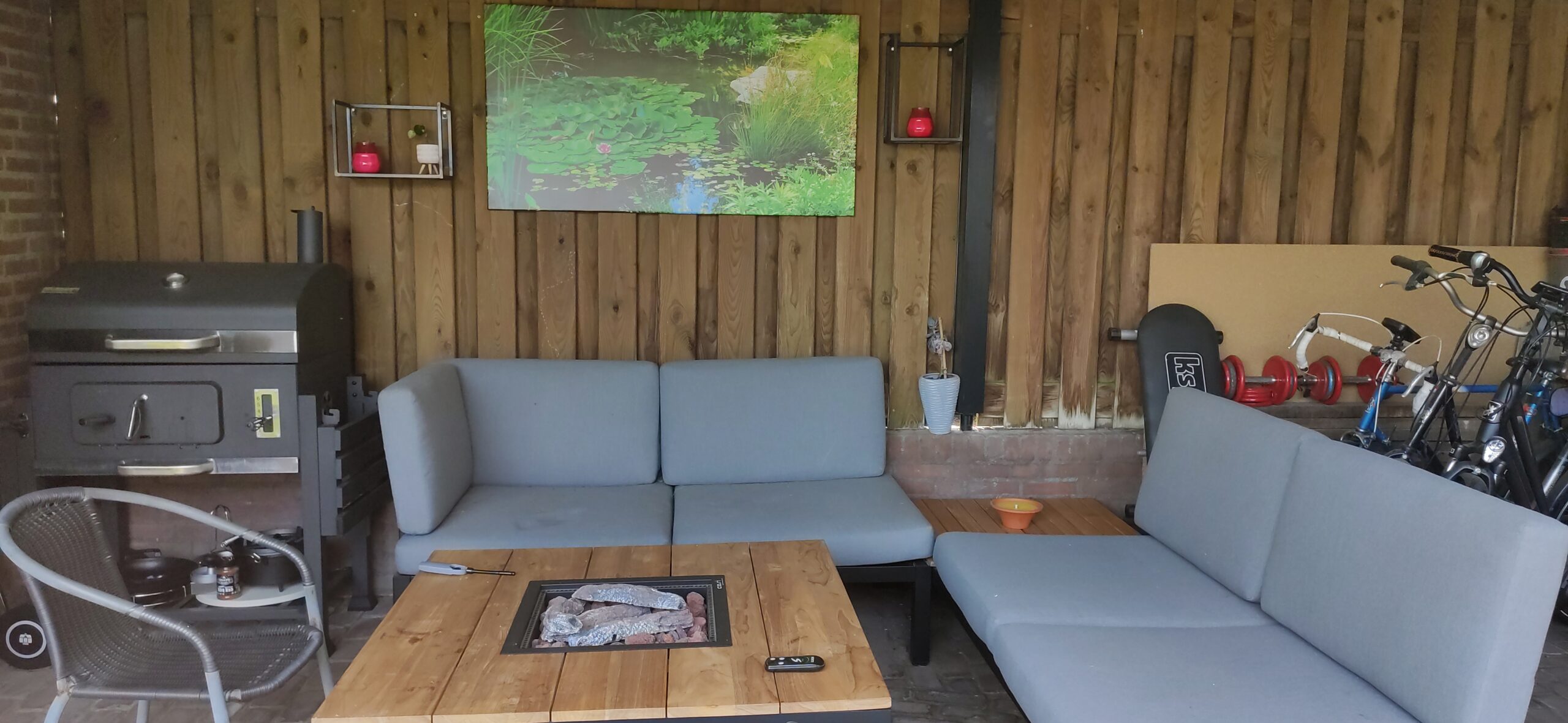 To enjoy the garden in late summer evenings, a warm terrace is not an unnecessary luxury. The covered carport already gives shelter from wind and rain, but what is better than warming up by a fire? That is why this fire table is such a great addition. To use the space efficiently, Gijs equipped the carport with a corner sofa and a fire table. Now he can drop onto the couch with a drink after a long day of work and enjoy the results.