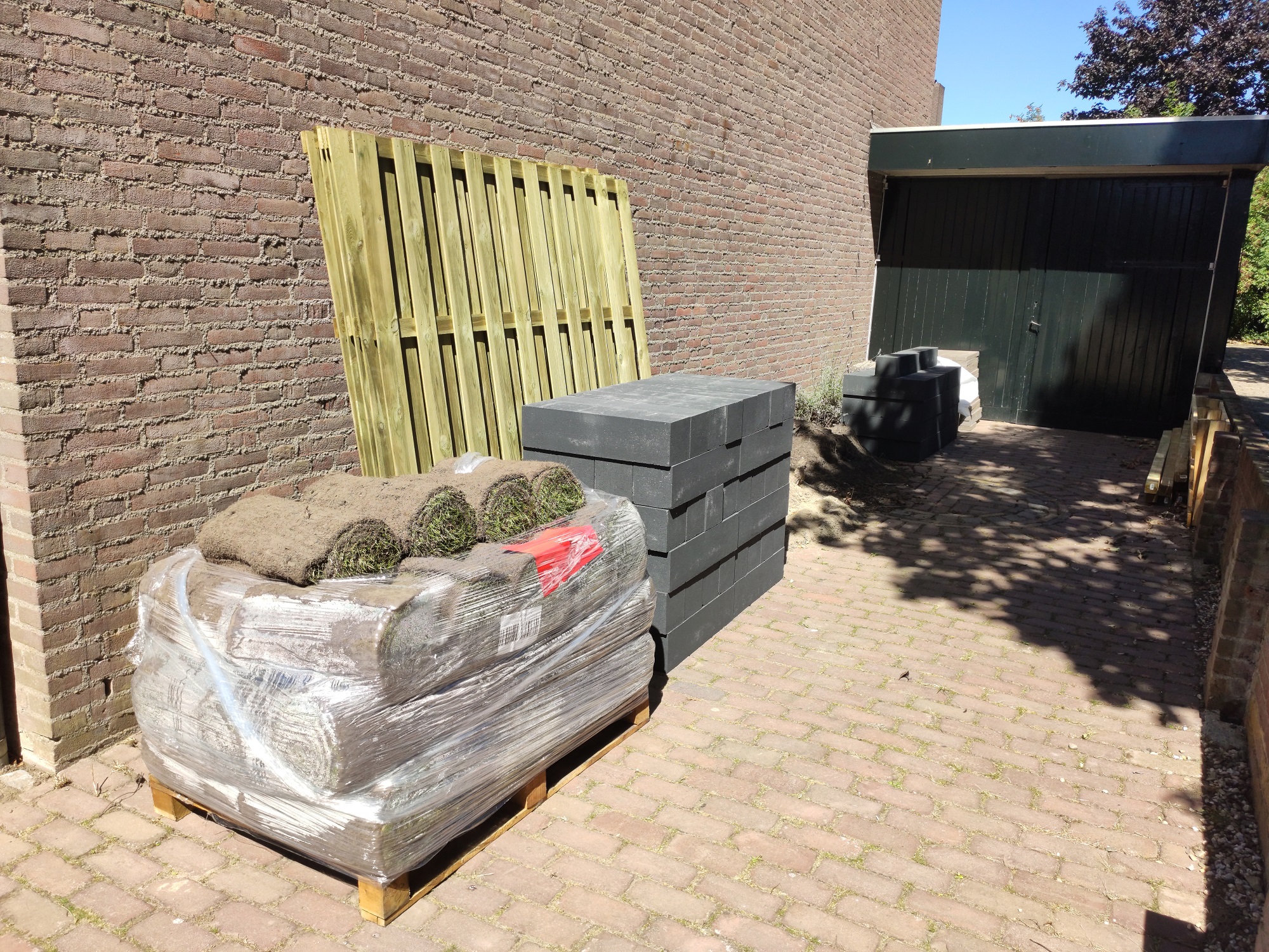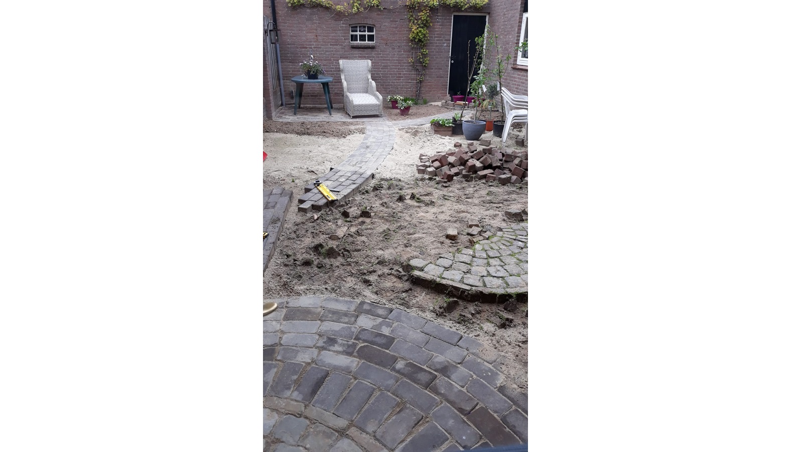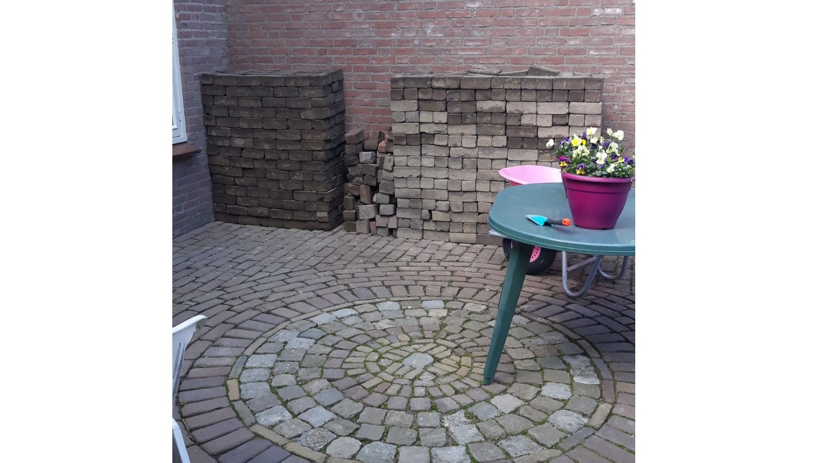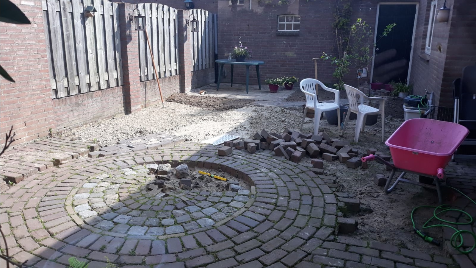 Our Gijs can do a bit of everything, so he got to work like a proper paver and laid it all in no time. Sharp-eyed viewers may have noticed that the circular pattern from the center of the garden returns near the back door and the small shed door. It is a small detail, but exactly the kind that gives a garden that little extra.