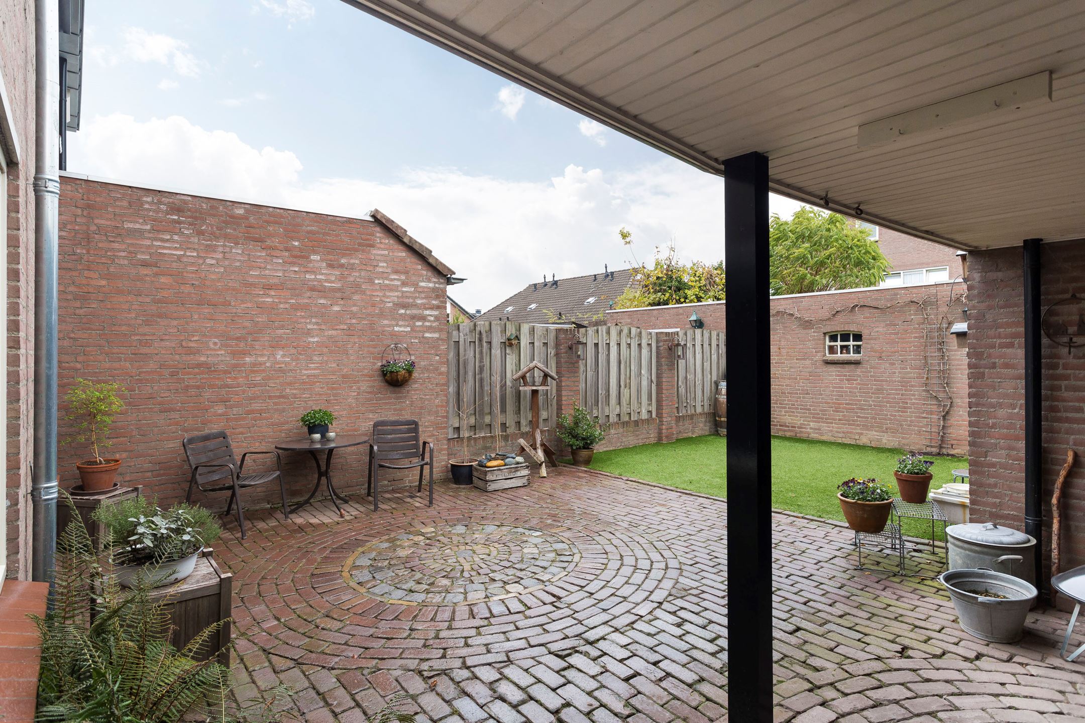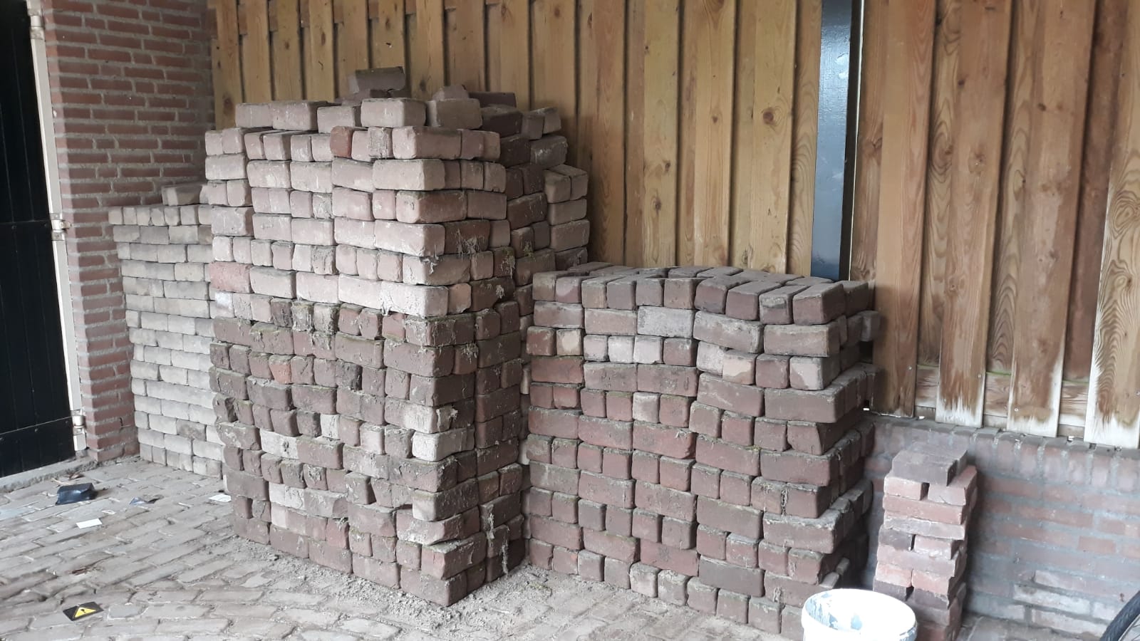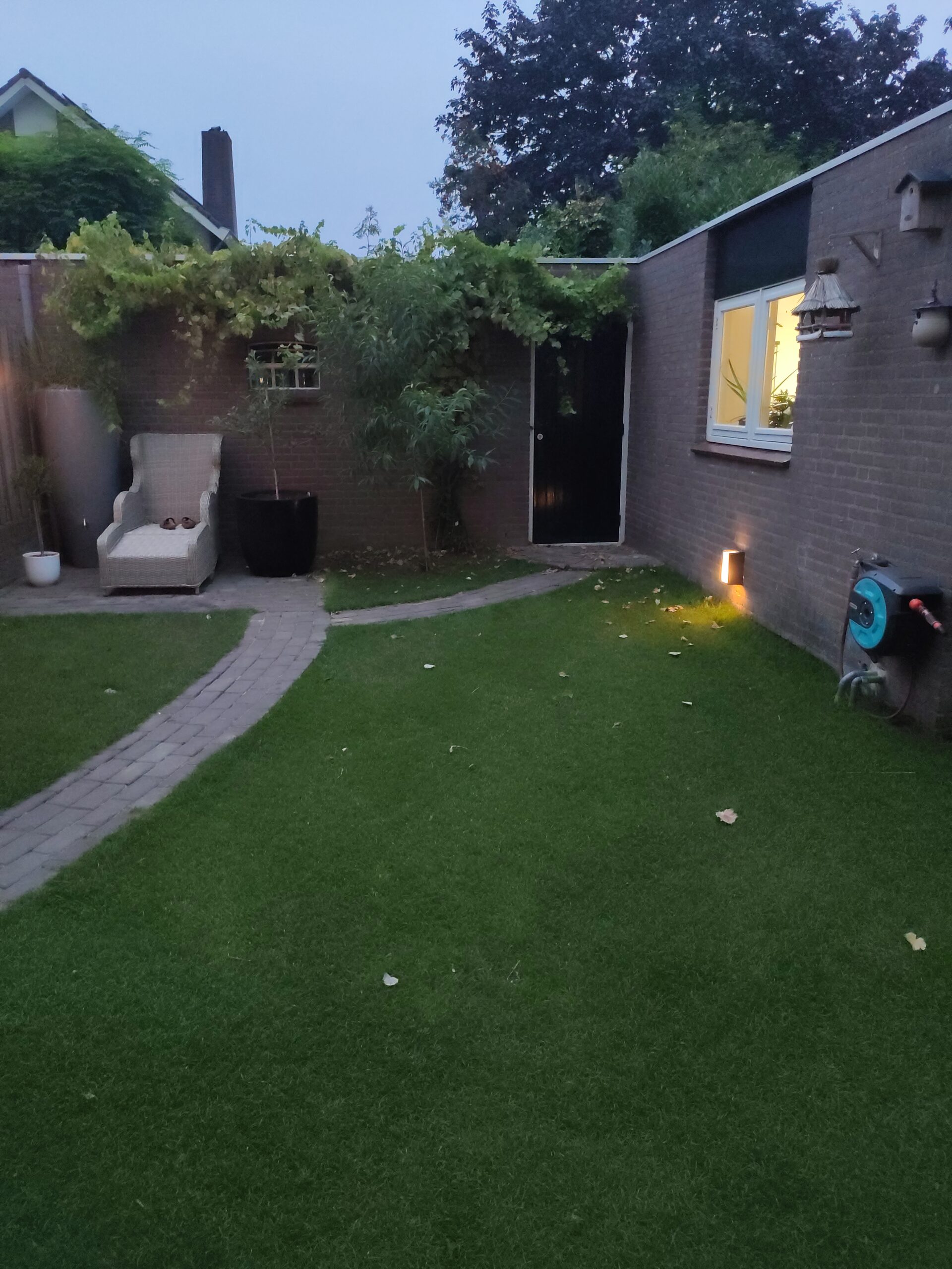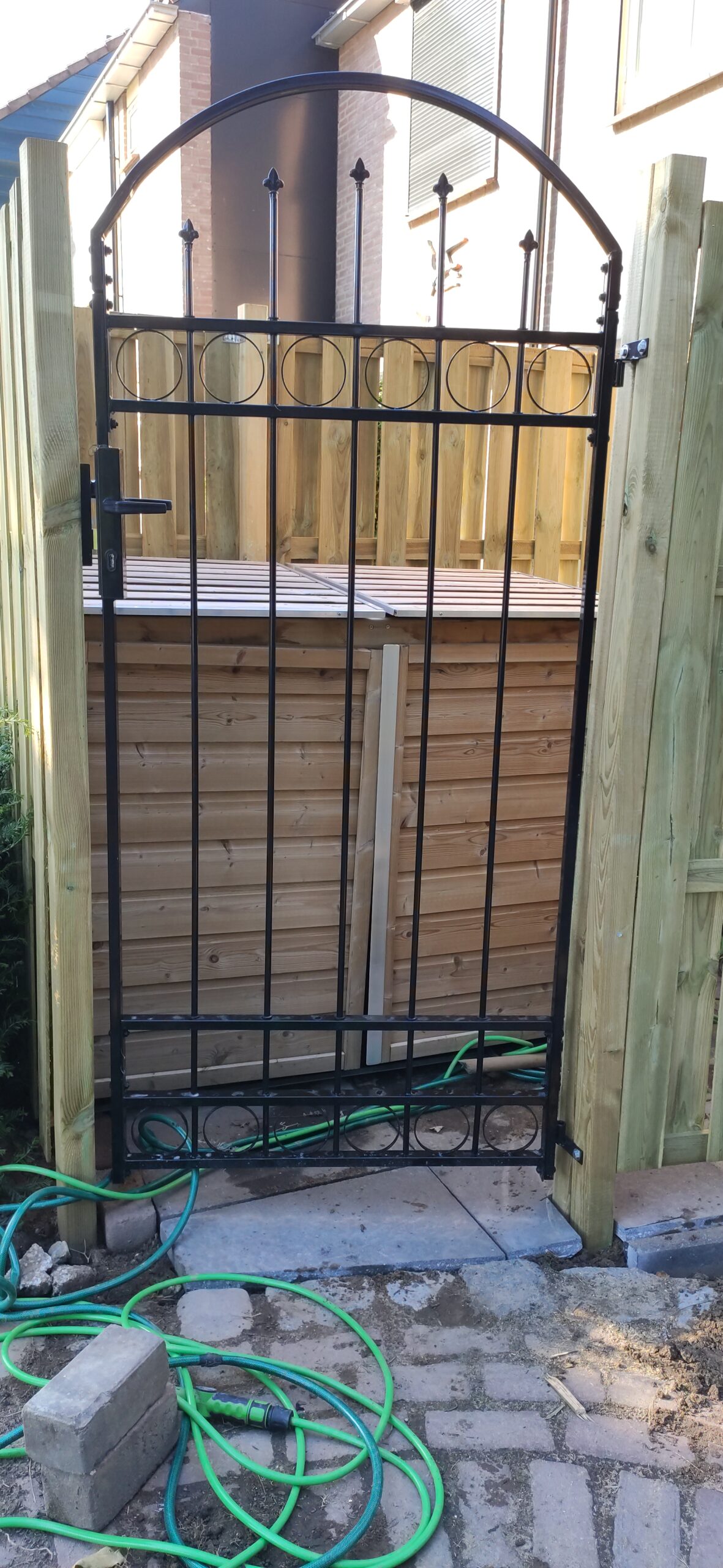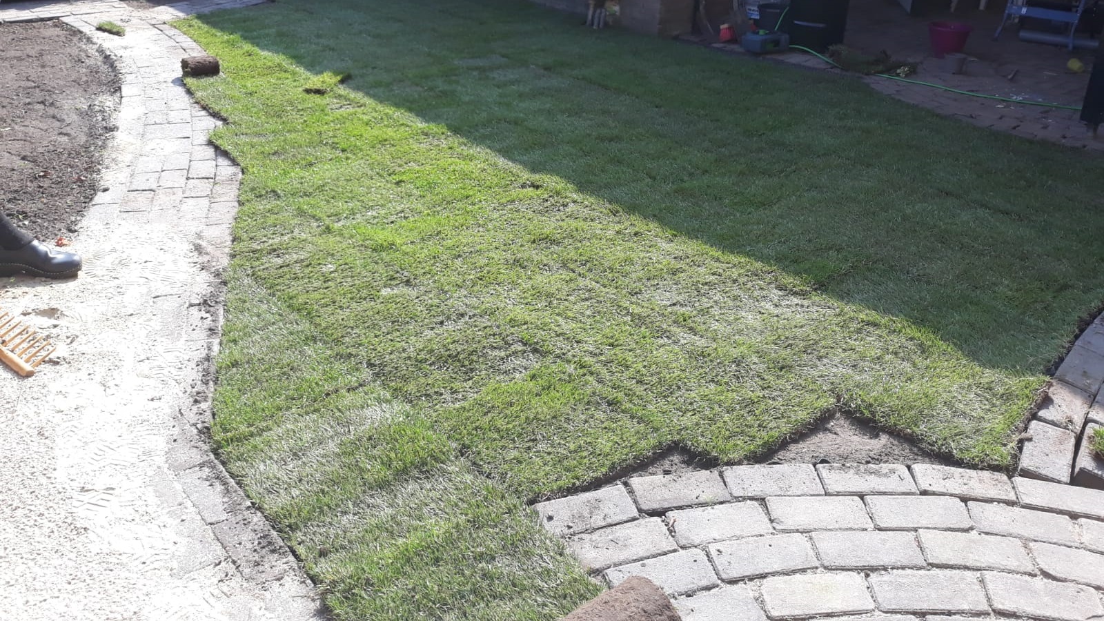 Our Gijs can do a bit of everything, so he got to work like a proper paver and laid it all in no time. Sharp-eyed viewers may have noticed that the circular pattern from the center of the garden returns near the back door and the small shed door. It is a small detail, but exactly the kind that gives a garden that little extra.