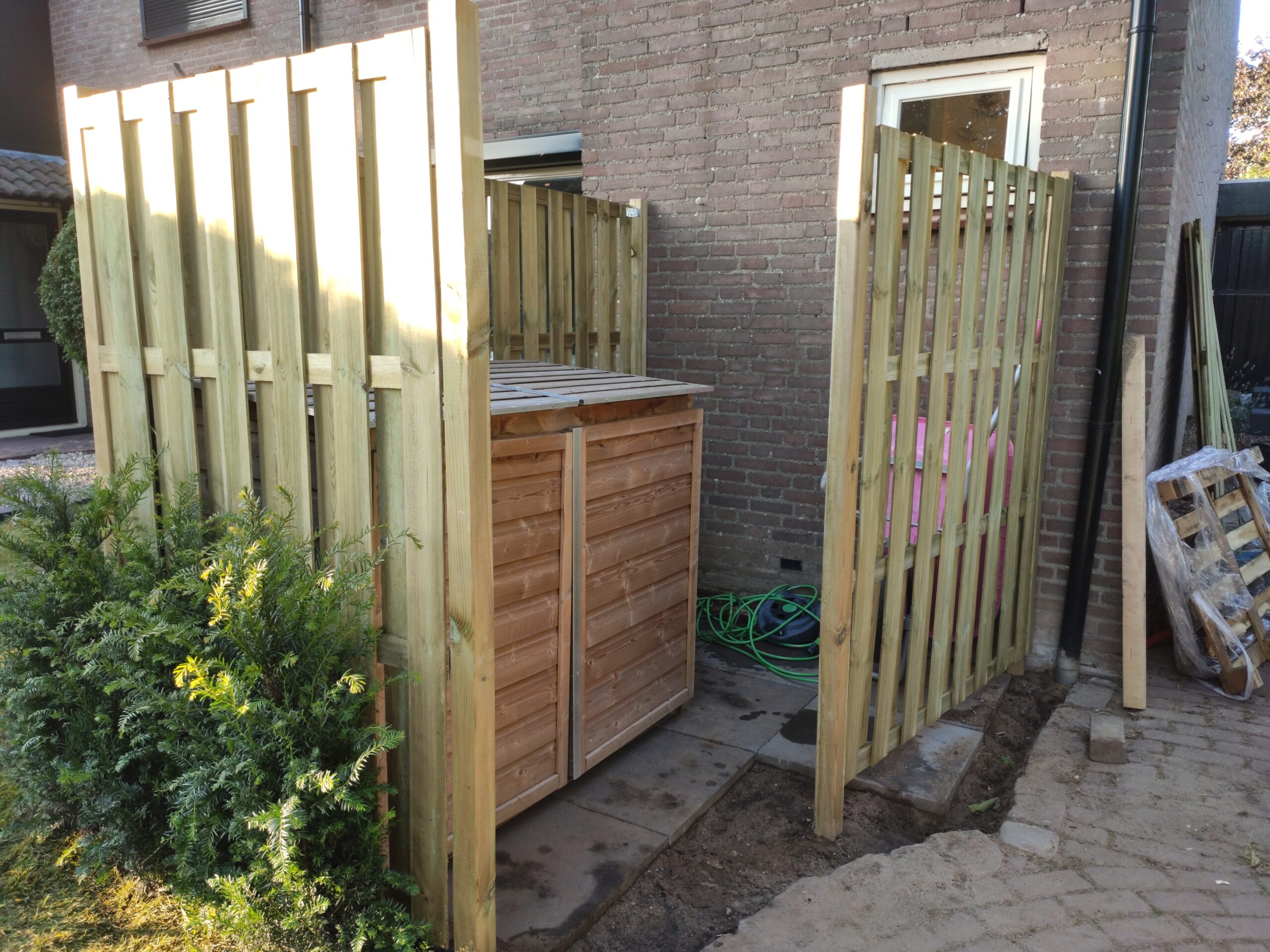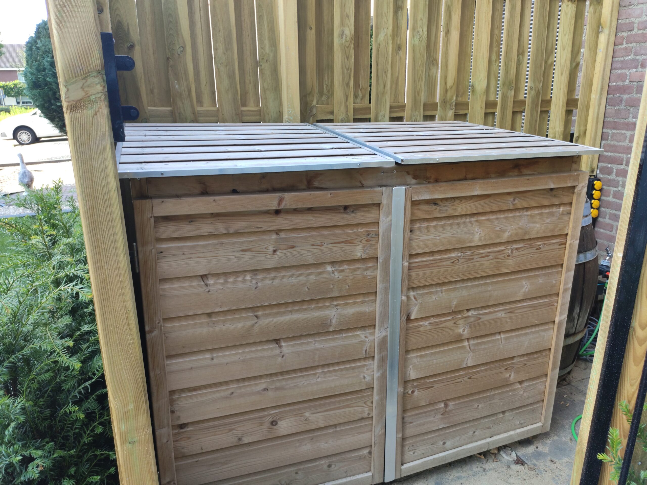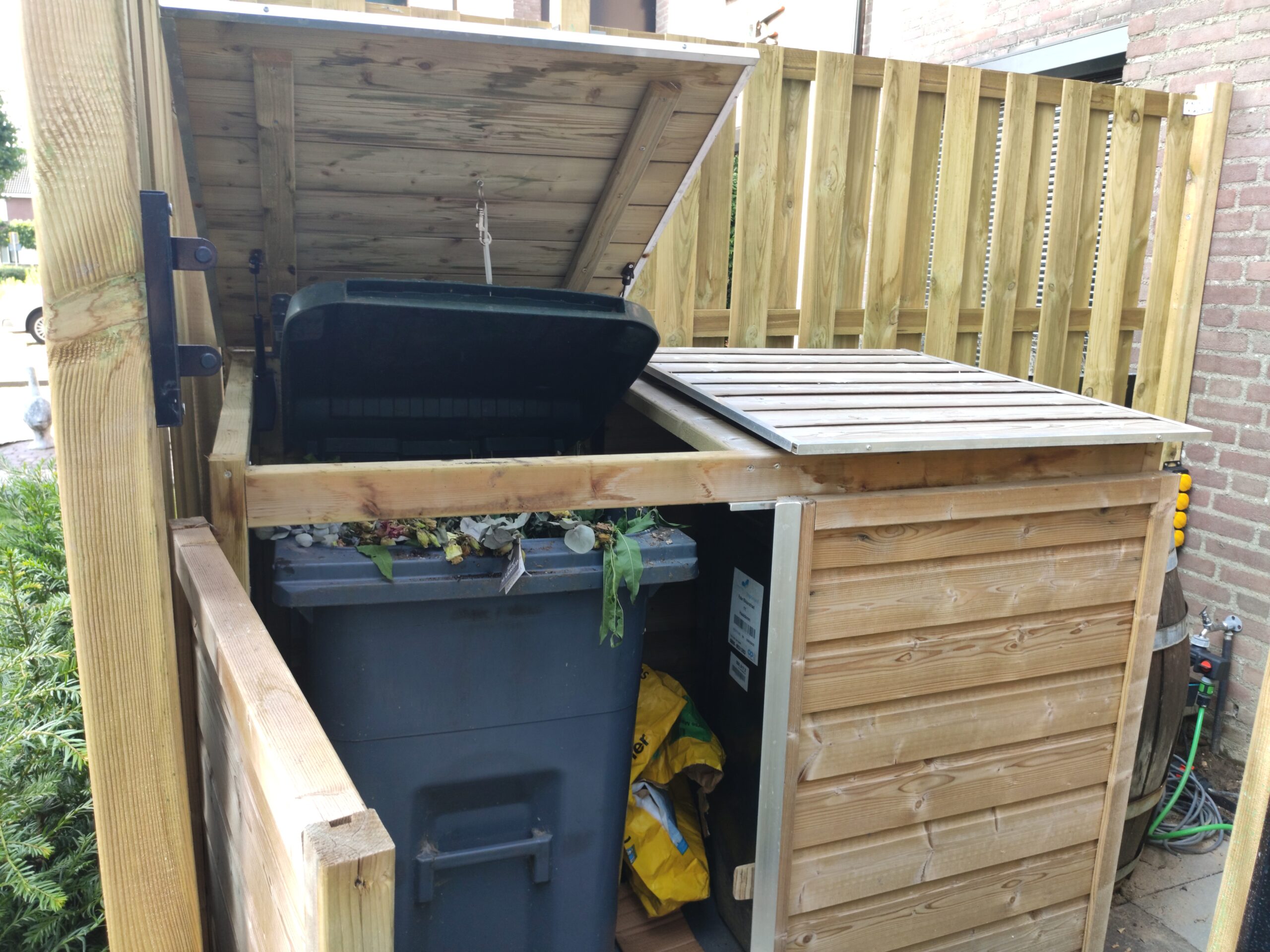 Because space in the backyard is limited, saving as much room as possible is important. For that reason, Gijs had already decided to move the waste bins to the front of the house. To keep them out of sight, he installed a neat bin enclosure and hid it behind a fence. That way, the neighbors do not have to stare at ugly bins. The enclosure has gas springs to hold the lids open, so Gijs keeps both hands free while taking out the trash.