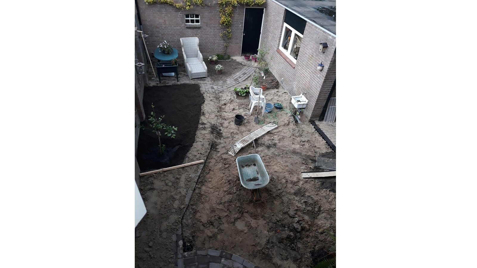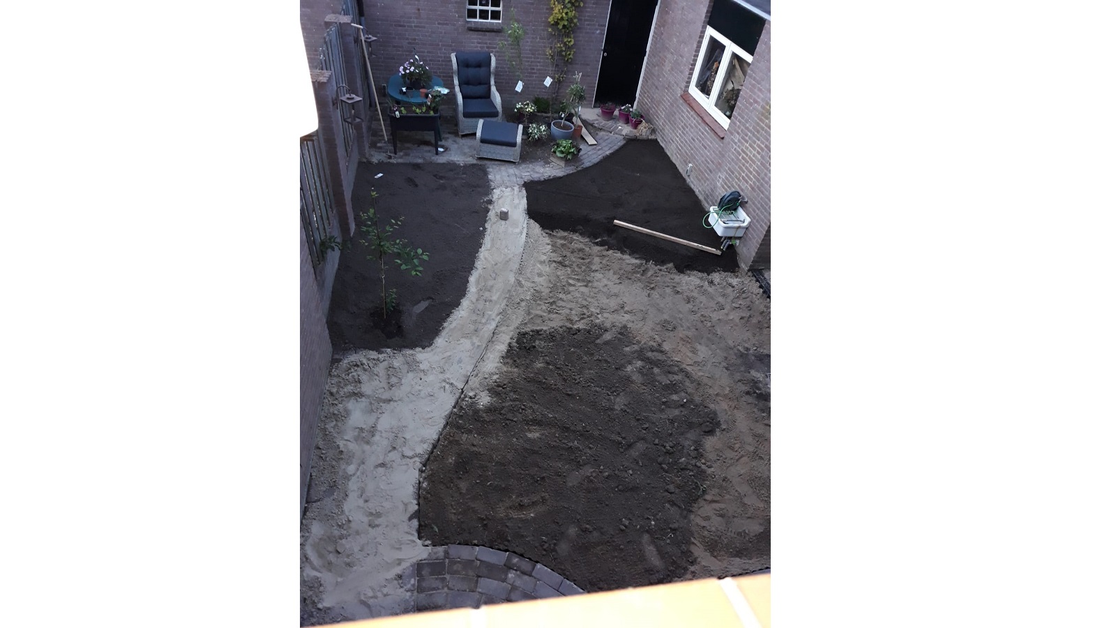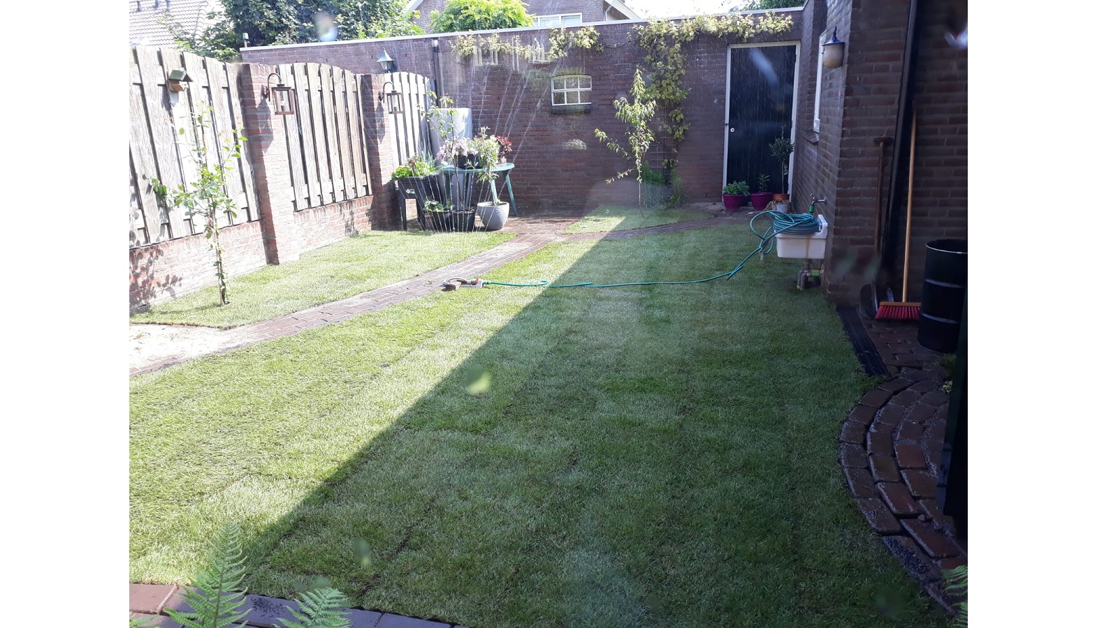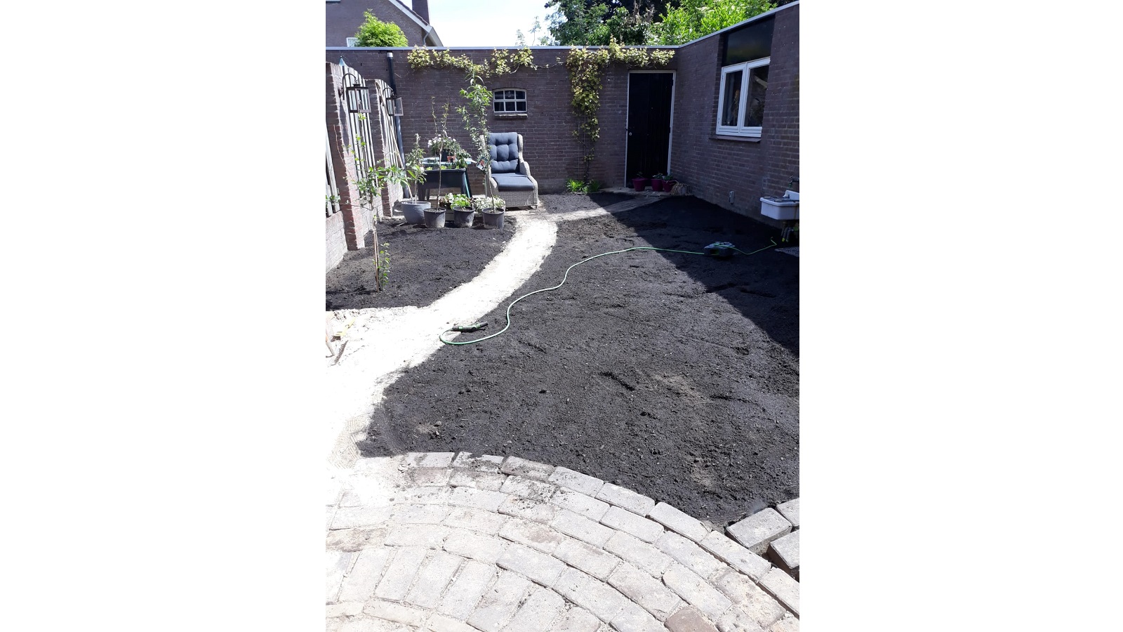 Because this garden used to be almost all stone, the base layer was yellow sand. As you know, that is not ideal soil for a healthy green garden. Gijs removed it and replaced it with rich black soil. The new lawn and plants were very happy about that.