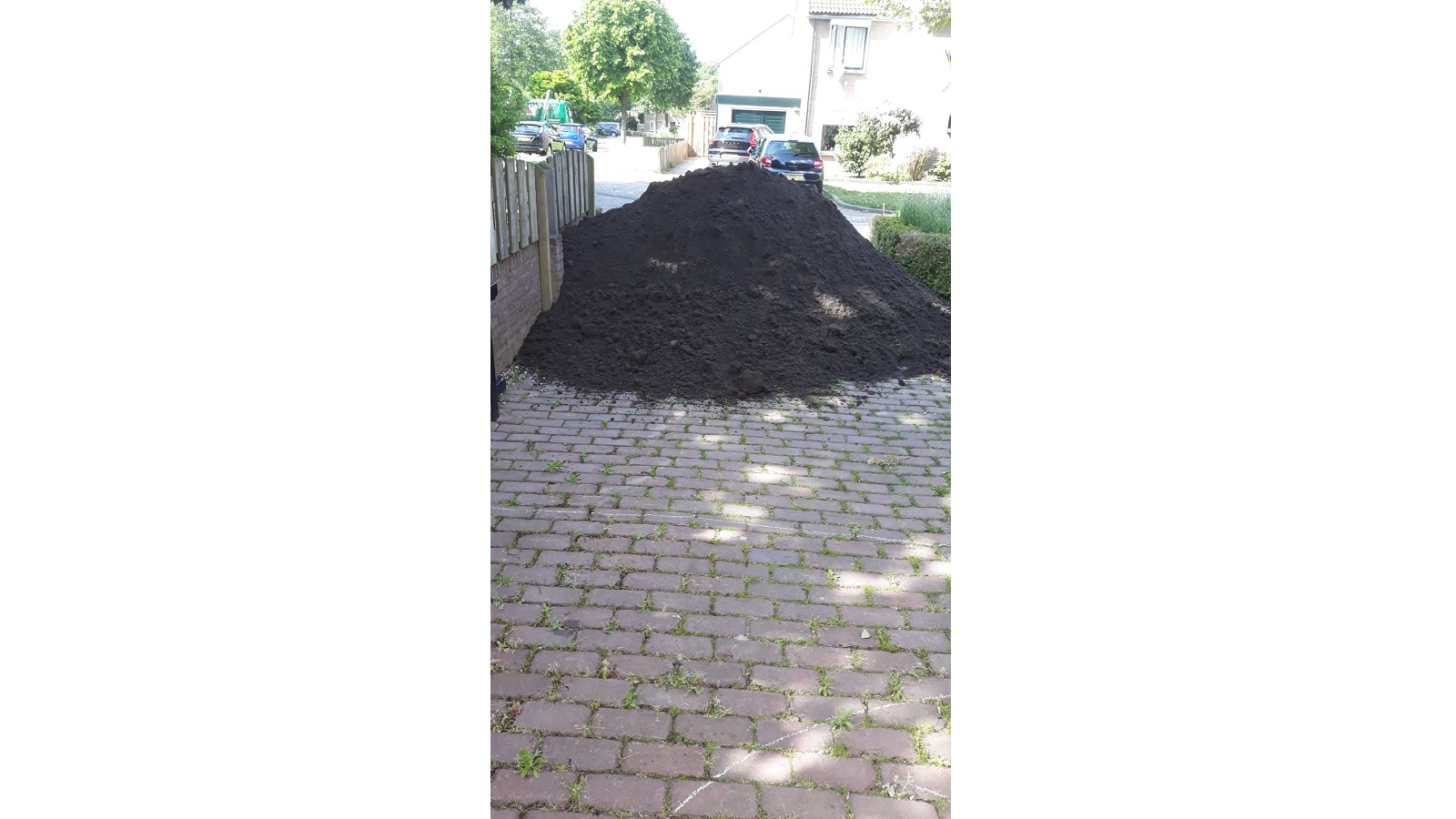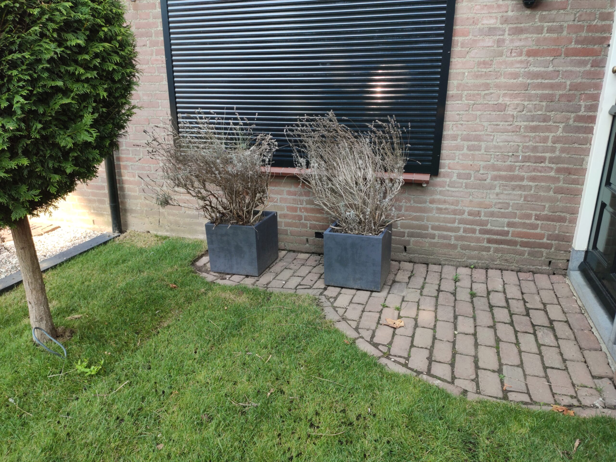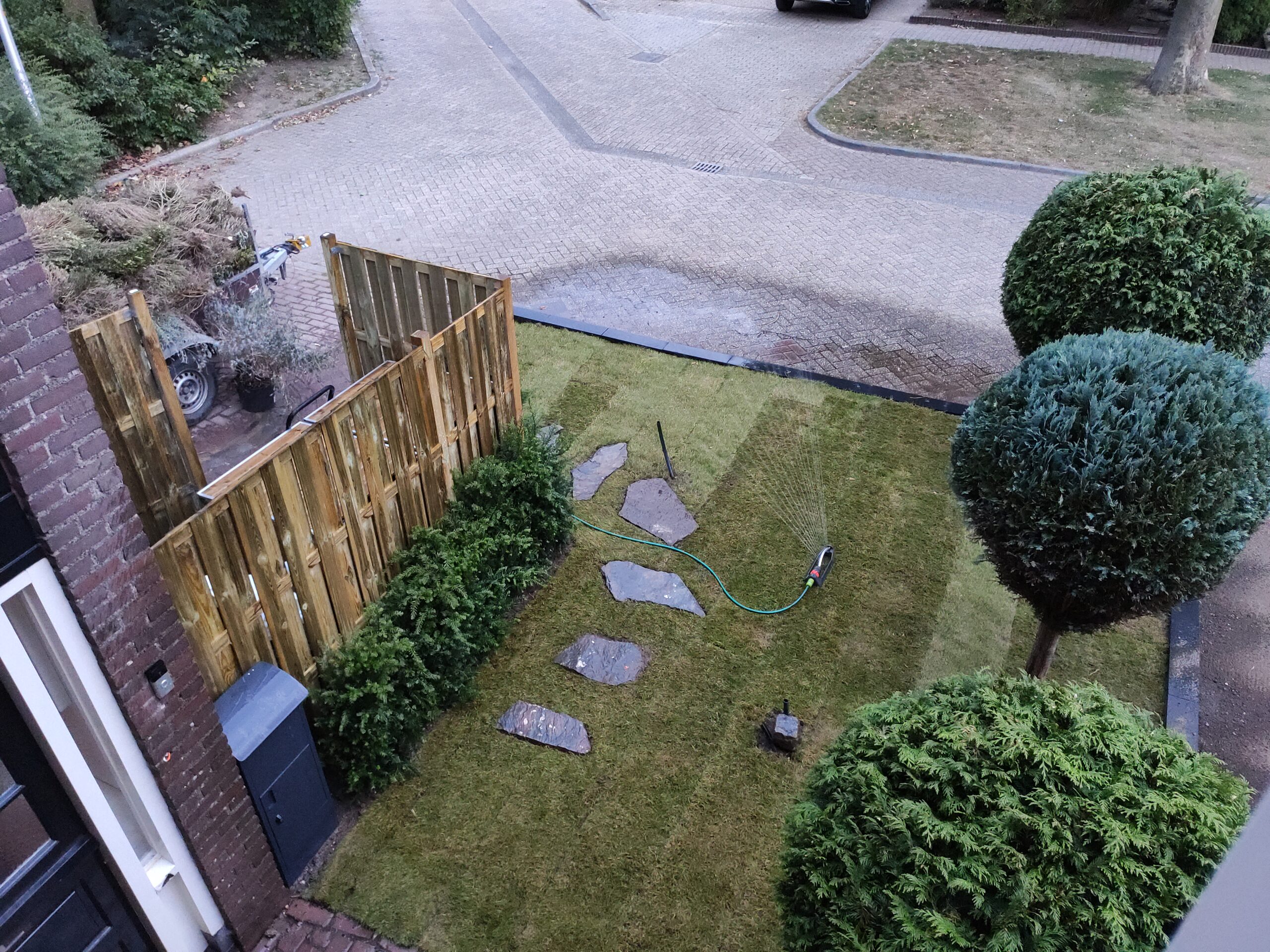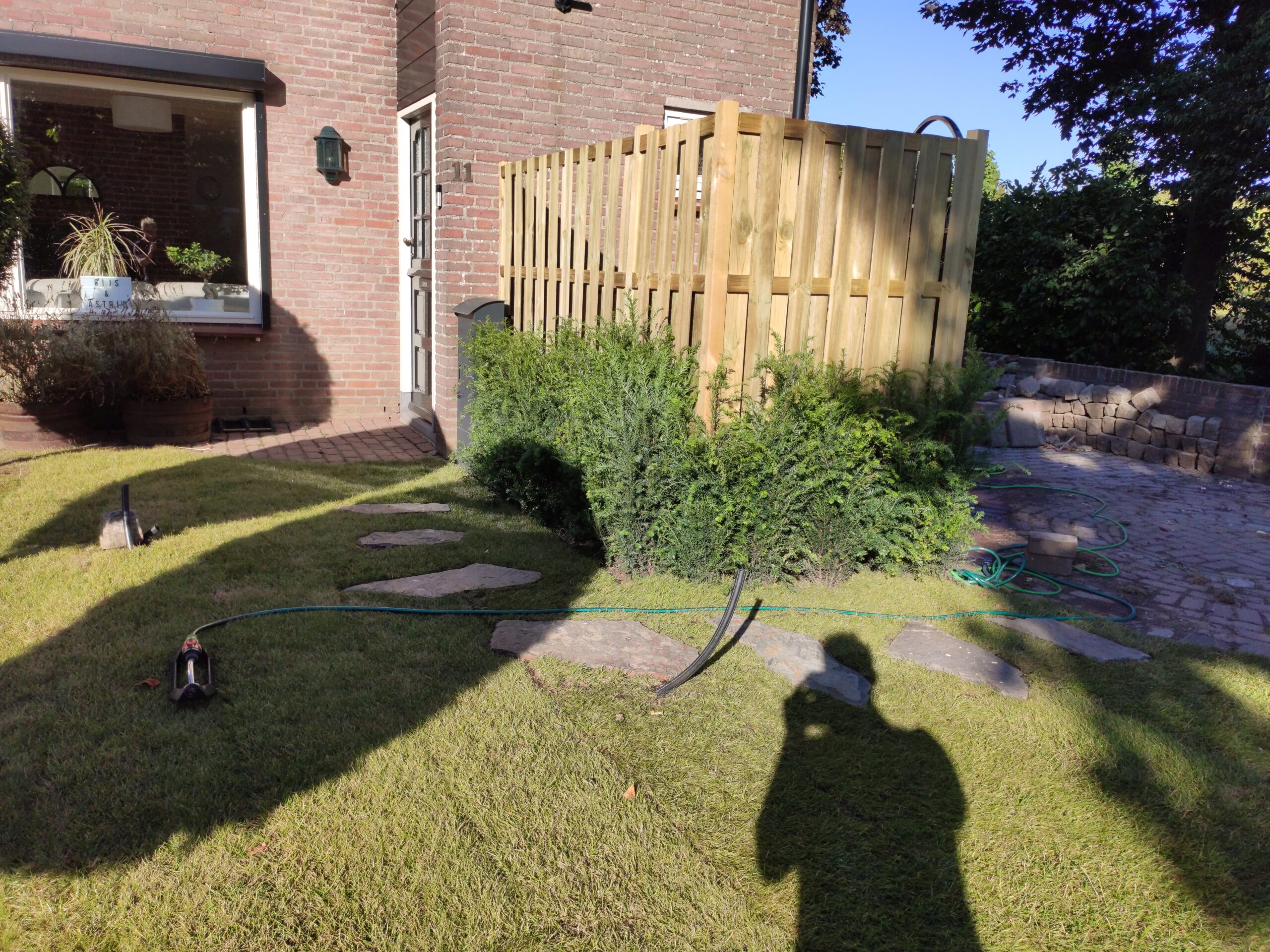 Because this garden used to be almost all stone, the base layer was yellow sand. As you know, that is not ideal soil for a healthy green garden. Gijs removed it and replaced it with rich black soil. The new lawn and plants were very happy about that.