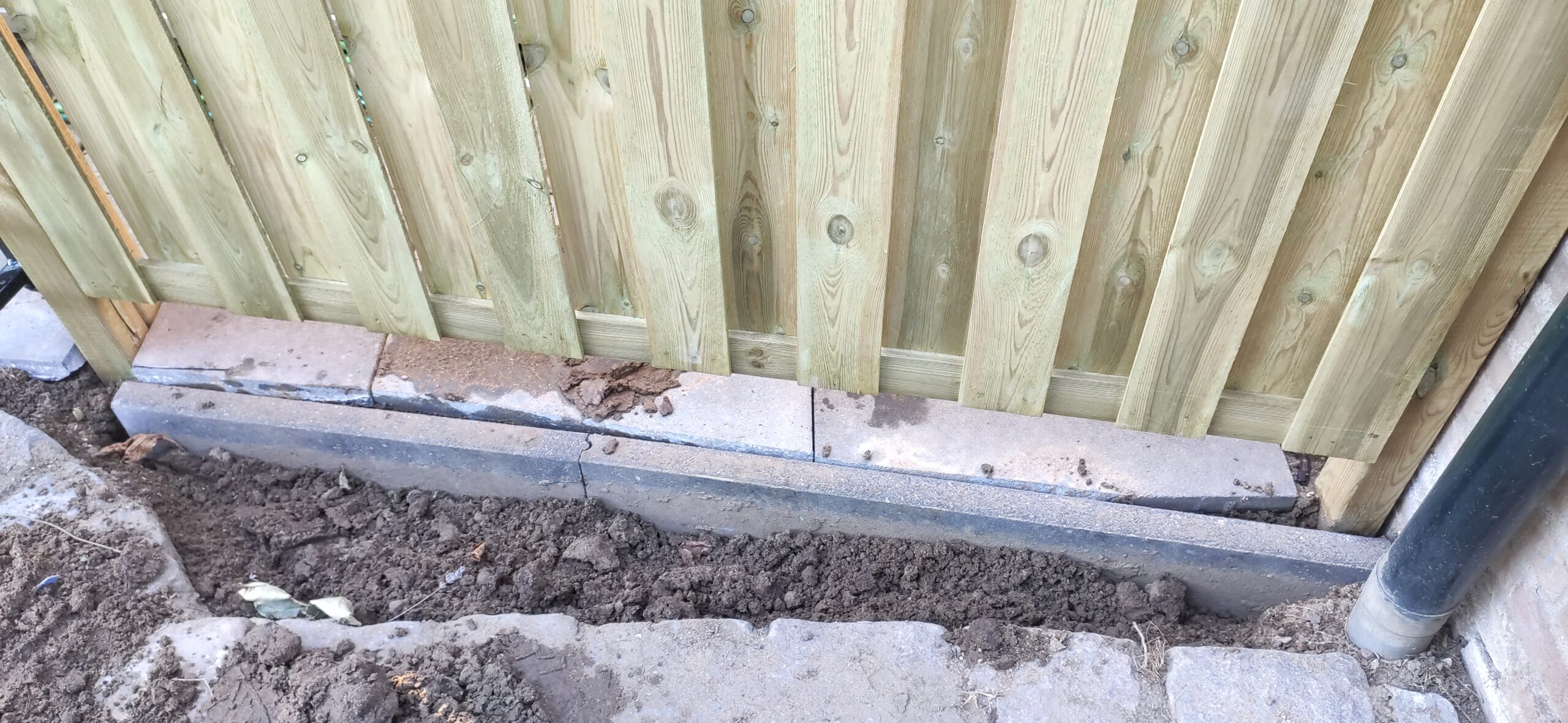 For the new layout, we chose solid anthracite stack blocks measuring 60x15x15 cm. These blocks are cost-efficient, low maintenance, and have a premium look. To keep it a true garden, sod was installed. As proven in the backyard, sod is easy to lay and gives quick results. While turning over the soil, we also prepared for sprinklers and garden lighting by placing a polyethylene pipe and an underground cable.