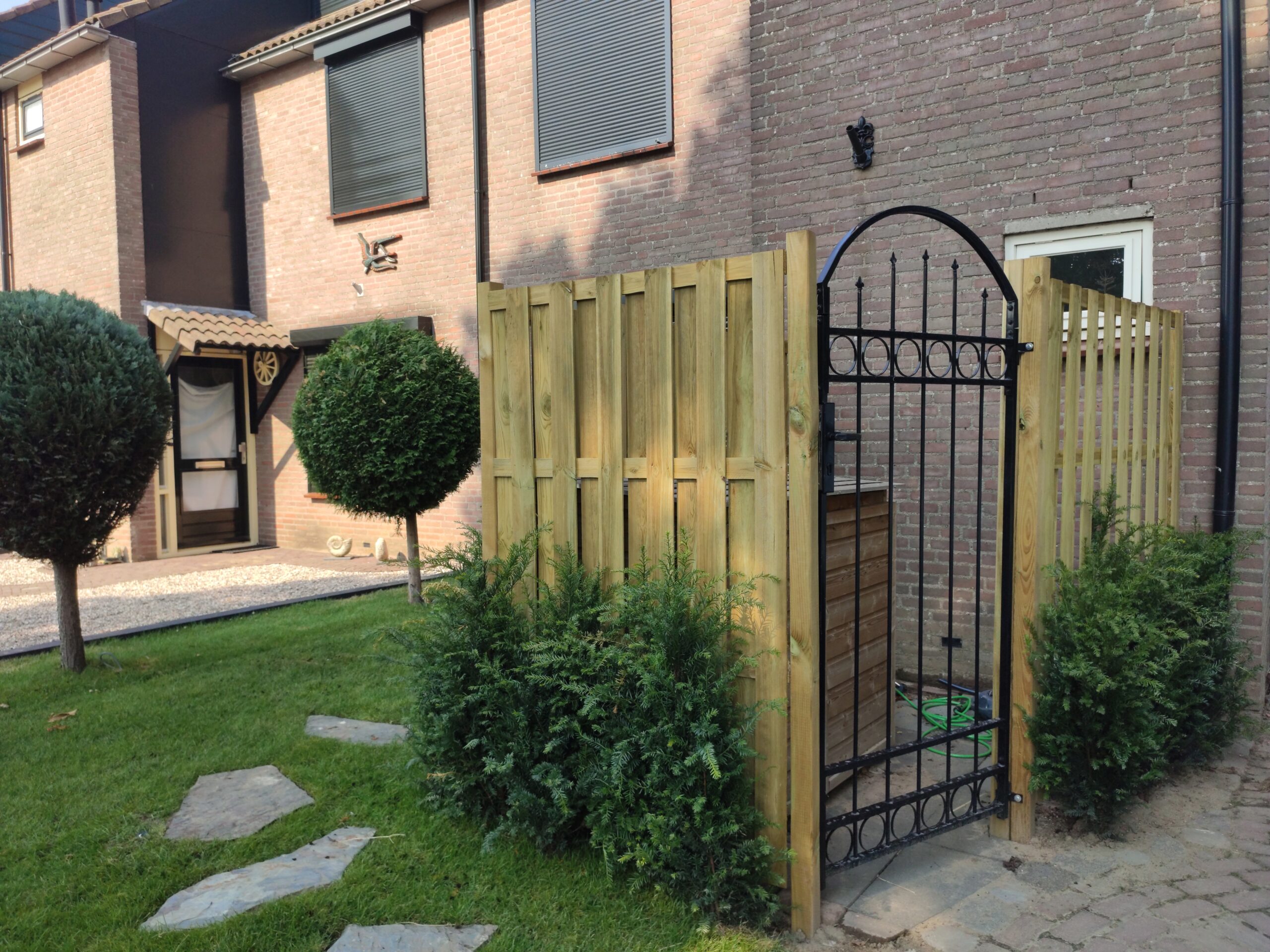 Behind the fence, near the bins, there is room for more than just containers. Using 60x60 cm tiles and a lockable iron gate, a paved area was created where both waste and garden tools can be stored.