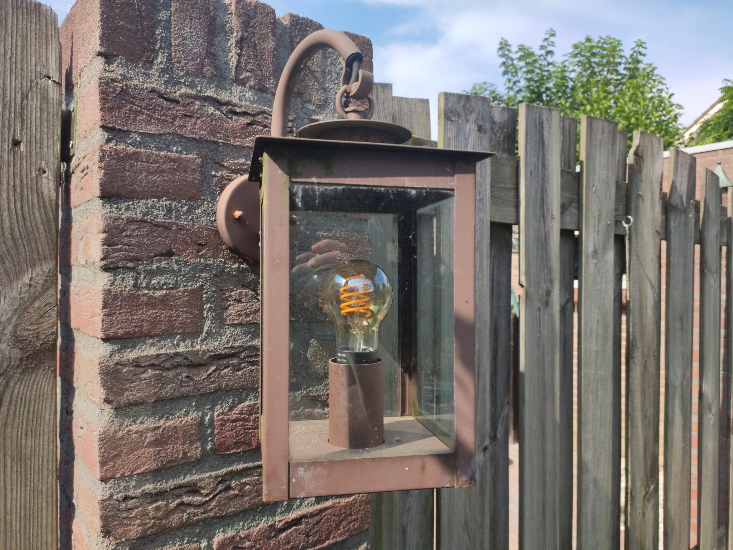 The existing fixtures have a nice authentic style, so instead of replacing full lanterns, only the bulbs were swapped for Philips Hue LED lamps. LED is often associated with cold white light, but warm and cozy options are widely available now. Finally, a Philips Hue motion sensor was hidden inside a birdhouse to switch on the lights whenever someone enters the garden.