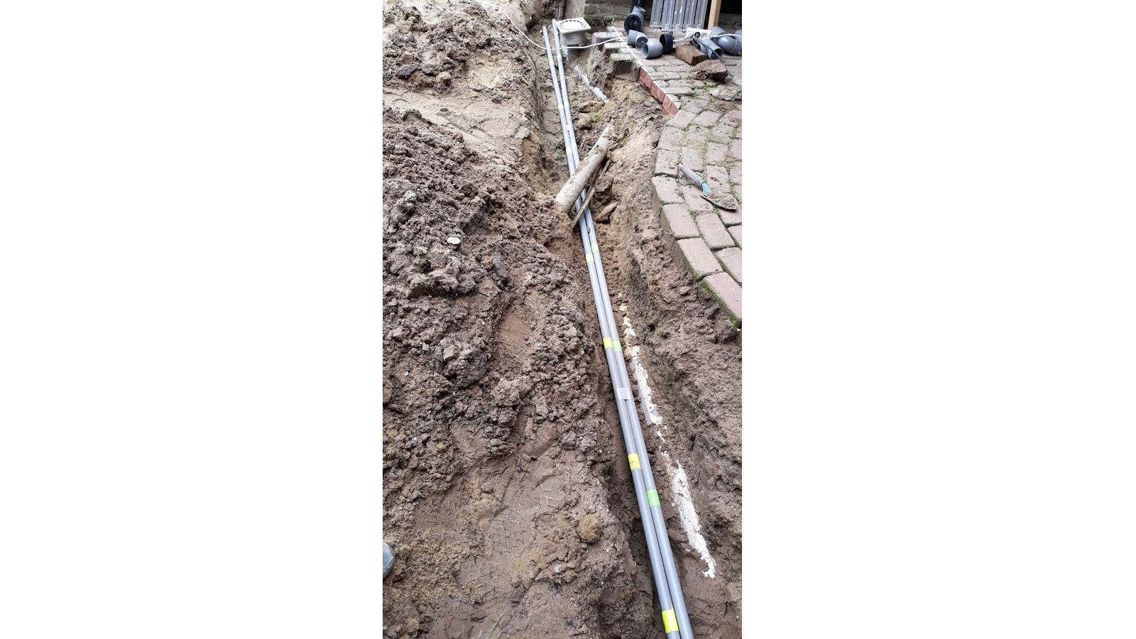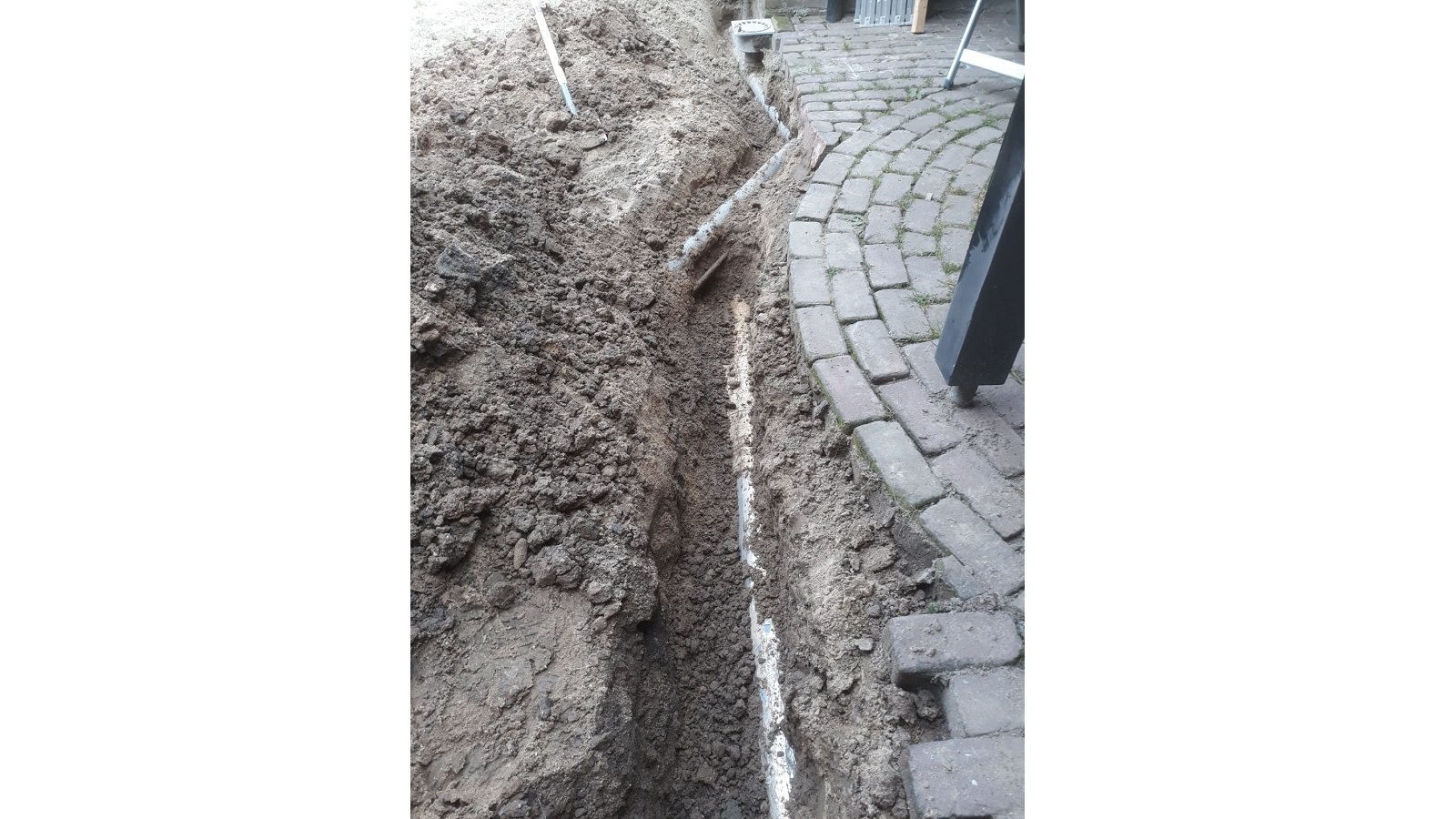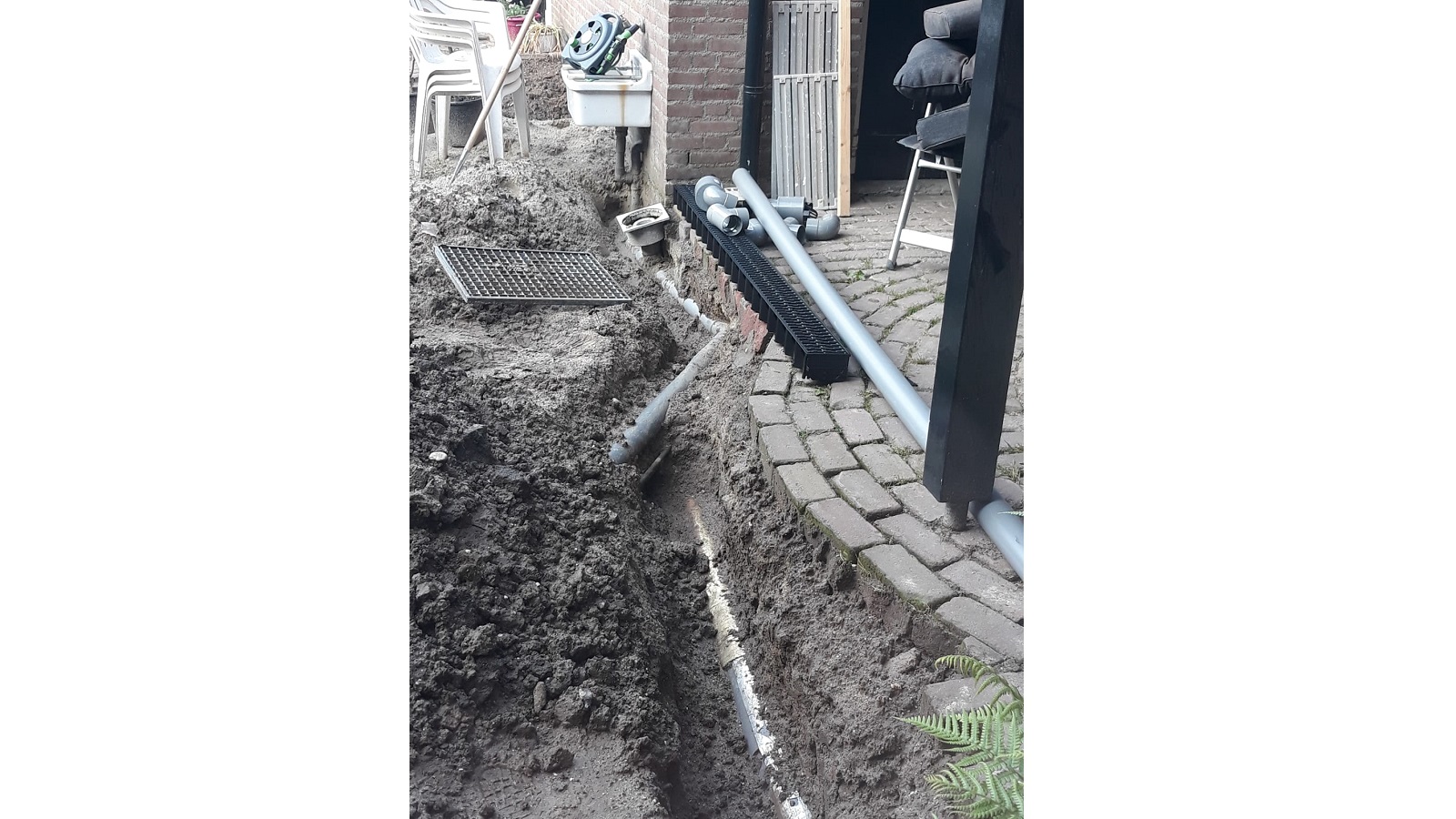 What was not known at first, but quickly discovered by our observant host Gijs, was a leak in the water line to the shed. Like a determined professional, he started digging to find the leak. As expected, he located it quickly. Gijs repaired it himself, disconnecting the old copper pipe and installing a new polyethylene line alongside the other pipes.