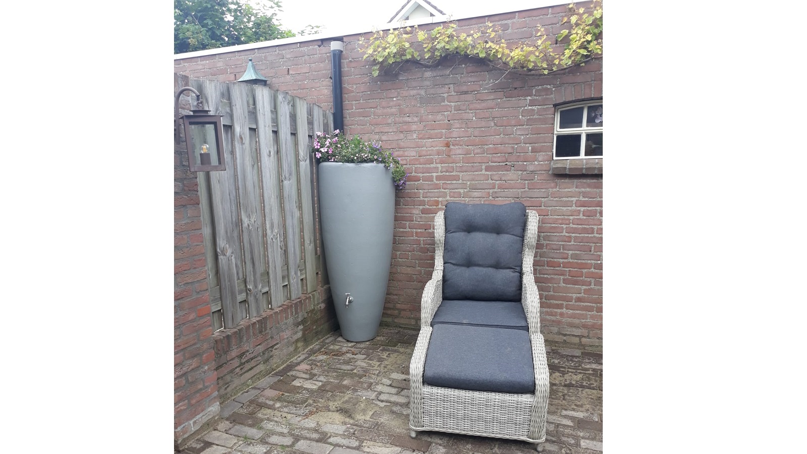 People often picture a huge ugly barrel that takes up half the garden, but that is no longer necessary. Gijs chose a 300-liter barrel shaped like a flower pot. By connecting it to the existing downspout with an automatic diverter, it fills up when it rains, and once full, excess water simply flows back into the downspout.