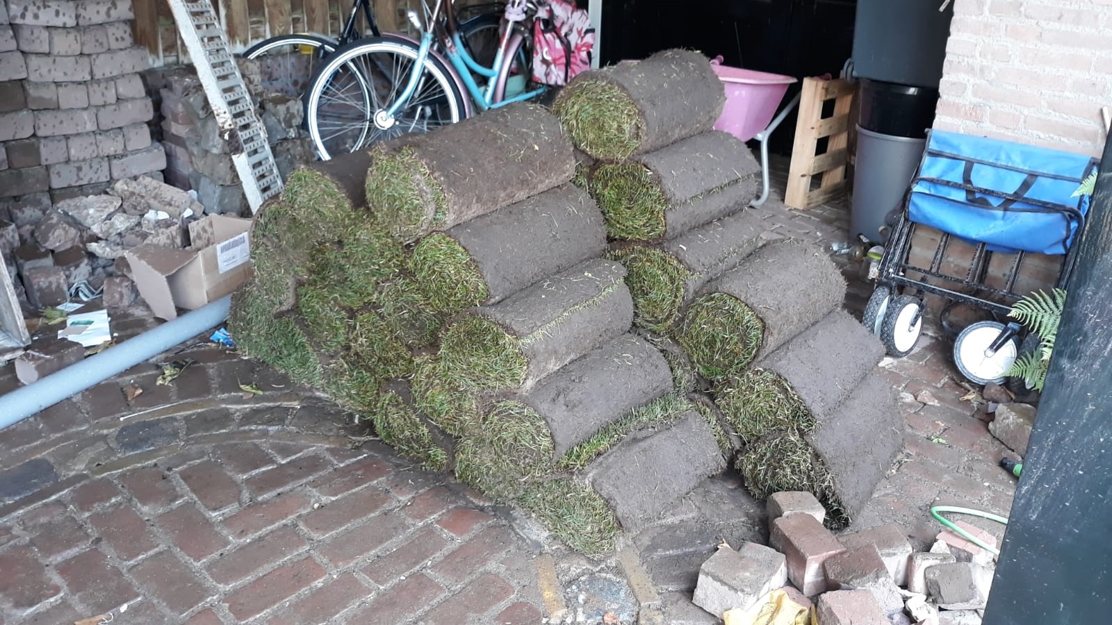 In the meantime, the sod had arrived. Gijs chose sod with a relatively high red fescue content because it handles shade well, which is useful in this garden. Sod is more expensive than seed, but it is easy to install and gives immediate results.