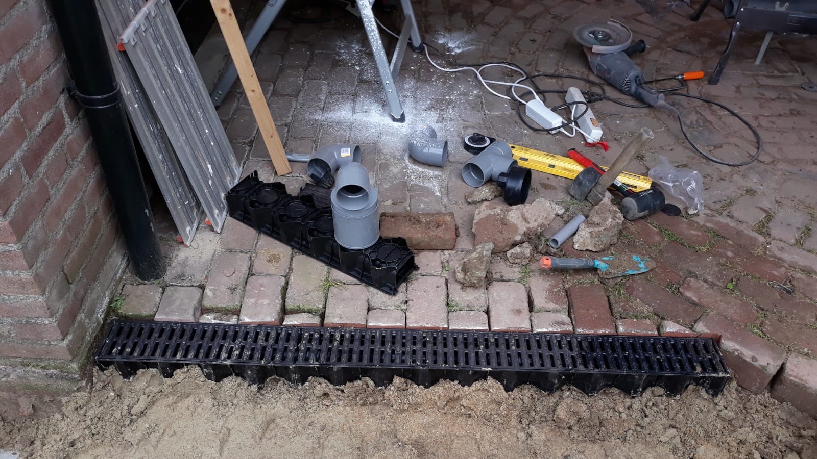 Because the carport is not only a seating area but also a practical workspace, it needs to be washable now and then. To prevent dirty water from flowing into the grass, Gijs installed a drain at the edge of the carport. That required a small adjustment to the drainage system.
