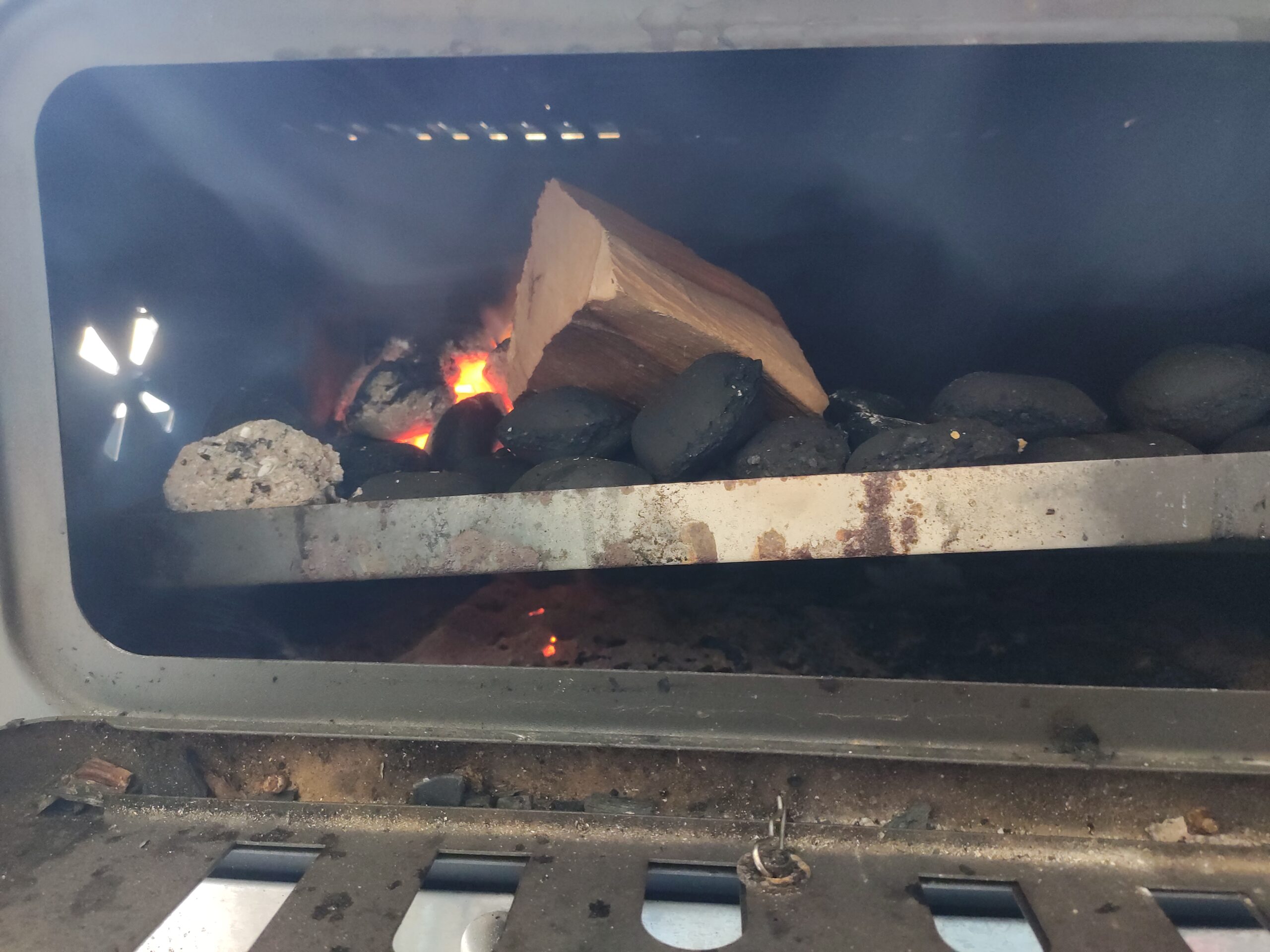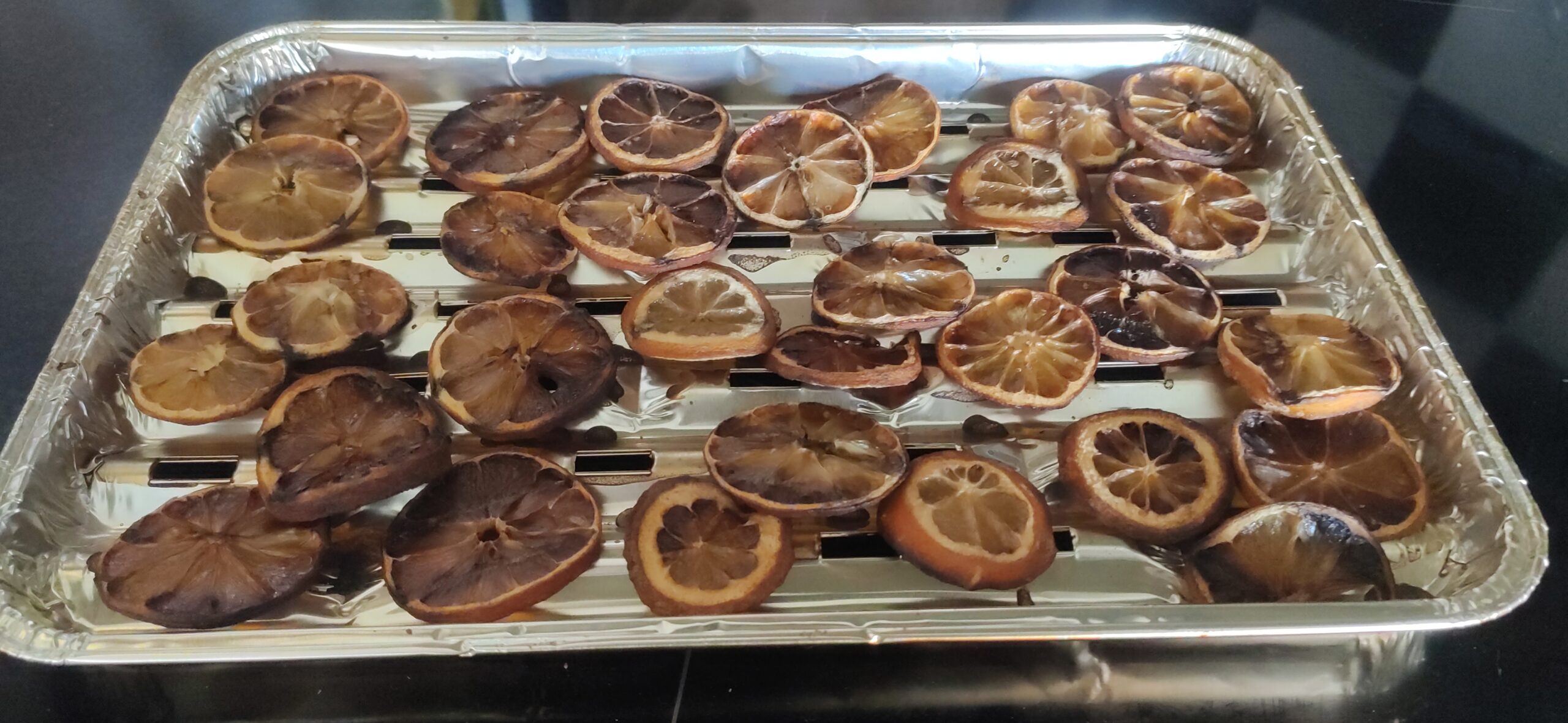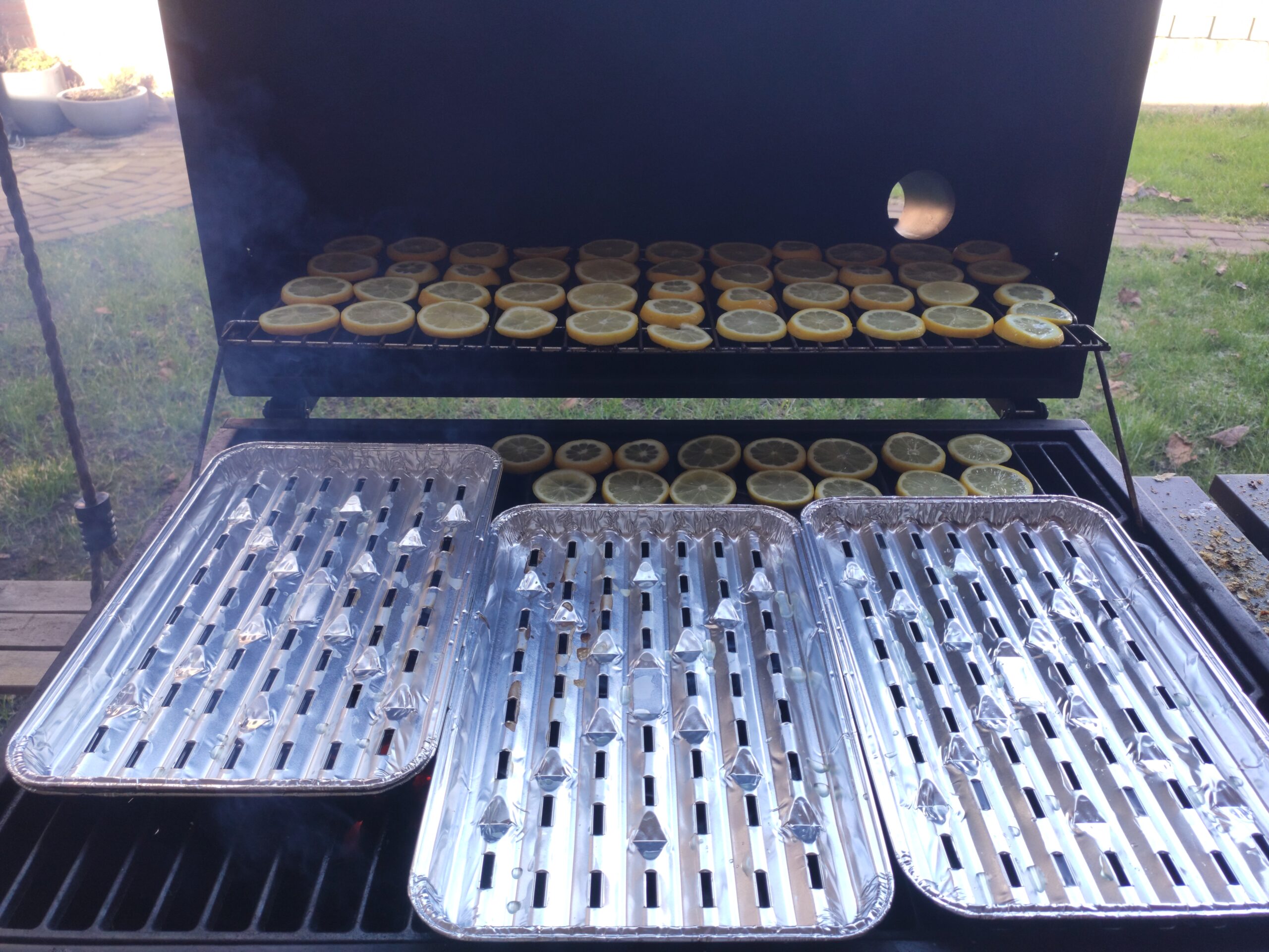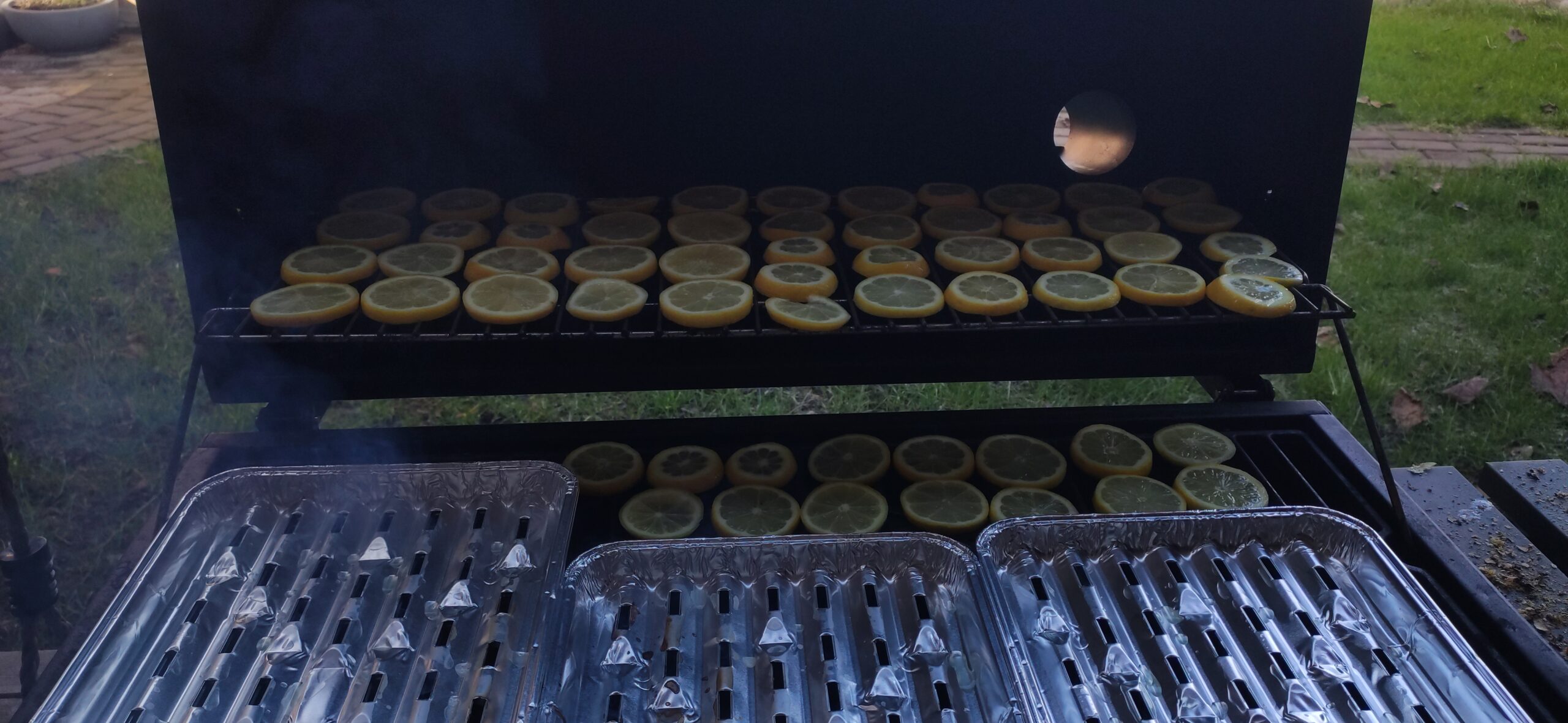 To smoke the lemons, Gijs runs the barbecue at 140°C using the snake method, which keeps the temperature stable for a long time. For smoking wood, he chooses apple wood because it gives a relatively mild smoke flavor. To prevent the lemons from burning, Gijs places several aluminum trays in the barbecue and puts the lemon slices on the grill above them.