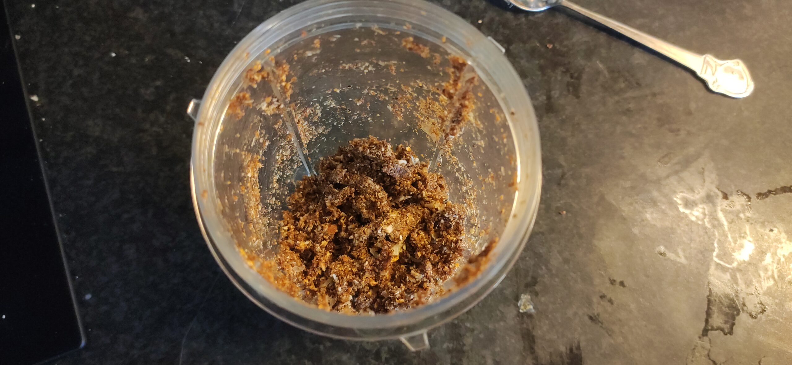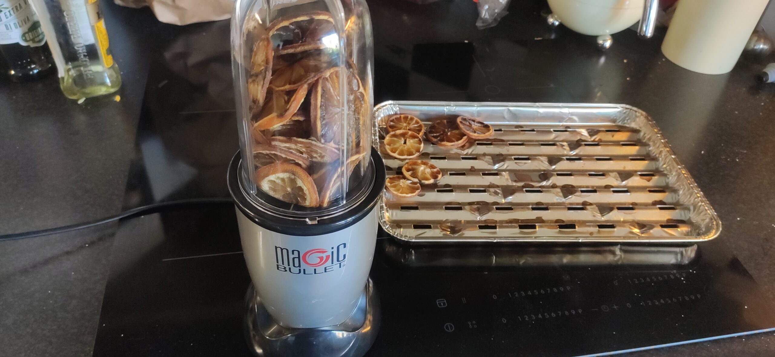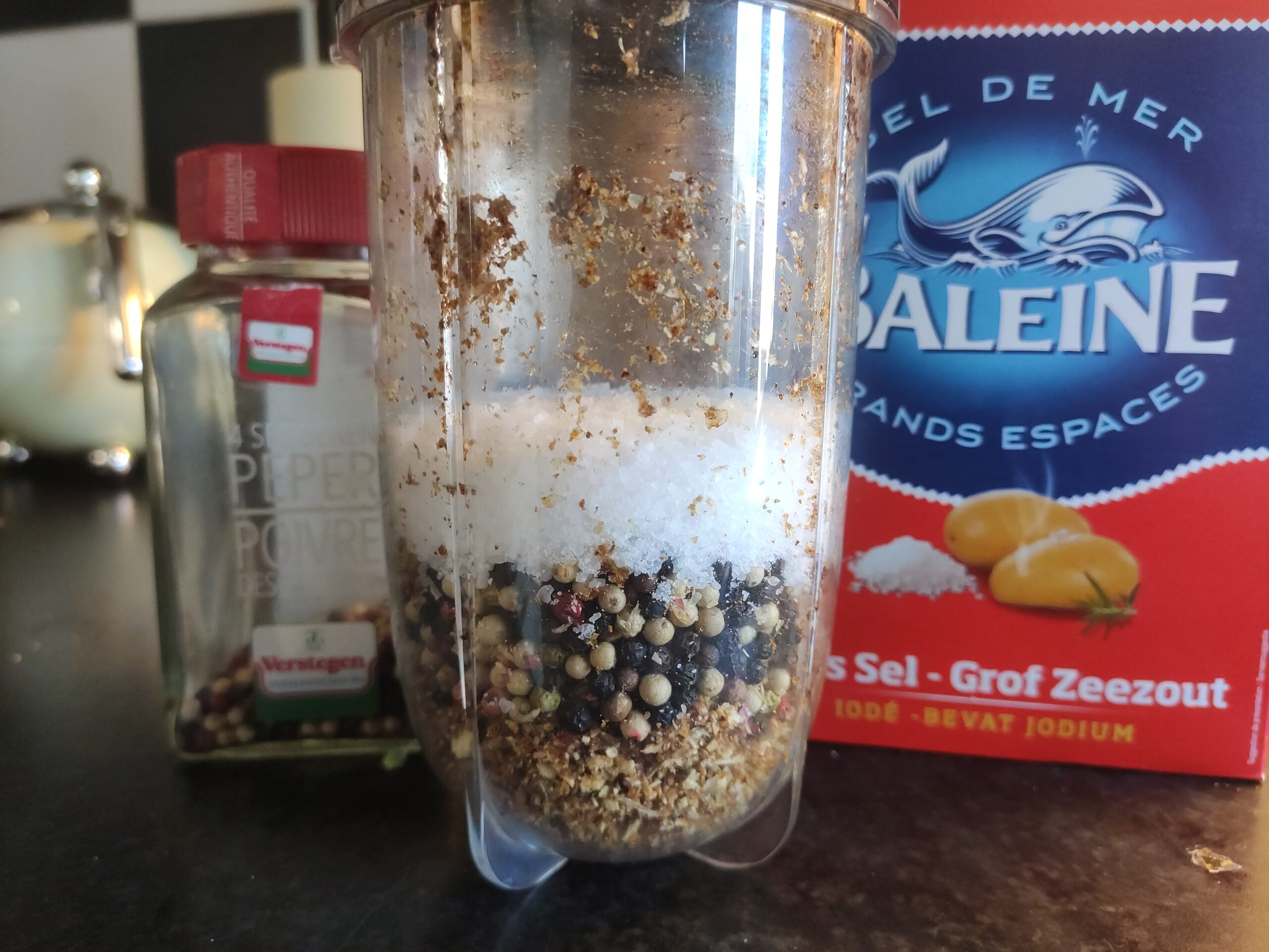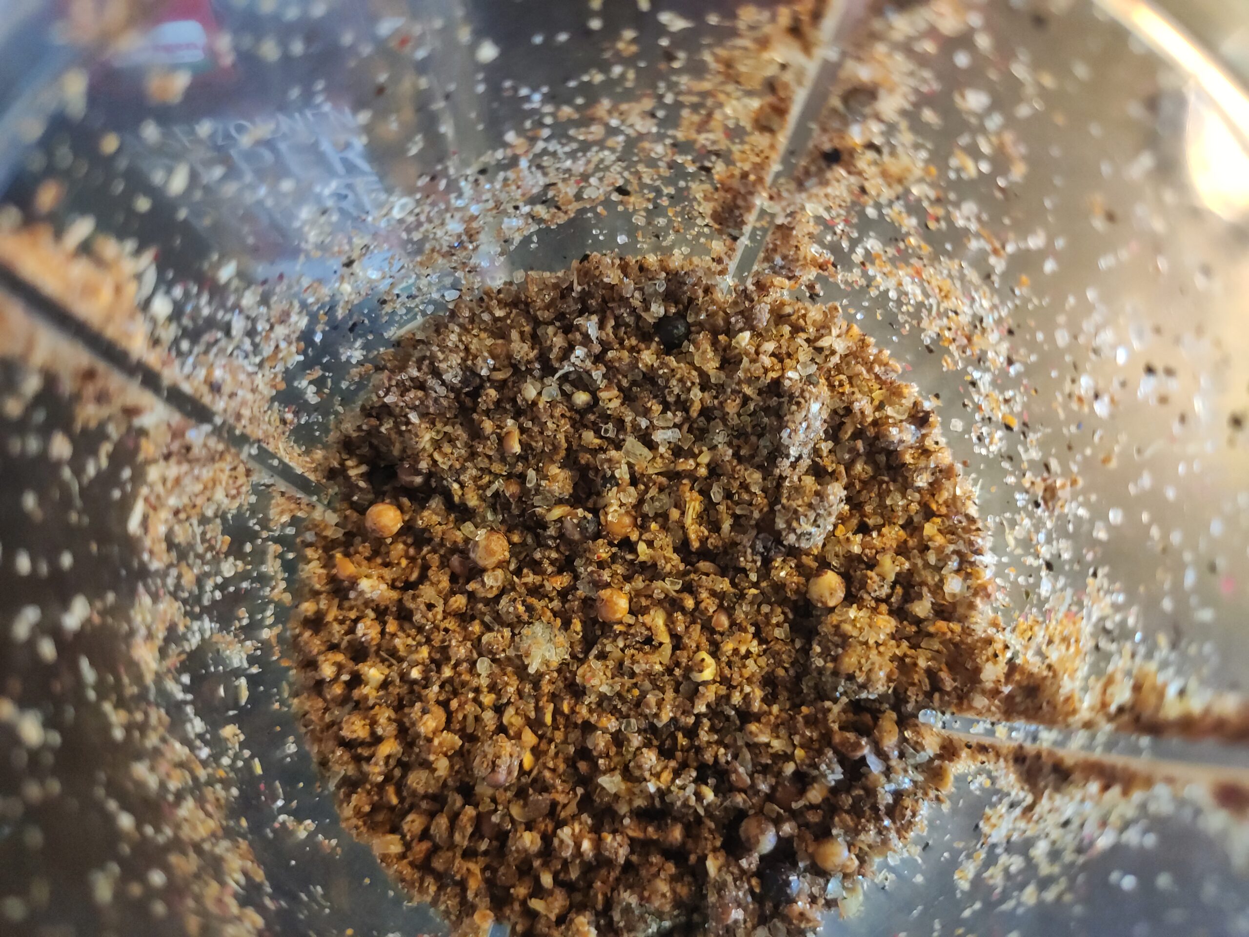 After 2 to 3 hours, the slices are nicely browned and caramelized, and the smell is amazing. It is almost impossible to avoid burning a few lemons, so make sure to remove the burnt slices. Once the lemons are dry (slightly sticky/soft is okay) and smoked, it is time to make the rub. For the rub, Gijs grinds the successful lemon slices and adds half a part pepper and a quarter part salt. Everything is ground into an even rub. So the rub ratio is: