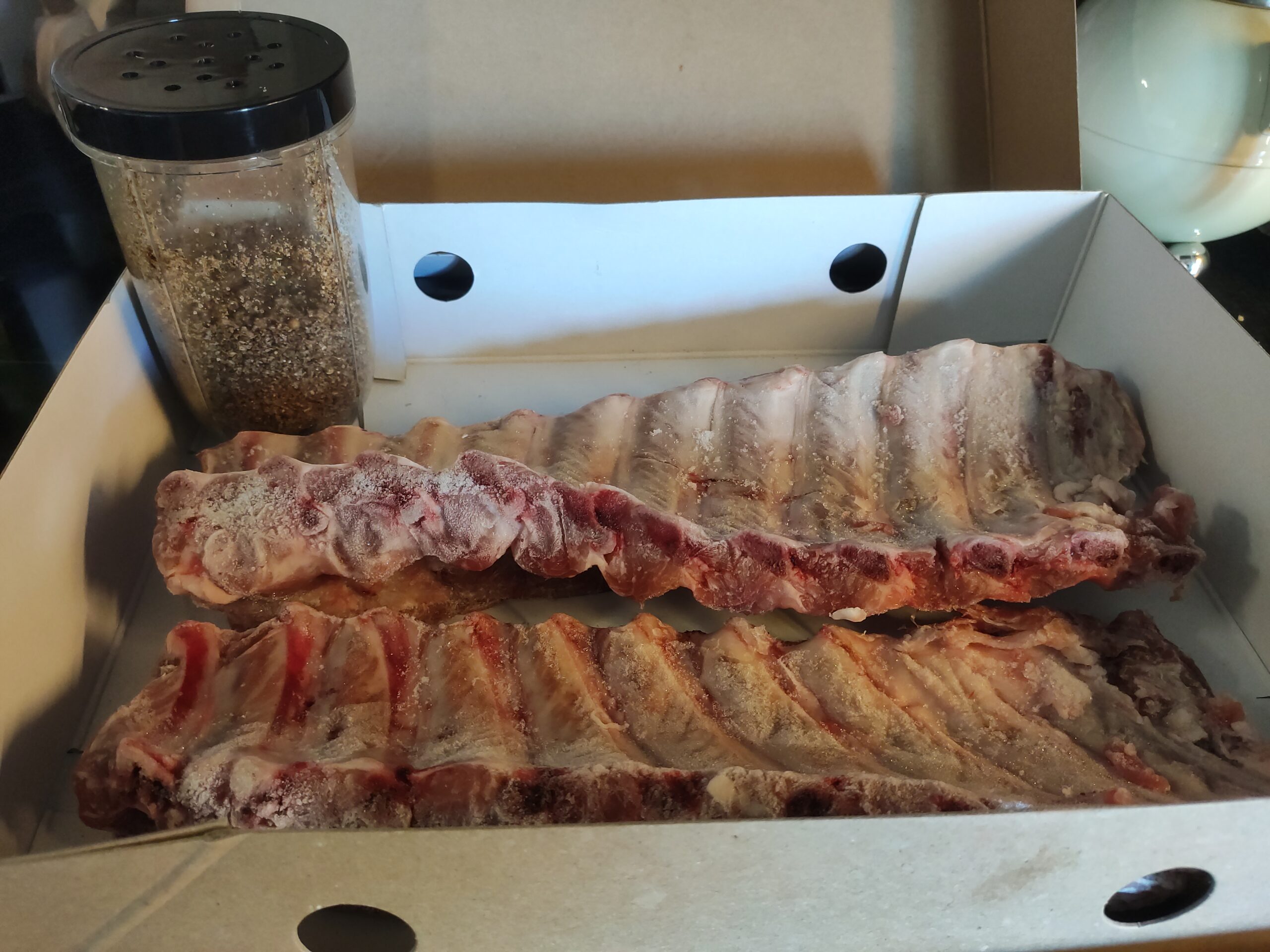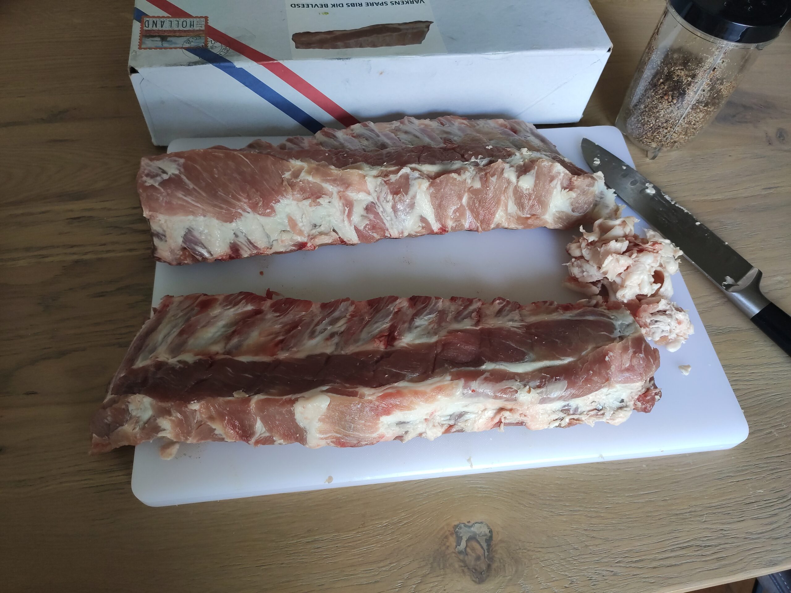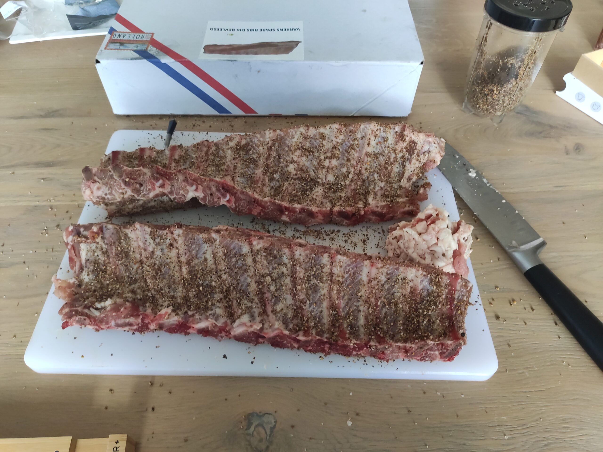 Finally, it is time for the spare ribs. As always, remove the silverskin from the ribs, it is a tough membrane that is not pleasant to eat. It is also a good idea to trim the meat where needed. Gijs is not a fan of fatty bits, so he removes larger pieces of fat from the ribs. After that, he coats the ribs generously with the new rub. This rub does not keep long because of leftover moisture in the lemon, so there is no reason to be stingy.