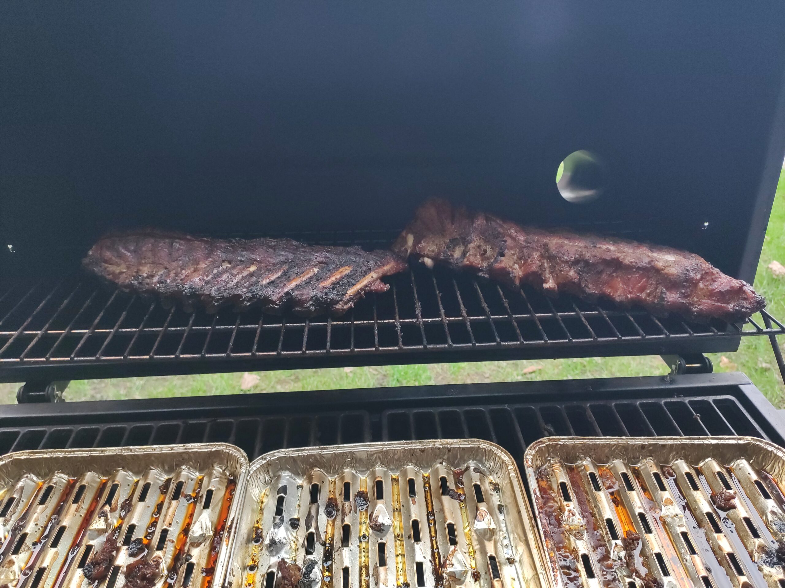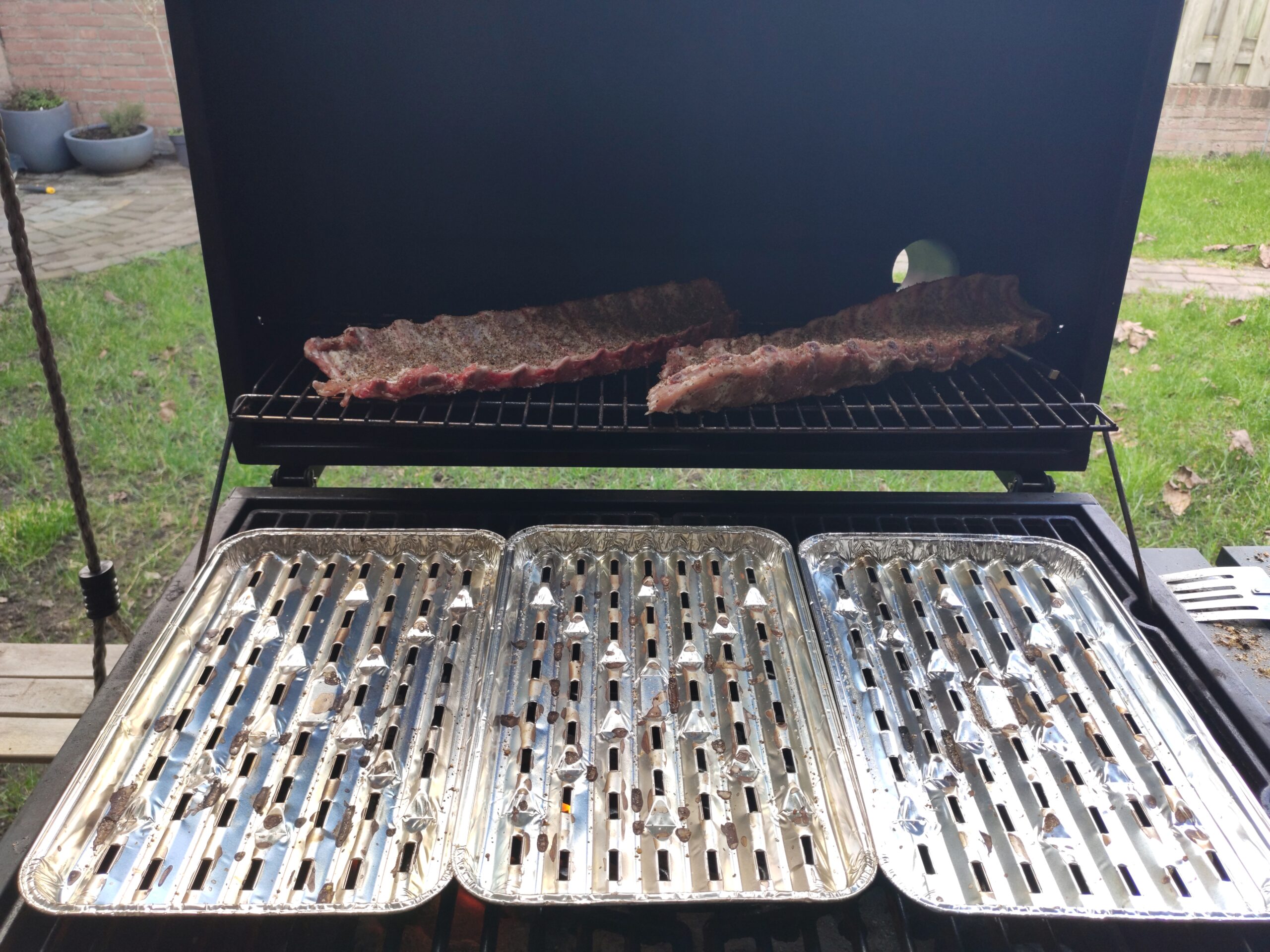Once coated, the ribs go on the barbecue. Gijs first smokes them for 2 hours at 130°C with mild apple smoke, then cooks them for another 2 hours in aluminum foil. That second step is important for keeping moisture in the ribs and preventing them from drying out. This is also done at 130°C. Finally, he leaves the ribs on the barbecue without foil for another 15 to 20 minutes to create a nice dry crust.