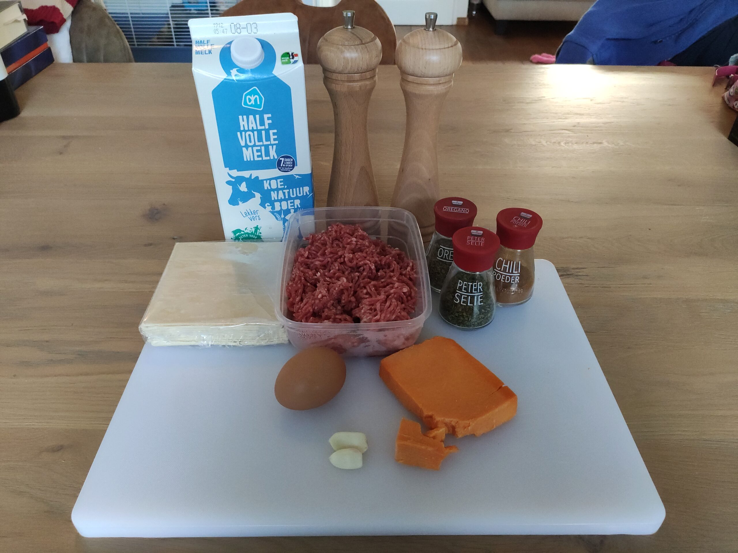 To start, Gijs beats the egg, grates the Parmesan, and finely chops the garlic. He sets half of the egg aside for later, and mixes the other half with the ground meat, milk, garlic, and the remaining ingredients. He kneads everything into a smooth mixture for nice, consistent sausage rolls.