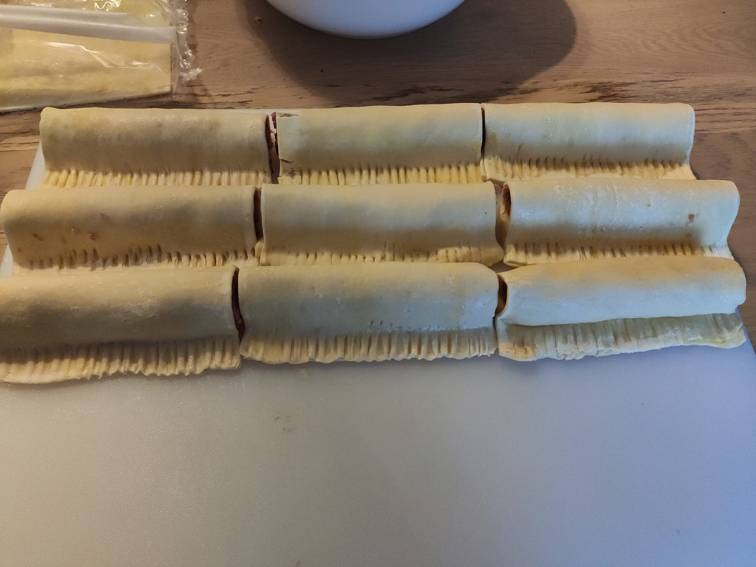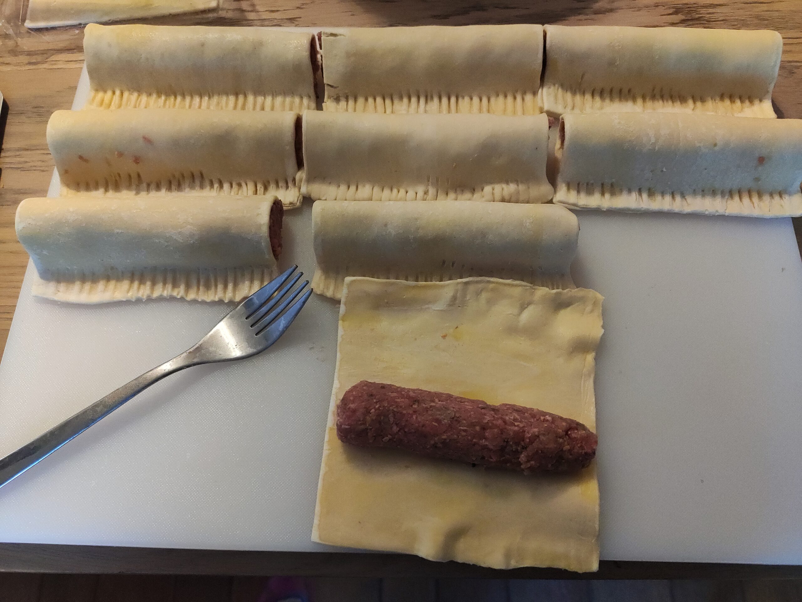 While the barbecue warms up, Gijs assembles the sausage rolls. He forms the meat mixture into a sausage about ±2 cm thick, cuts it into pieces, and rolls each piece in puff pastry. To prevent the pastry from tearing, he presses the edges down with a fork. You can also cut the rolls into smaller pieces to serve as party snacks. For a nice shine, Gijs brushes the rolls with the remaining egg.