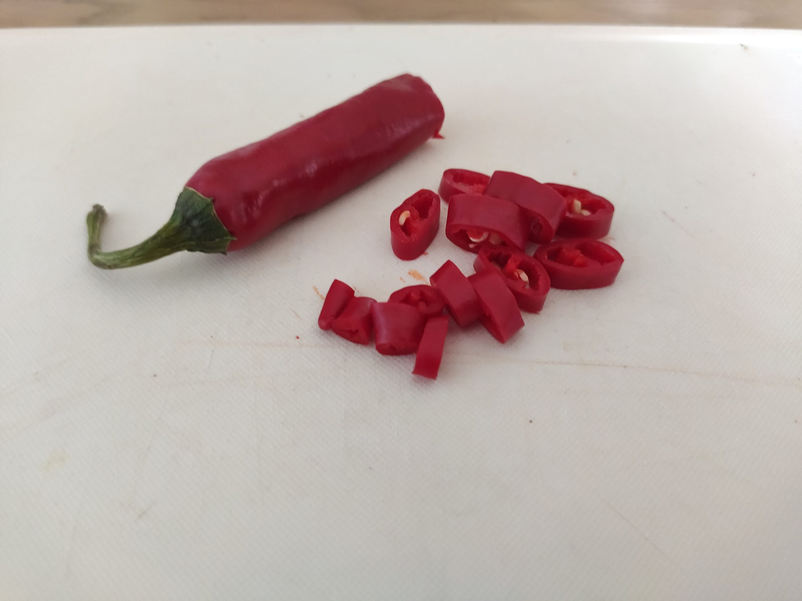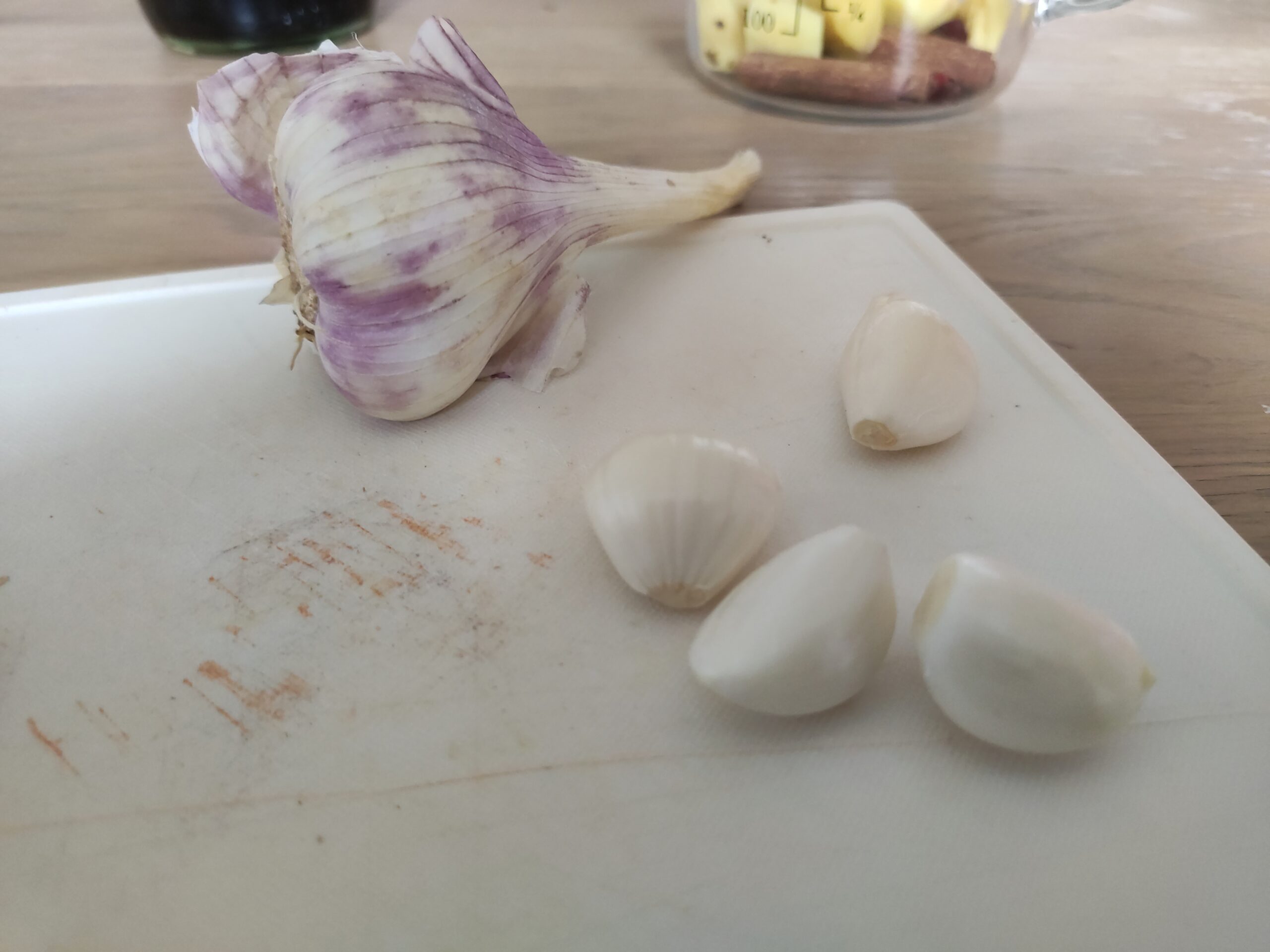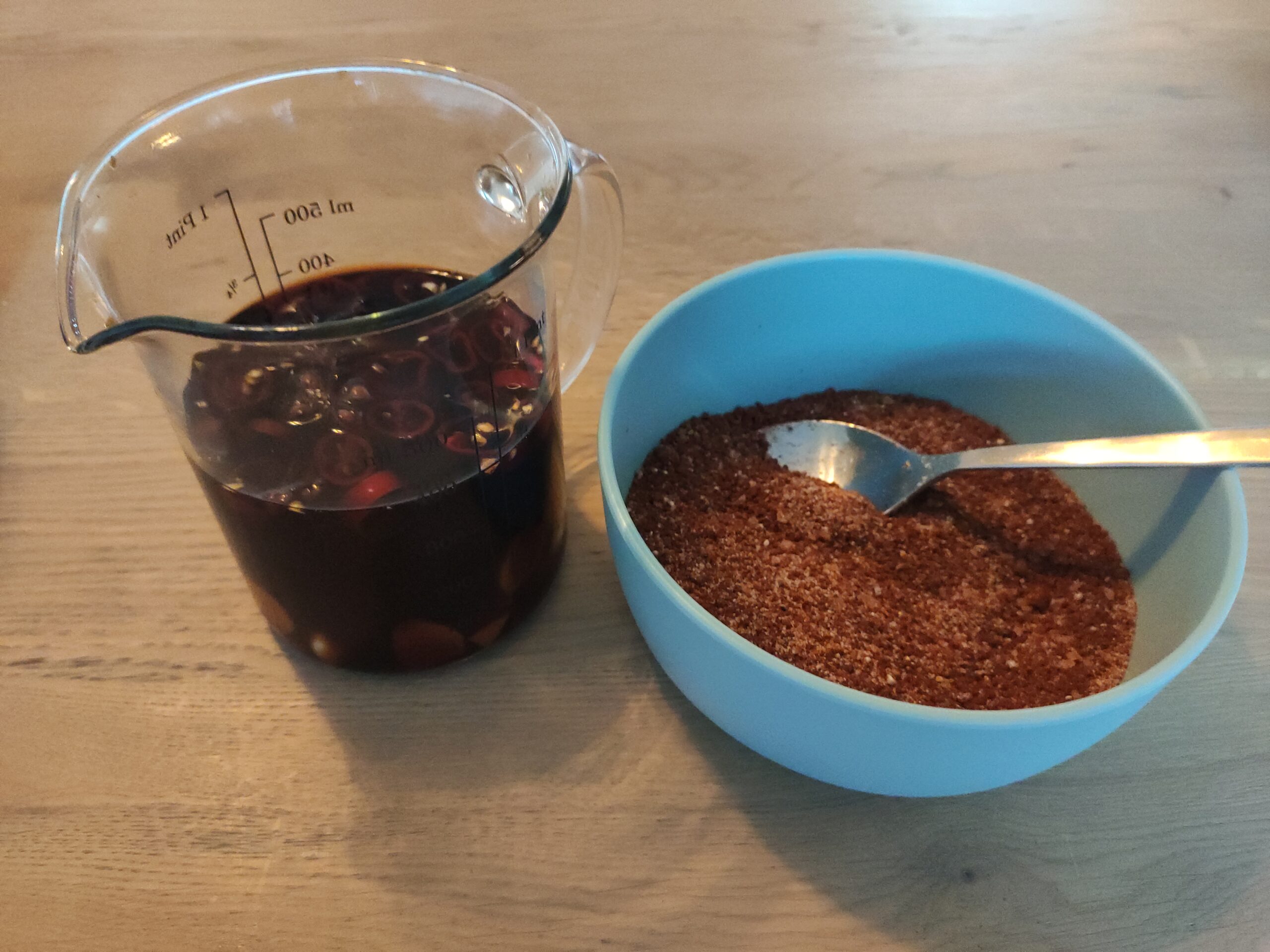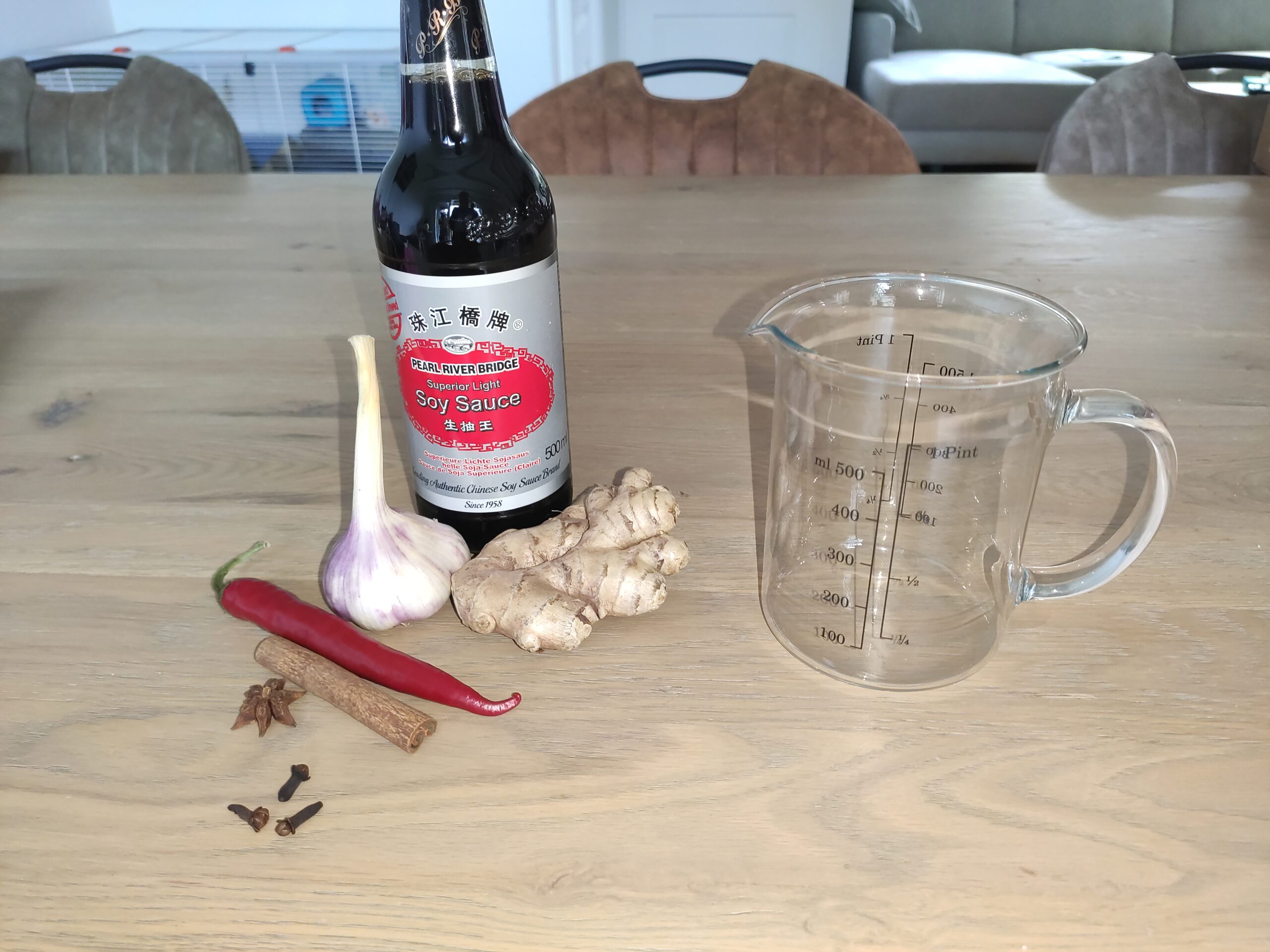 Once the meat is prepped, it is time to make the marinade and rub. Gijs starts with the marinade so the flavors get some time to blend. For the marinade, he slices half a red chili pepper into rings, then roughly chops a piece of ginger and 4 garlic cloves. These go into a container with 1 star anise, 1 cinnamon stick, and 3 cloves. Then Gijs adds 100 ml soy sauce, 150 ml ketjap manis, and 75 ml apple vinegar.