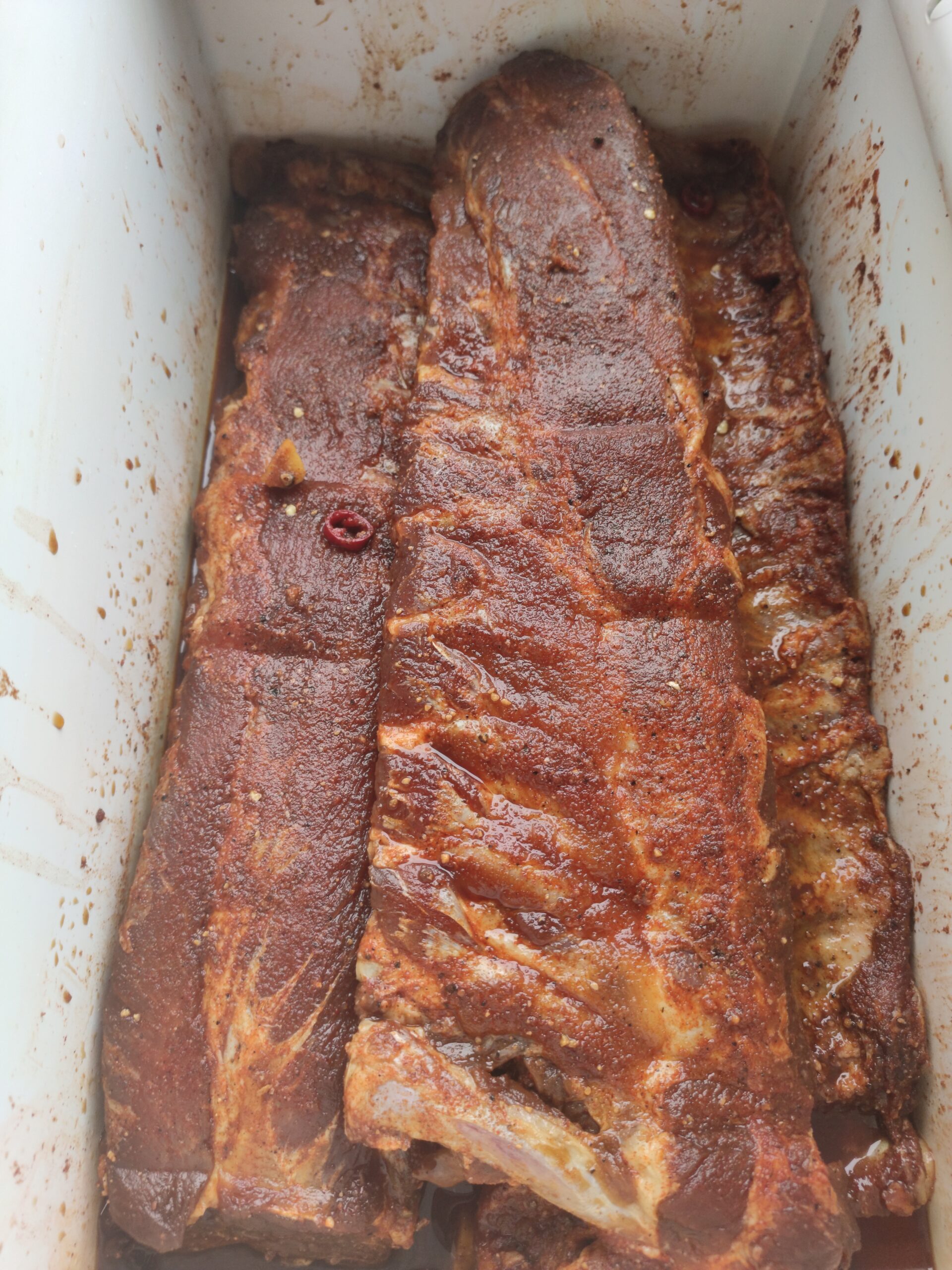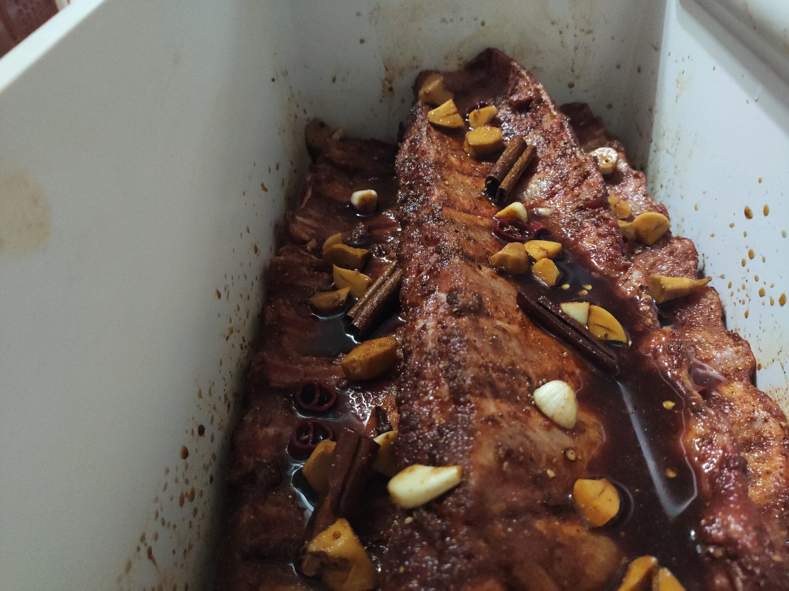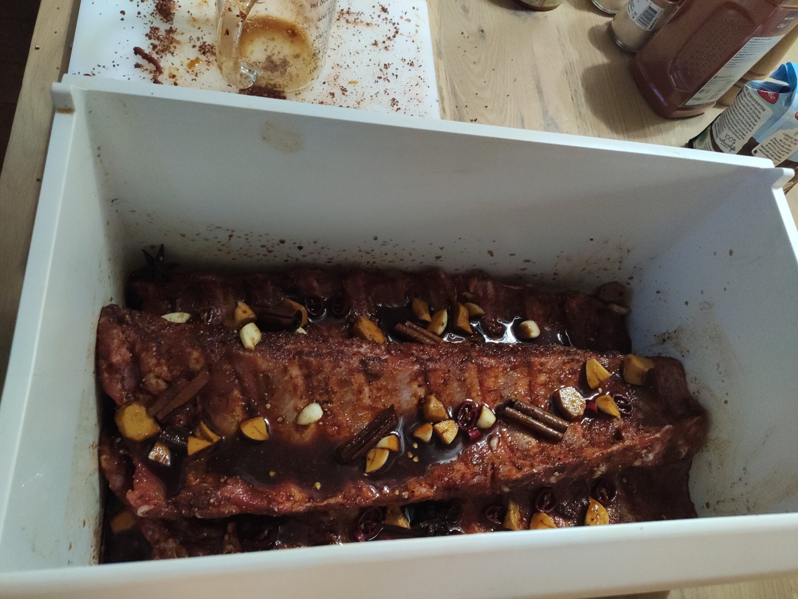 Now it is time to marinate the ribs. Use a large container so the ribs fit in one piece. If you do not have a suitable container, get creative: for this step, Gijs used a freezer drawer after washing it thoroughly. Place the ribs in one by one and coat them all around in the marinade. Once fully covered, they can go into the fridge overnight.