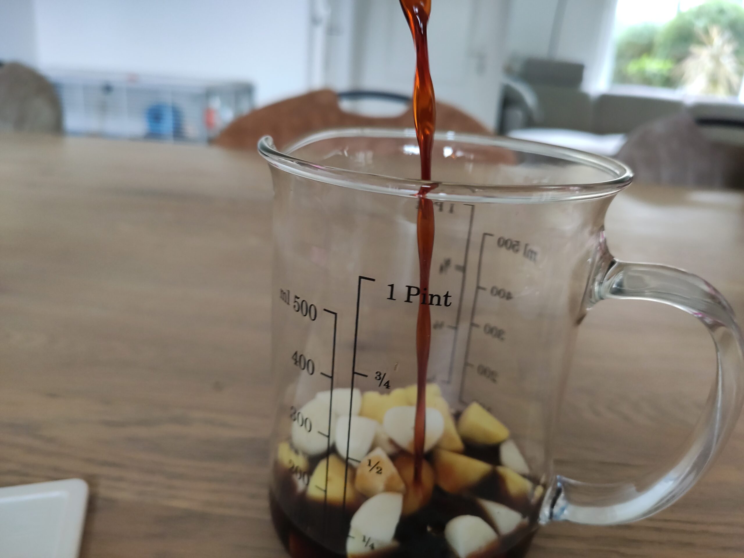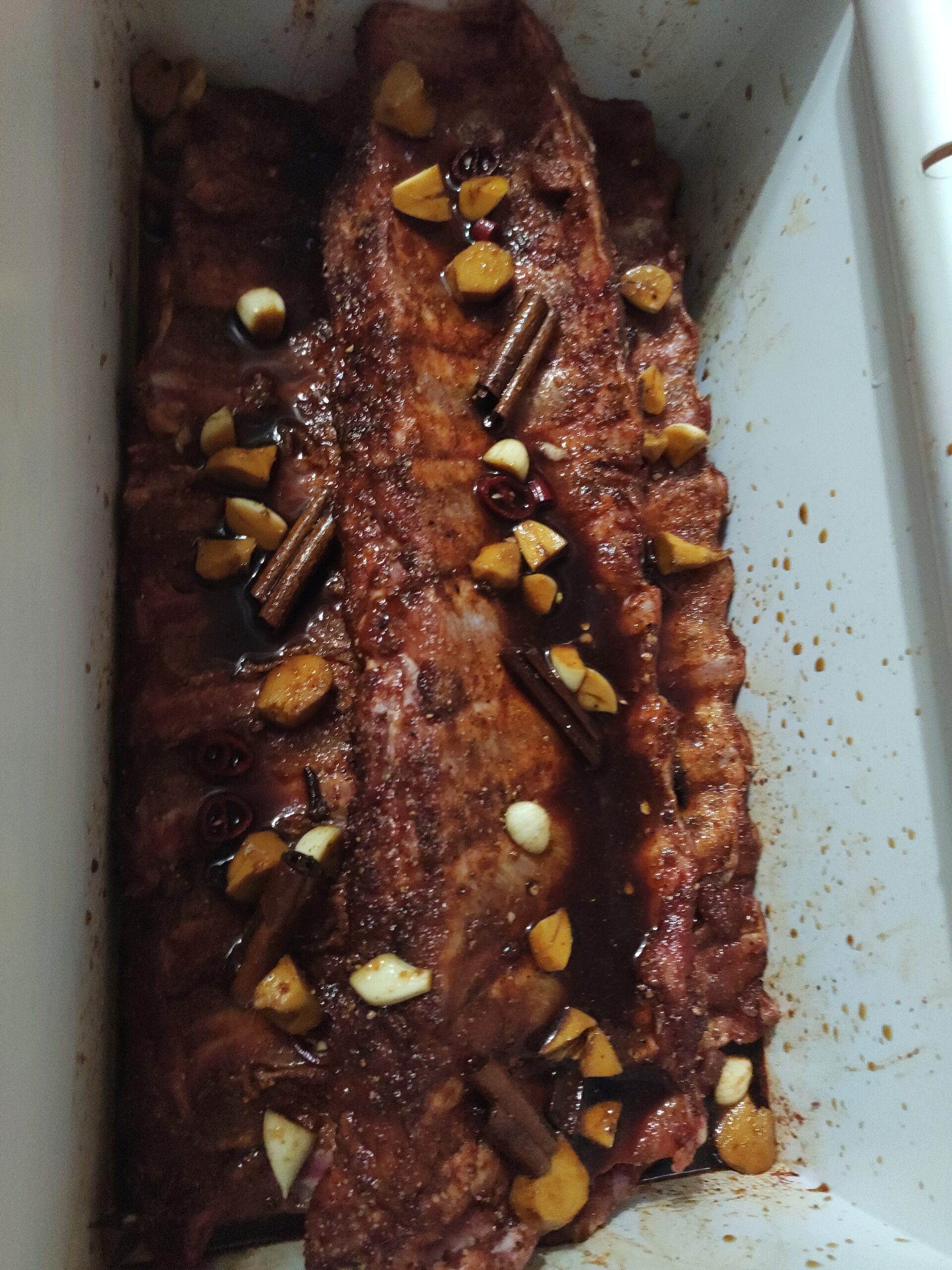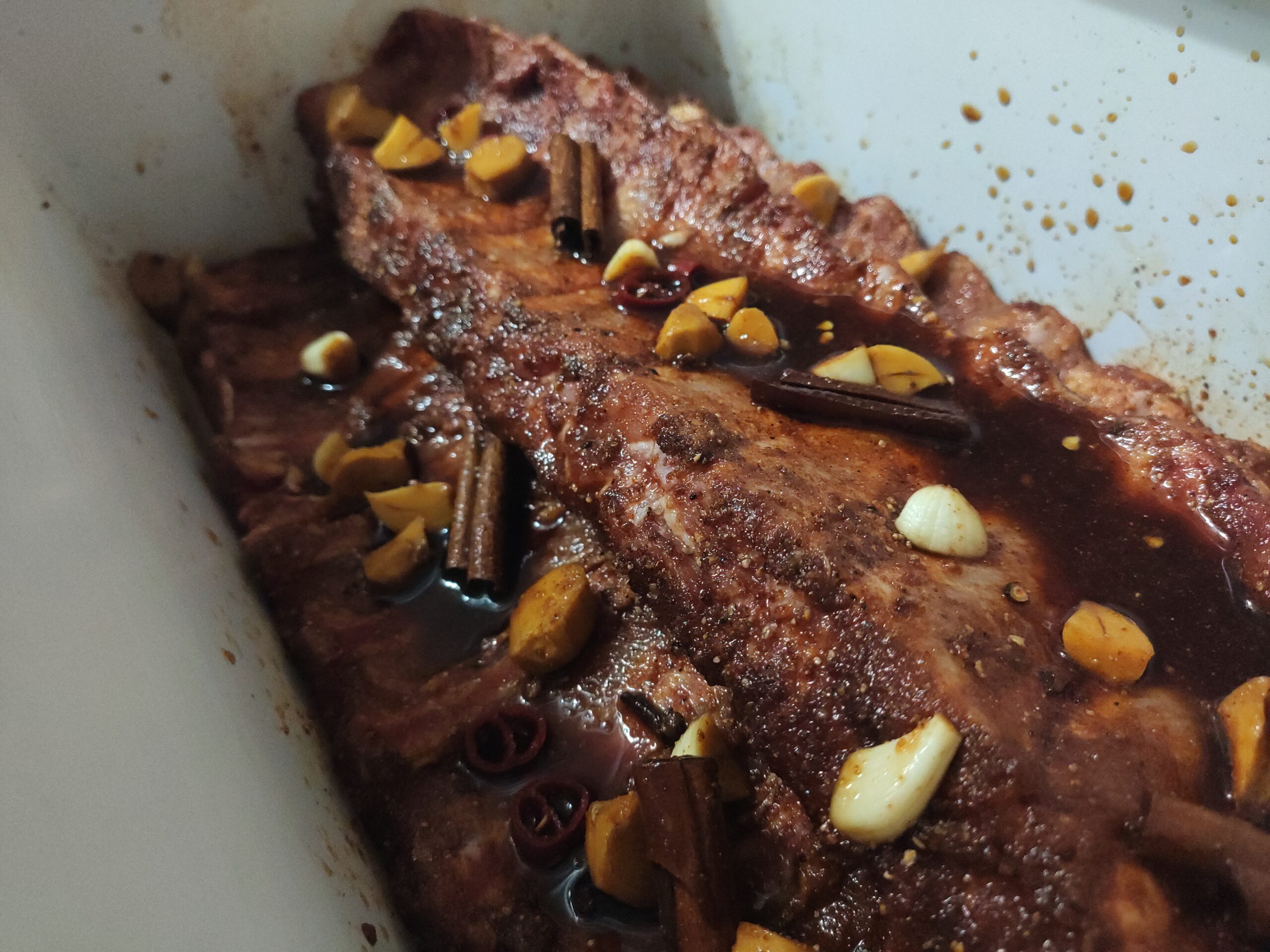 Now it is time to marinate the ribs. Use a large container so the ribs fit in one piece. If you do not have a suitable container, get creative: for this step, Gijs used a freezer drawer after washing it thoroughly. Place the ribs in one by one and coat them all around in the marinade. Once fully covered, they can go into the fridge overnight.