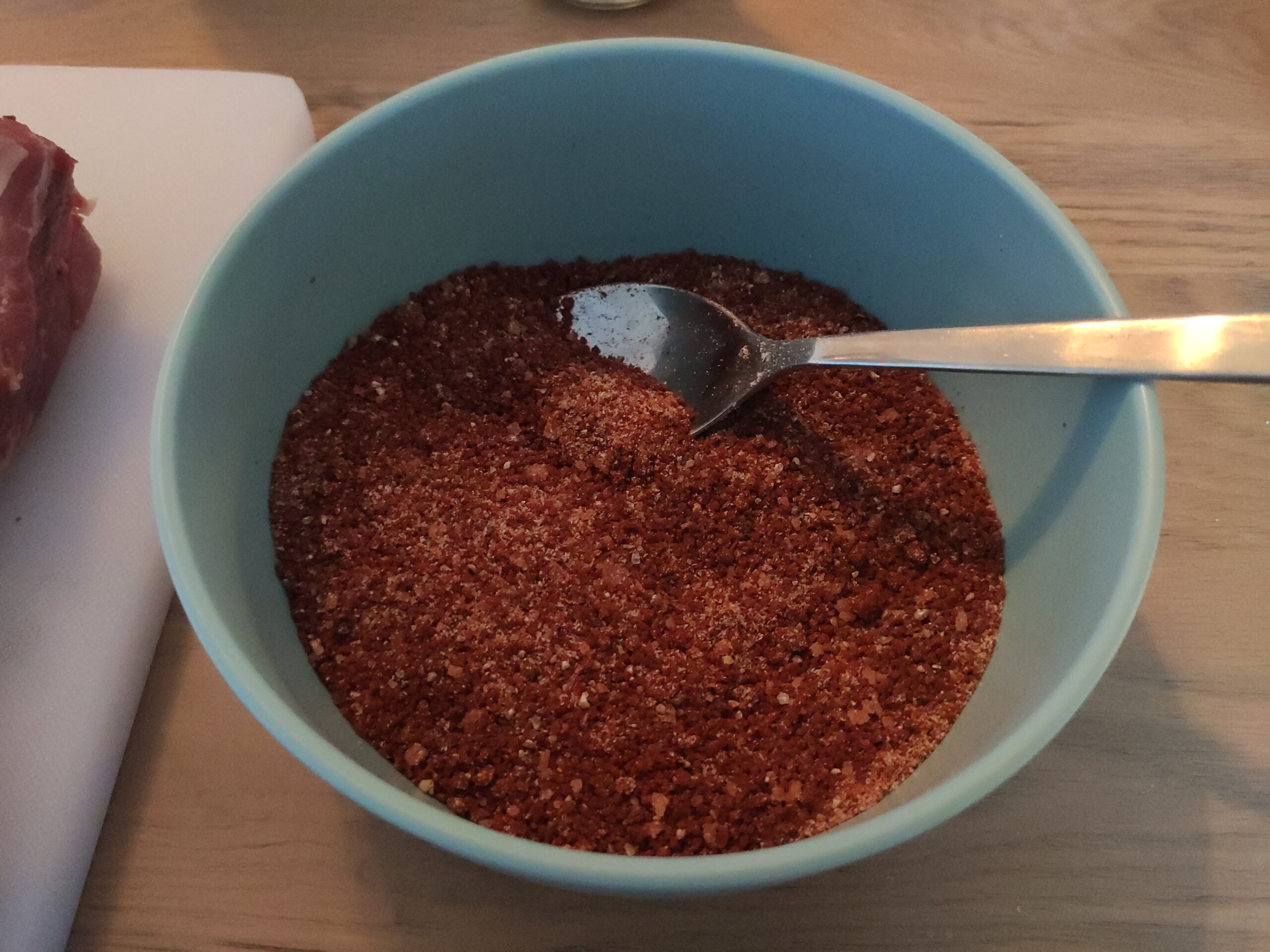 Next is the rub. Because the ribs are also marinated and later mopped, Gijs keeps the rub simple. He makes it extra easy by blending everything in an electric coffee grinder, so he does not have to grind salt and pepper separately. Smart Gijs. Applying the rub does not have to be super exact, since some spices will dissolve or wash off in the marinade, but Gijs still makes sure not to forget the sides.