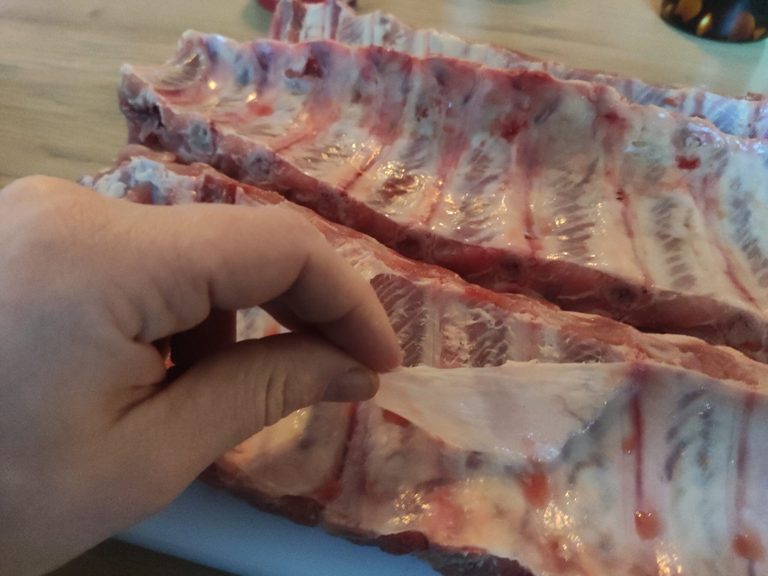Next, remove the membrane from the concave side of the ribs. Gijs uses a blunt knife to lift a starting edge, then pulls the whole membrane off in one go. He uses a piece of kitchen paper for extra grip. If your membrane does not come off in one piece, you can carefully cut it loose along the bone and remove it in sections.